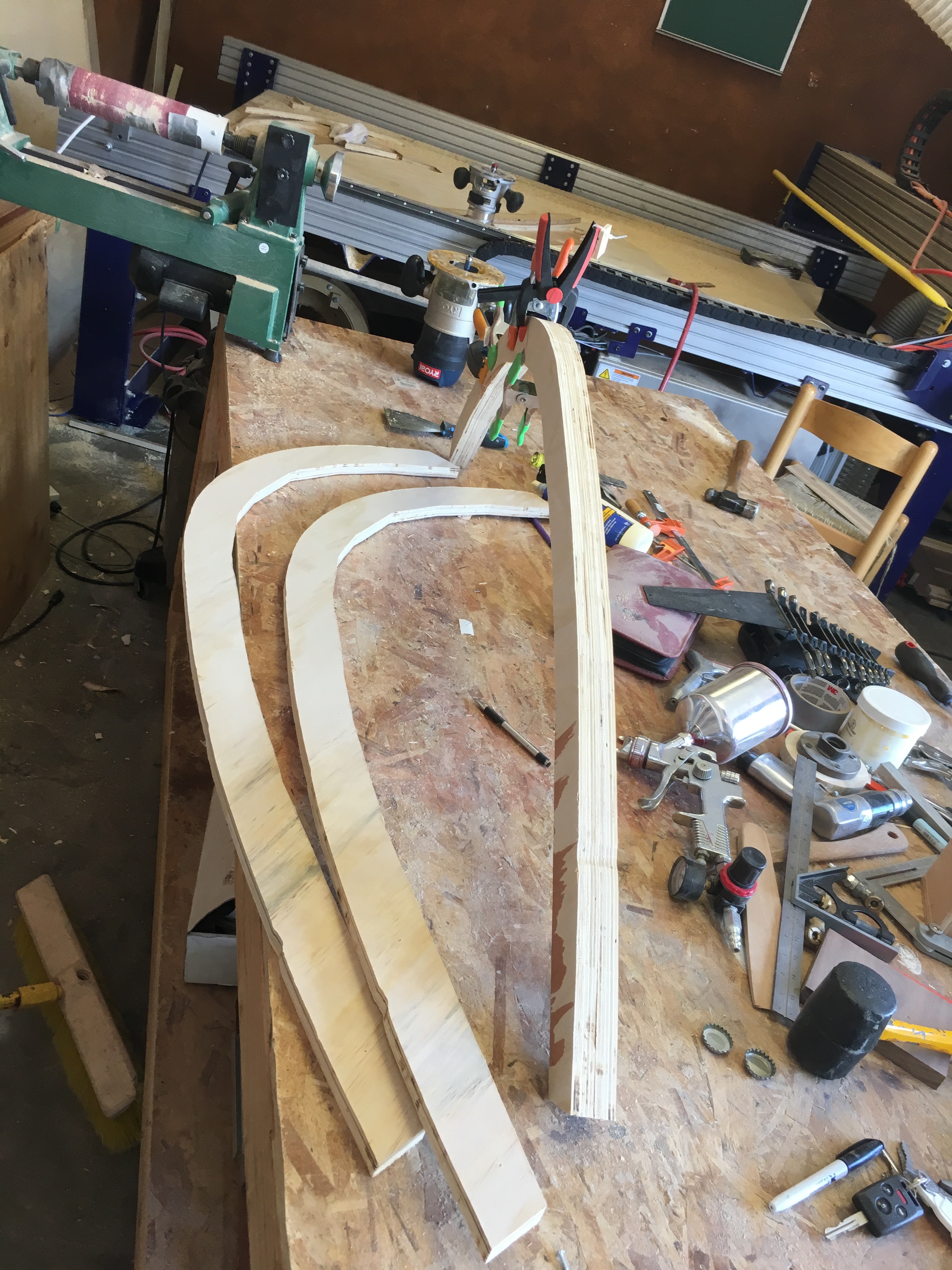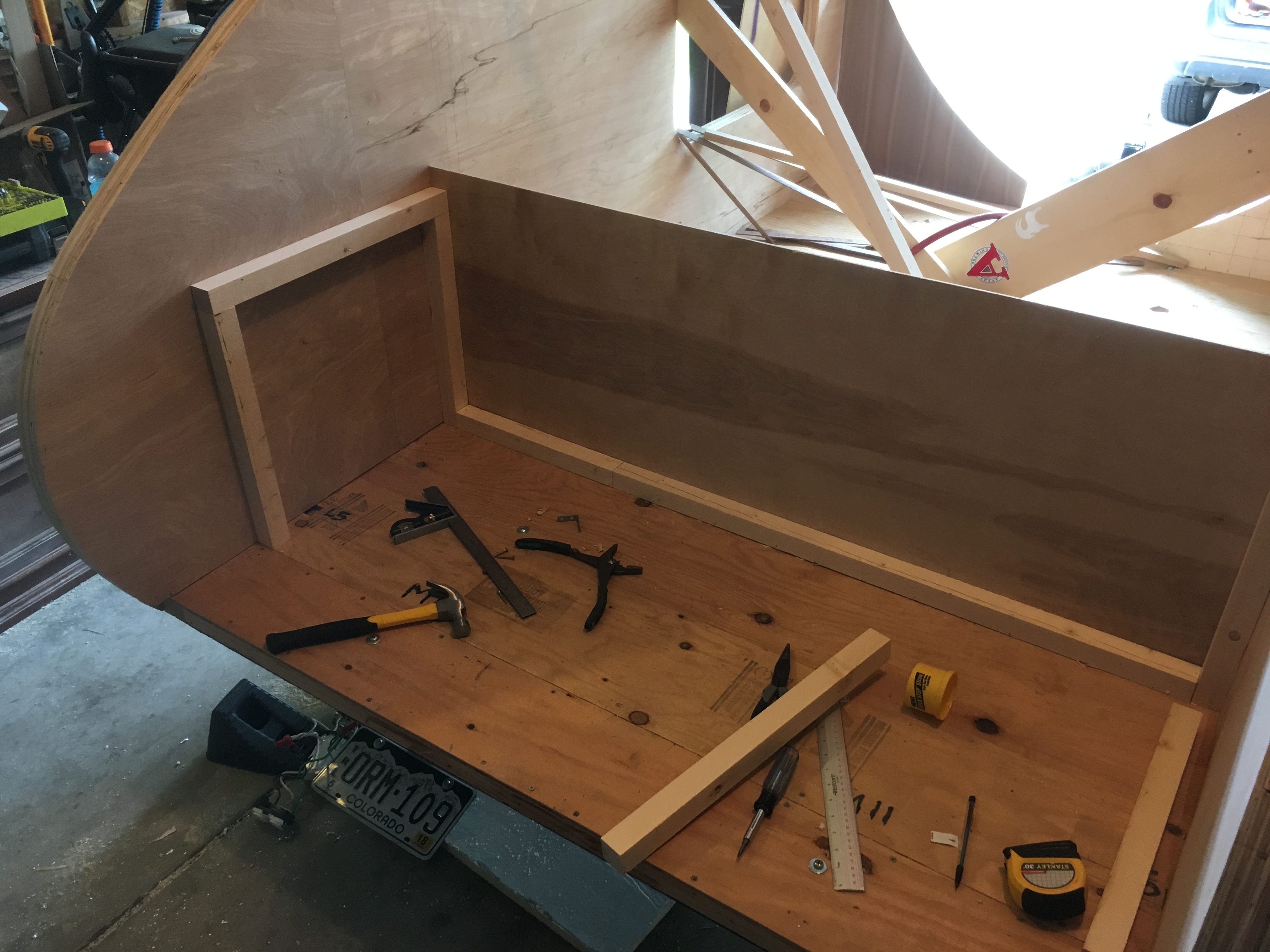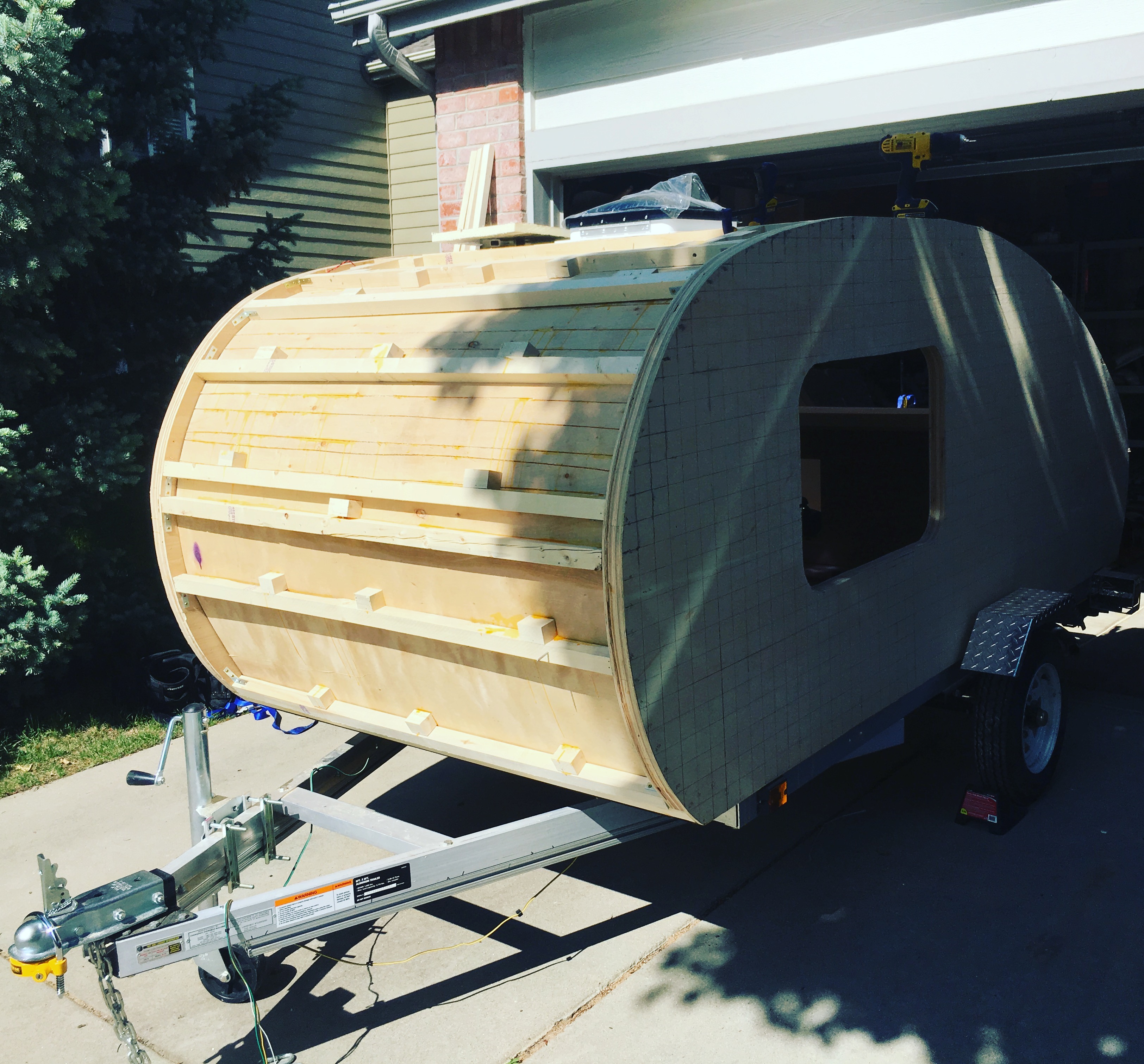 Lastly, you want to add the outer shell layer to the roof. This isn't nearly as hard as the interior roof shell because you have gravity and an already very rigid frame working in your favor. One thing you can do is take straps to pressure the plywood to conform to the shape of the teardrop. Again, if the wood isn't bending perfectly, you can moisten it with some water (pictured).