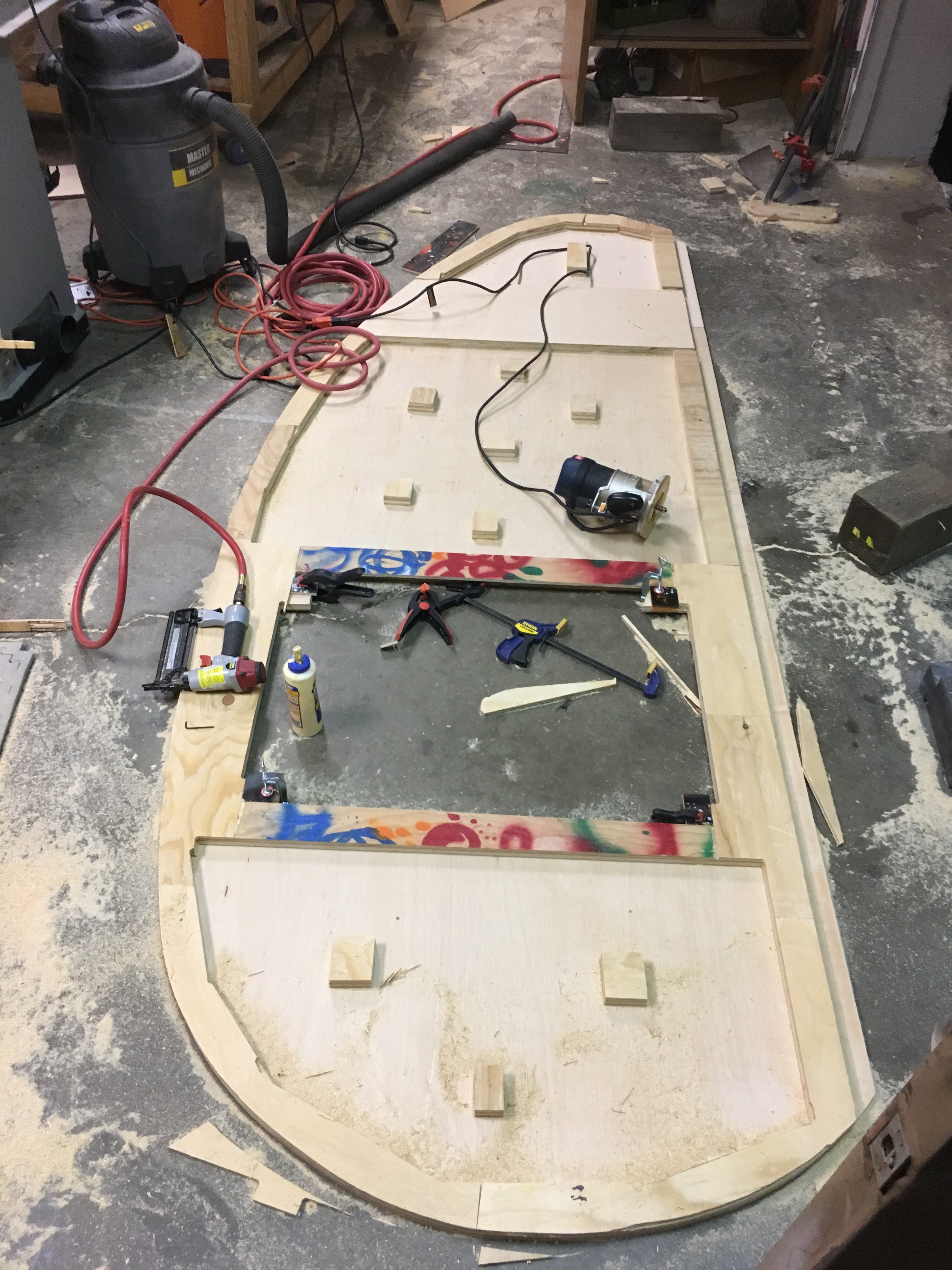 I lined up all of the pieces on top of the frame. Because the frame had all sorts of unevenness and bolts, I had to measure precisely where the bolts would stick out, so that I could reliefs into the wood frame base. I also employed a ton of washers to make sure all of the spacings were right.