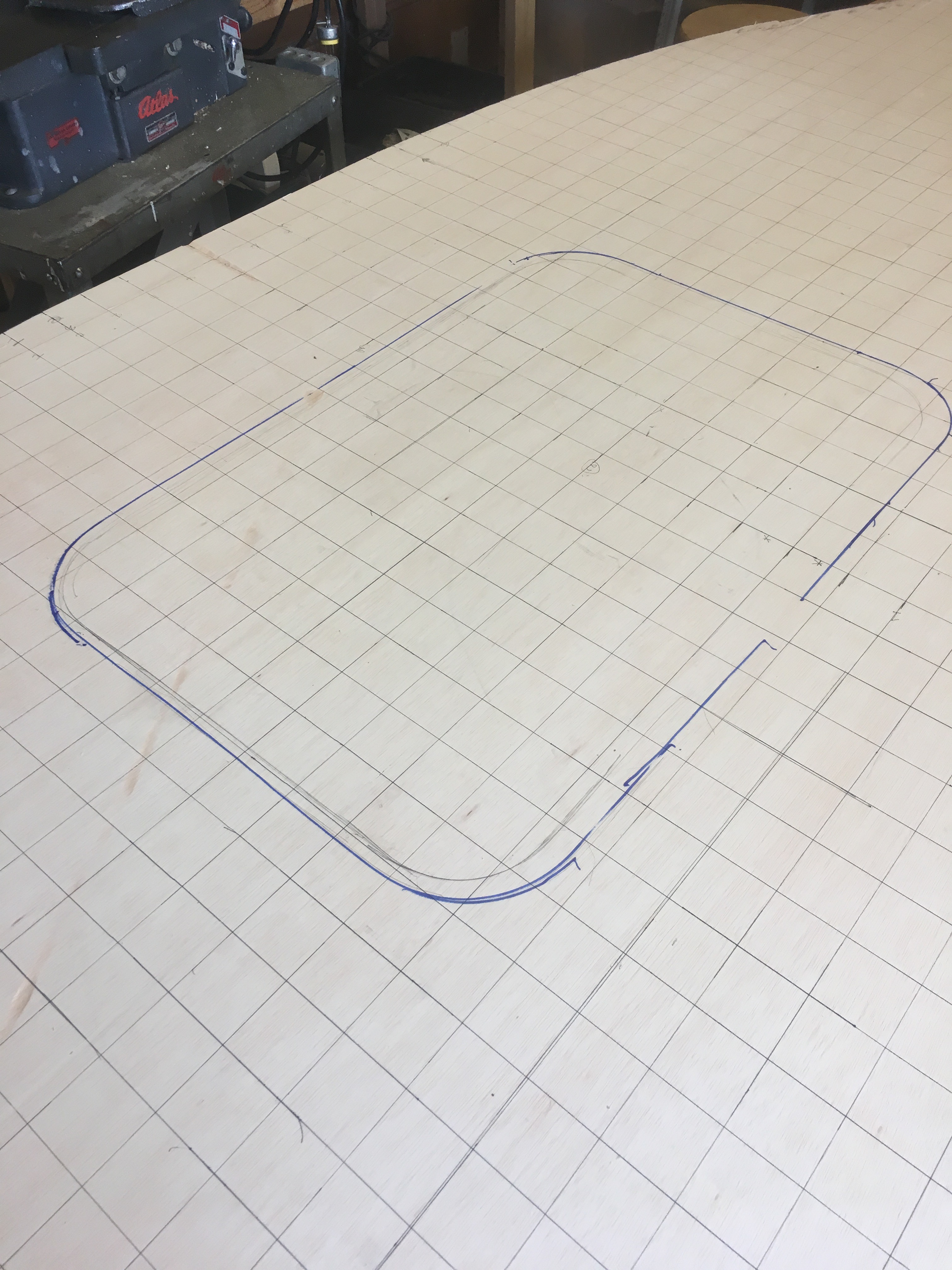 I drew a grid onto the panels to match the graphing paper grid lines on my scale sized sketches on graphing paper. My design is loosely based on the Wyoming Woody teardrop design kit (the SketchUp .skp file is available in the photo gallery or from this website).