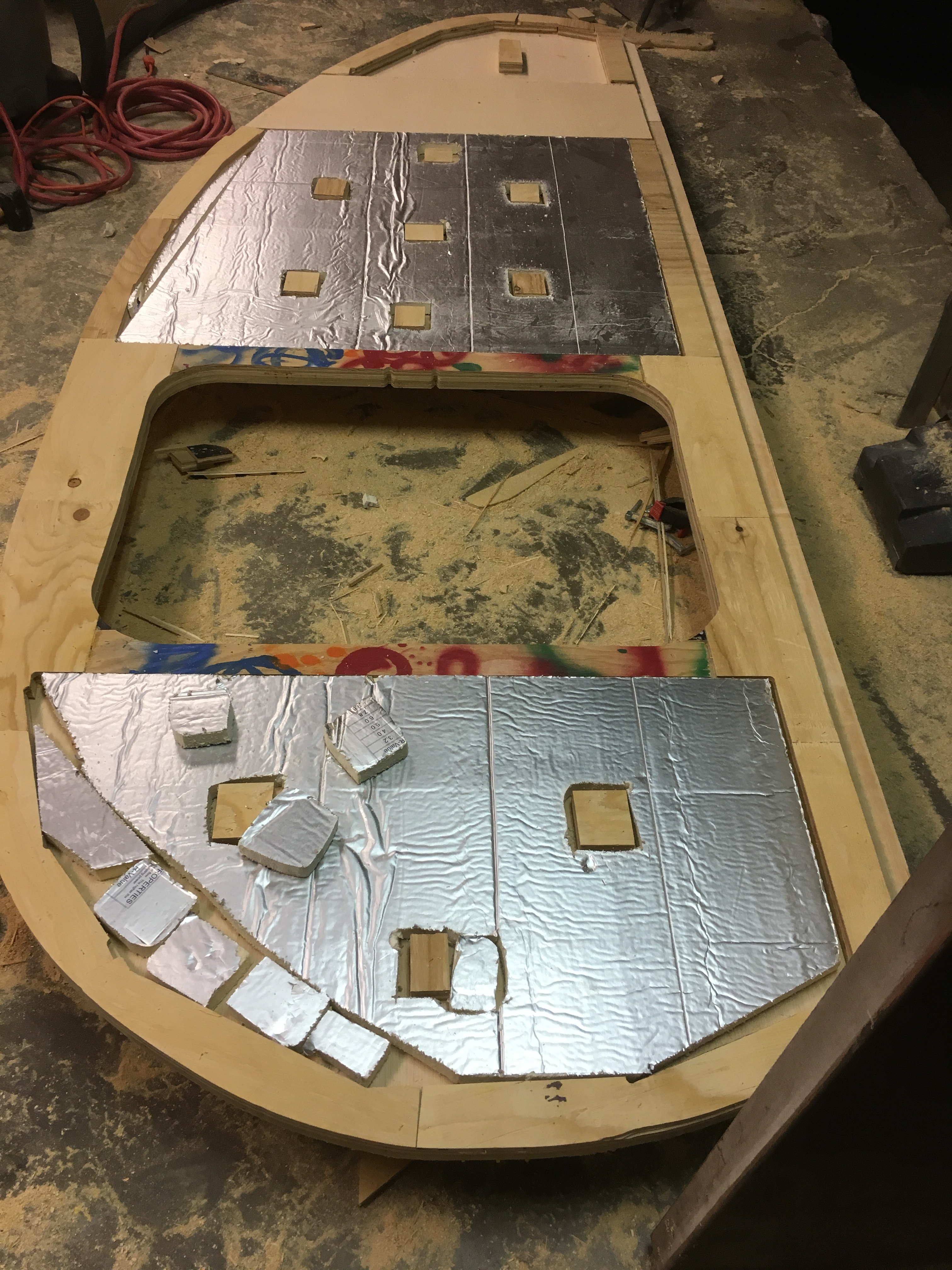 Next I cut up some insulation panels (R-6 value) and put it in the gaps of the underside wood base frame. The panels were affixed to the base with bolts and the gaps were filled with great stuff.