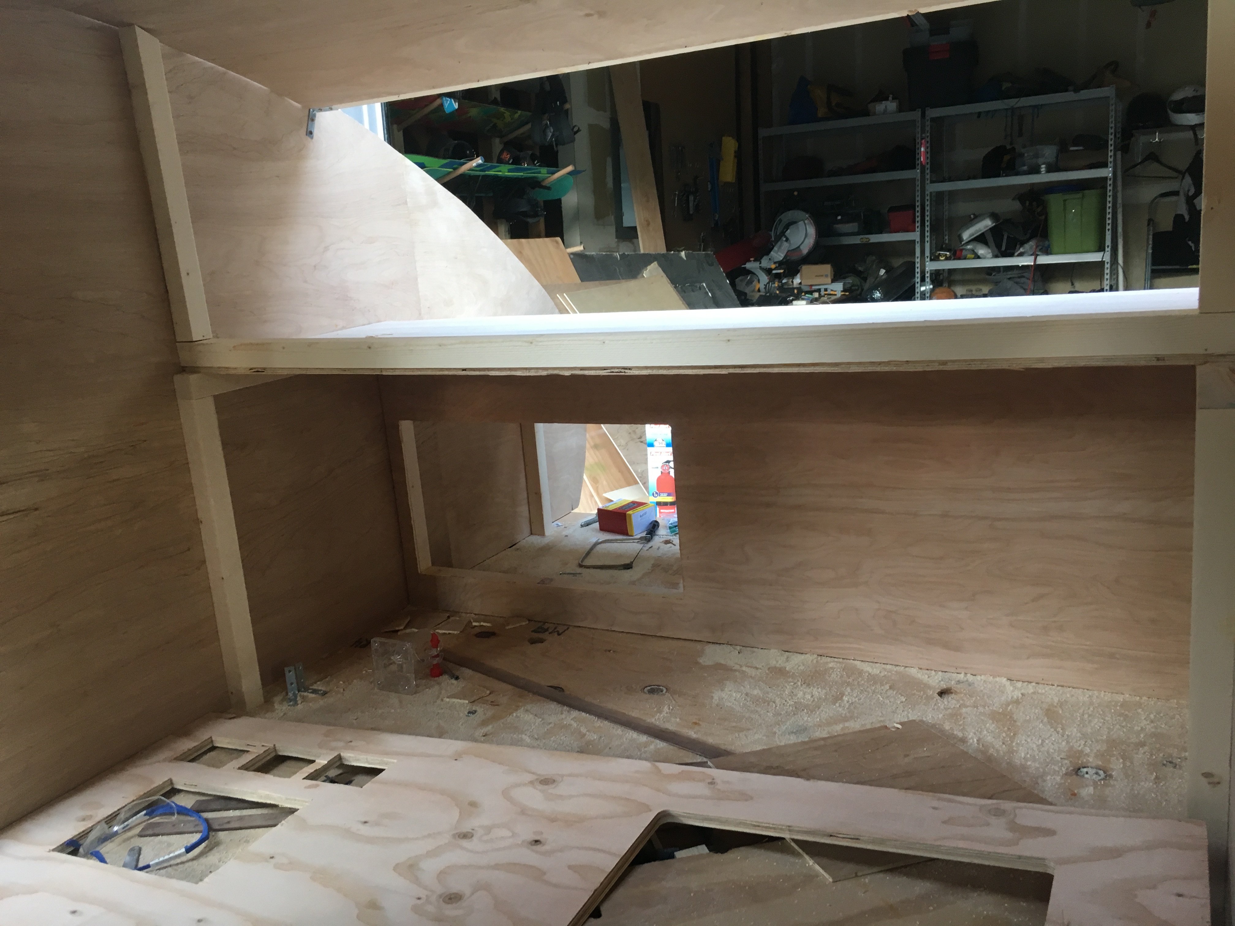 At this point, you take more of your insulation board and fill in all the gaps. Lastly, you take the opposite sanded plywood sidewall and make a lil sidewall sandwich with the insulation in the middle. The bottom part of the sidewall had an overhang that fit the platform bed (see image). I applied glue to this seam and screwed the sidewalls in tight (while someone helped hold it square with a large framing square). I reinforced this connection using large (six inch) metal L brackets to hold that 90 degree angle. As you can see in the pics, you may want to add temporary wood supports.