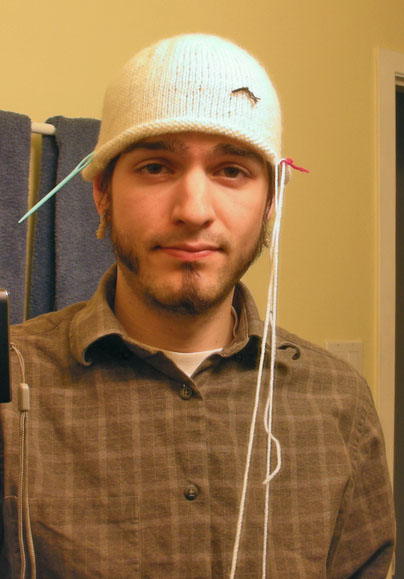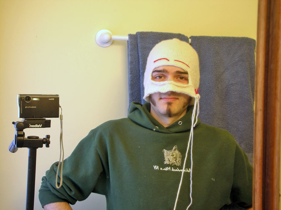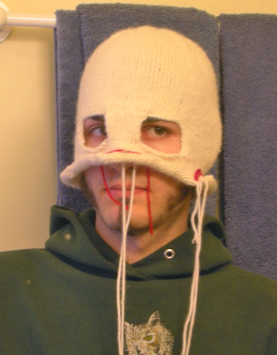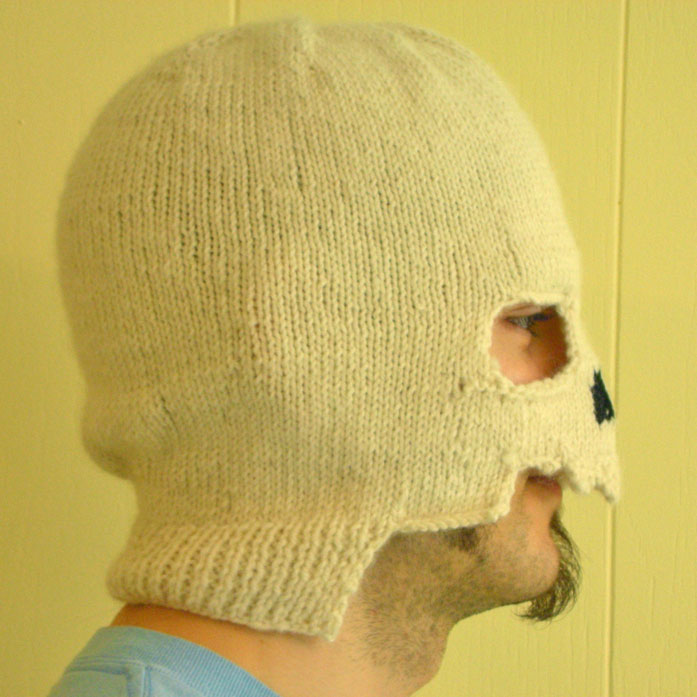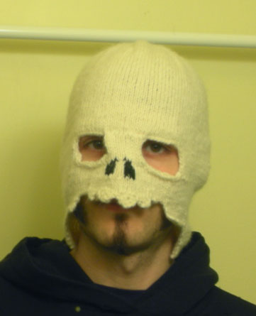 Ok, this one takes some background explanation. My friend introduced me to the work of Sido (read the wikipedia article [http://en.wikipedia.org/wiki/Sido_(rapper) here]). Sometime shortly after, I saw this incredibly clever beard-a-clava over at boing-boingboing-boing . The two influences ran together in my head like two silver rivers of creativity rushing towards the sea of craftiness. I had to make it: The skeleclava.