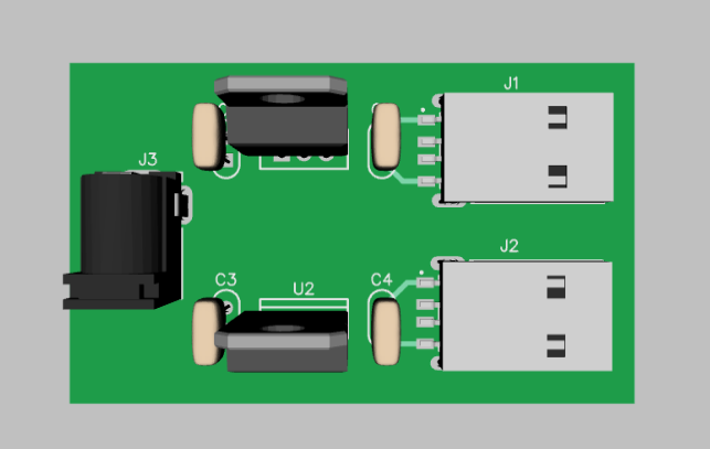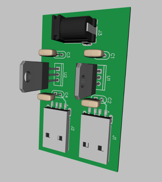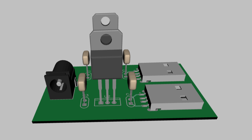 In the above circuit, I have used two sets of USB chargers. There is one common input power supply for both the sets of chargers. The tip of the DC power jack is the positive terminal. The sleeve must be connected to the negative terminal. Then connect the positive terminal to the positive terminals of the 470uF capacitors and the 7805 voltage regulators. The negative terminal of the power jack must be connected to the middle terminal of the voltage regulator. Couple capacitors of 1uF across the output terminals of the voltage regulator. The output of the voltage regulators must be connected to the input terminals of the female USB ports. Also solder two wires to a DC Male jack to it's respective male and female terminals. Finally, cut the perforated board to your desired size.