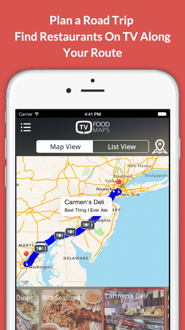 Hate flying? Planning on taking a road trip? One of the coolest features of TVFoodMaps is the ability to plan a road trip and find all the restaurants along the route. The main menu of both the website and mobile app have links to run the road trip tool.