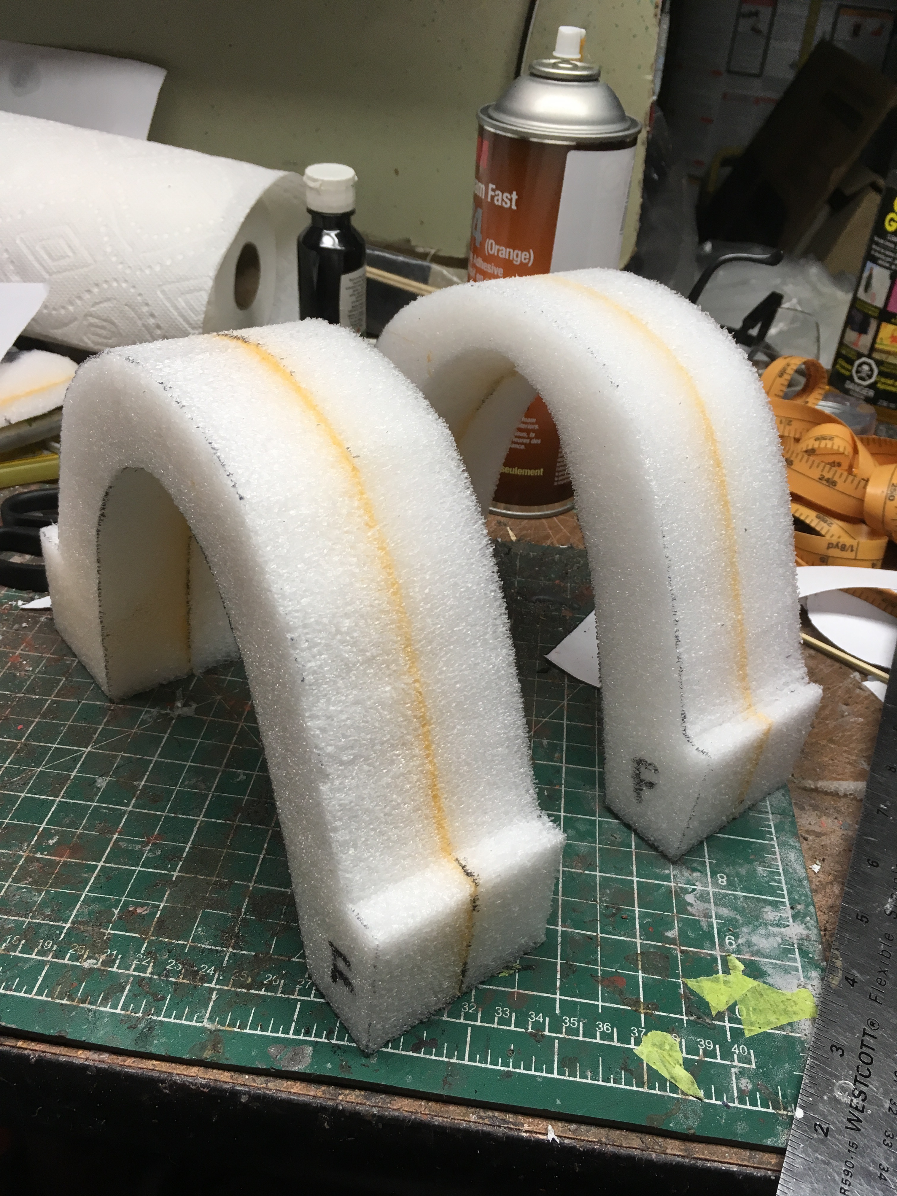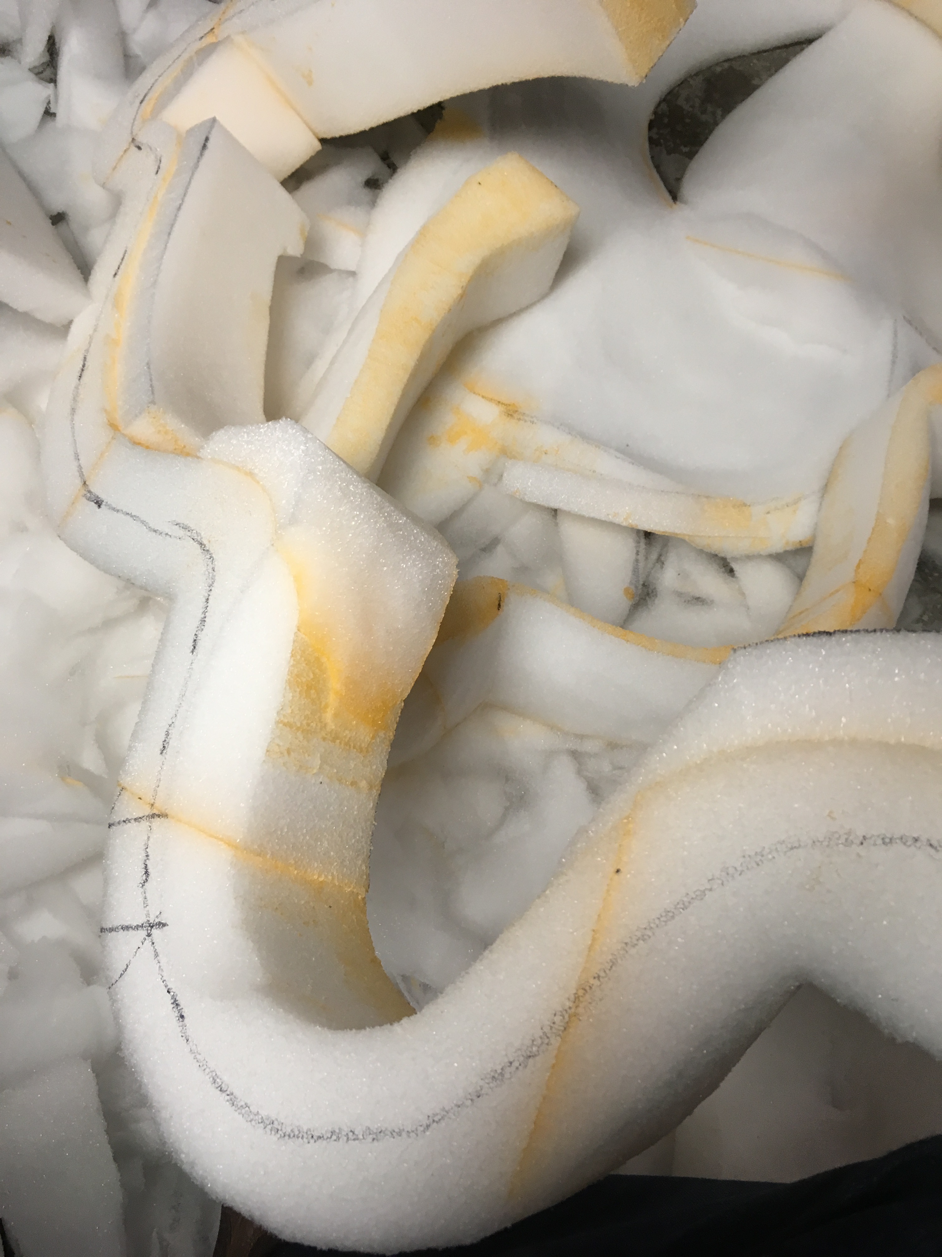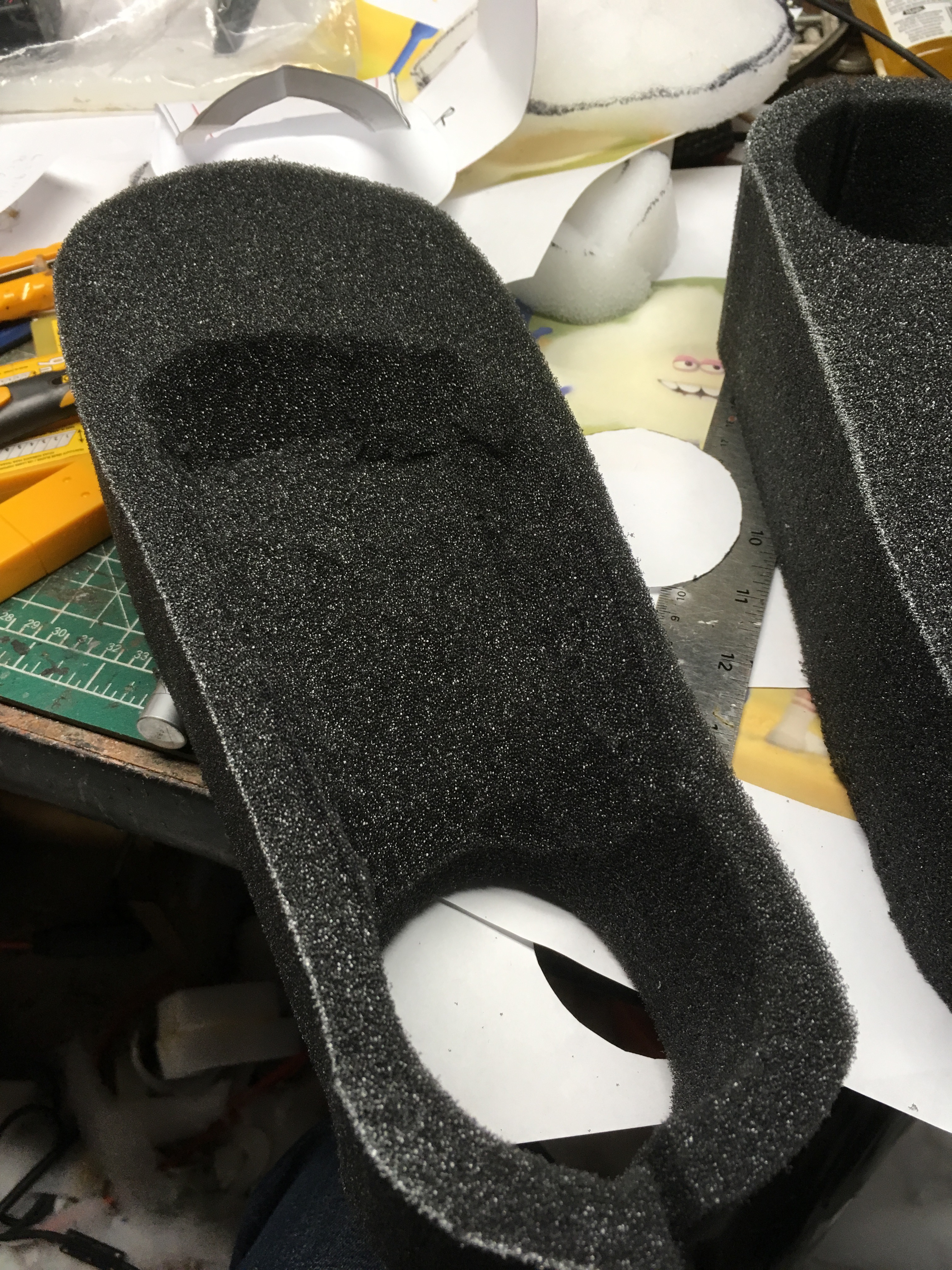 With that said, I needed 4 sheets of 4" foam to achieve the final depth. The cost of that amount of material can add up, so in order to be economical, I used scraps to create the 2 inner layers of the body and cut the outline shape, "pre-hollowed"