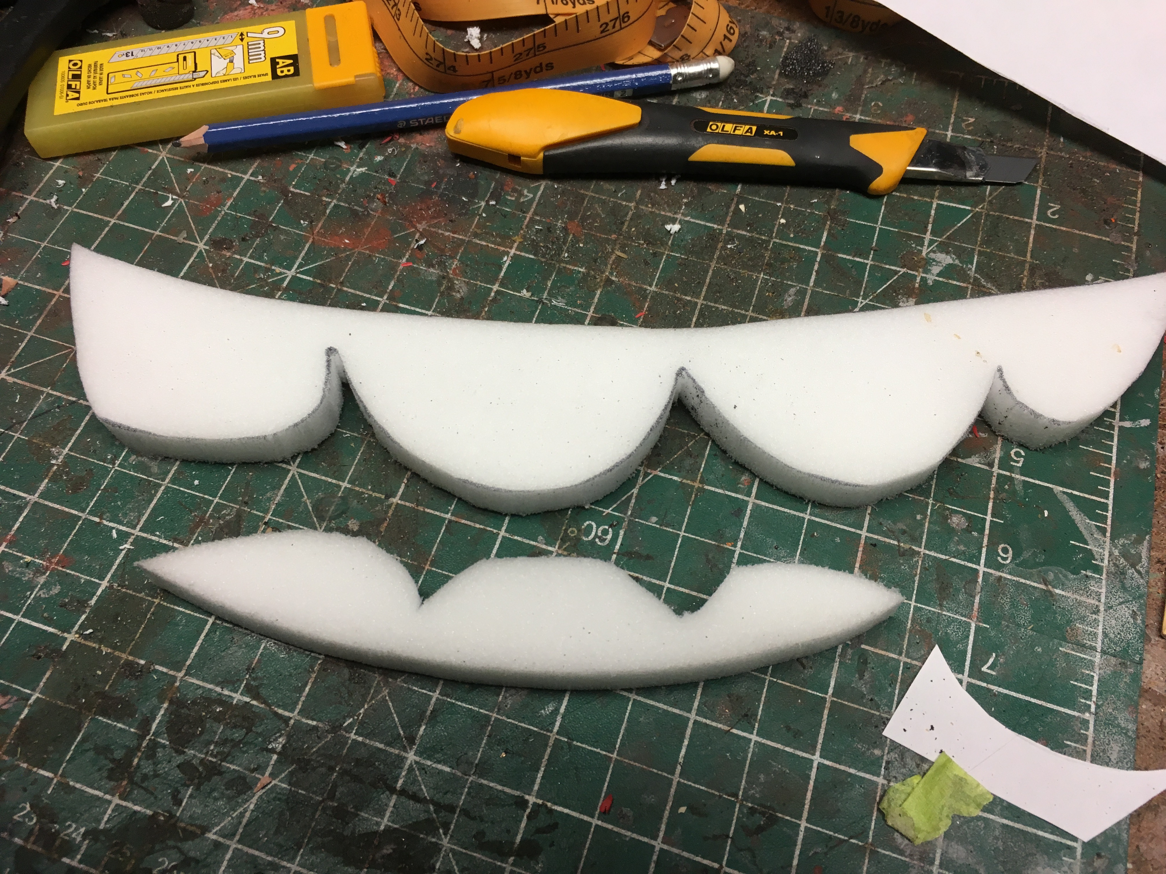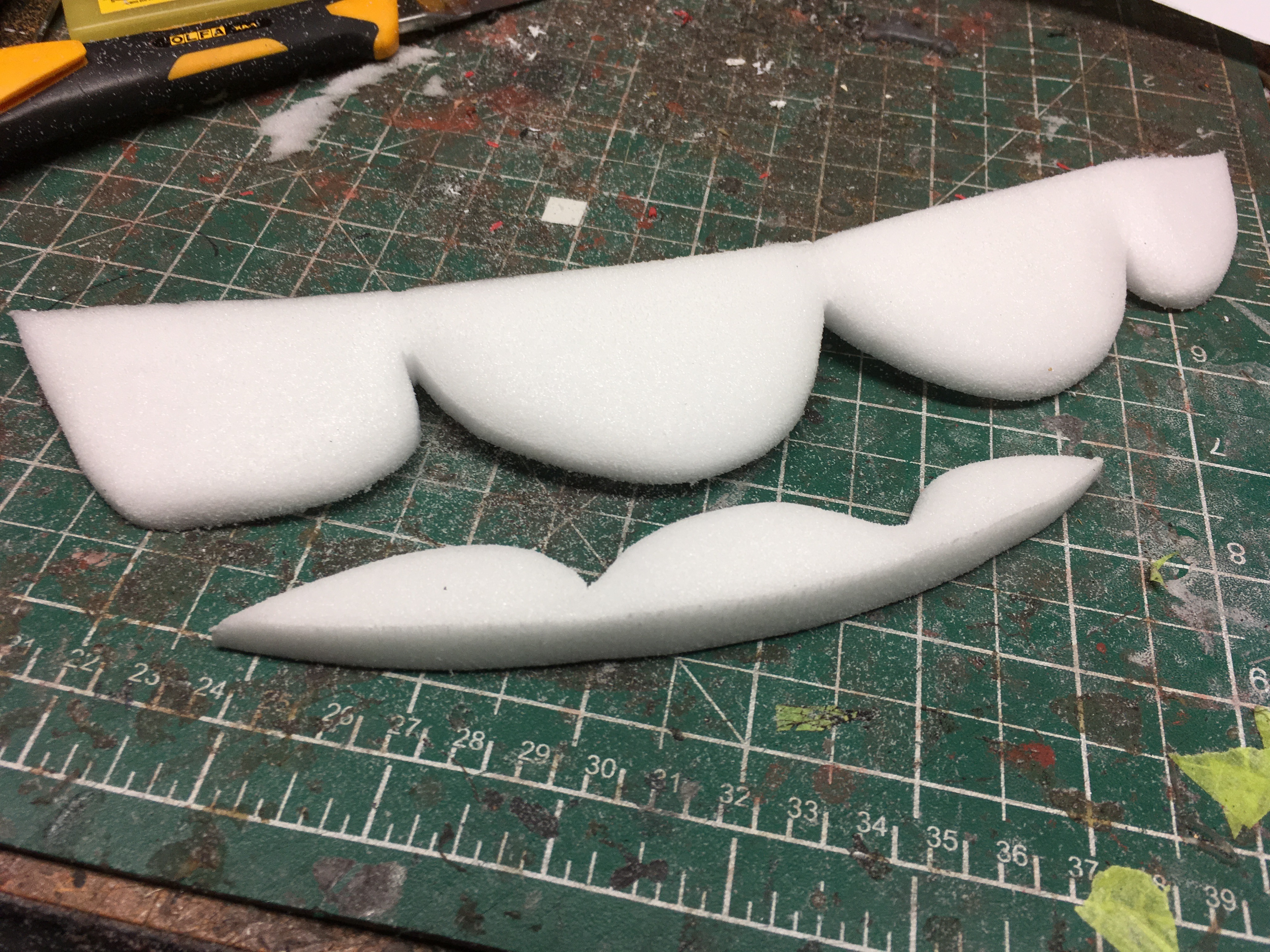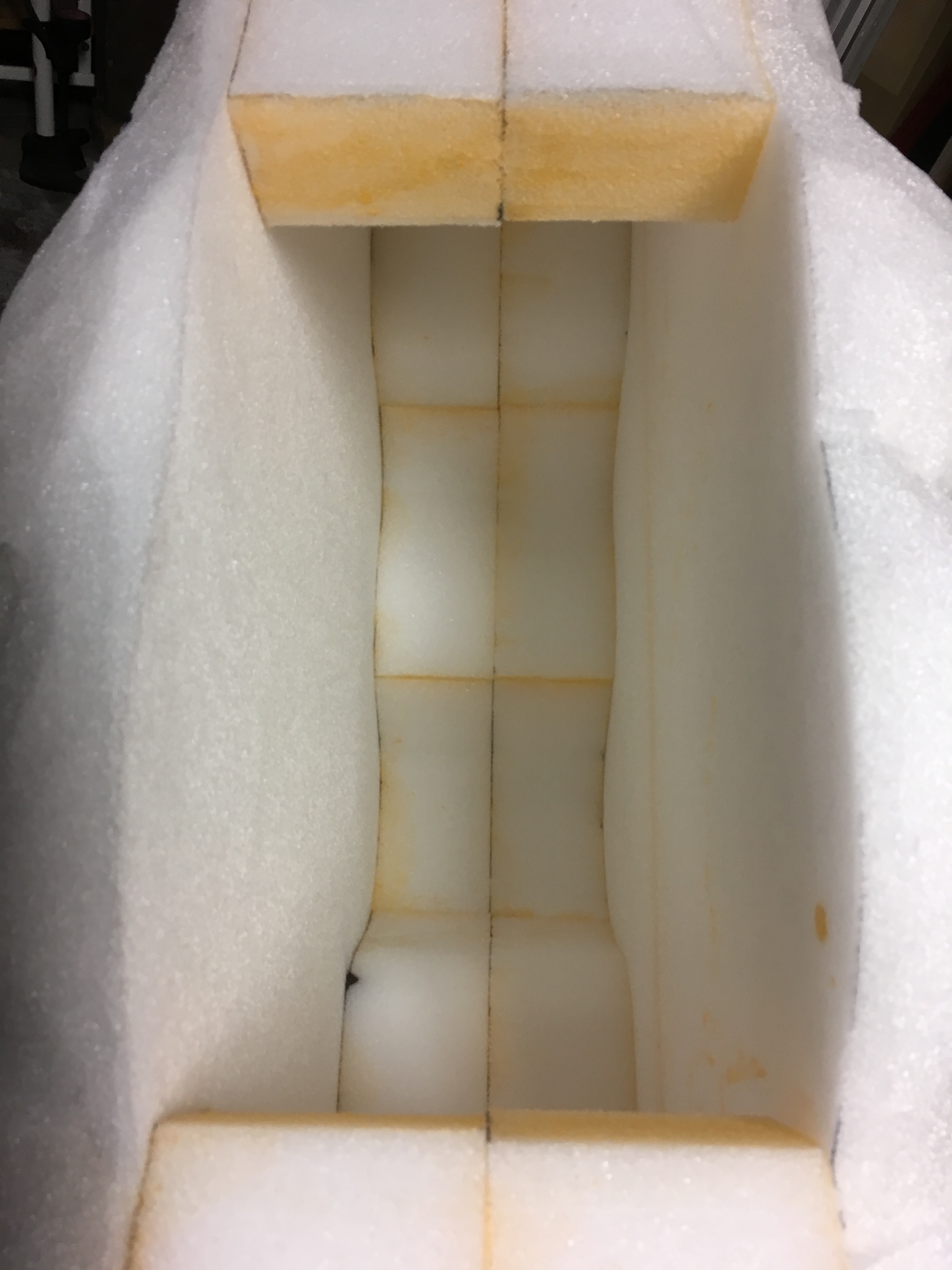 With that said, I needed 4 sheets of 4" foam to achieve the final depth. The cost of that amount of material can add up, so in order to be economical, I used scraps to create the 2 inner layers of the body and cut the outline shape, "pre-hollowed"