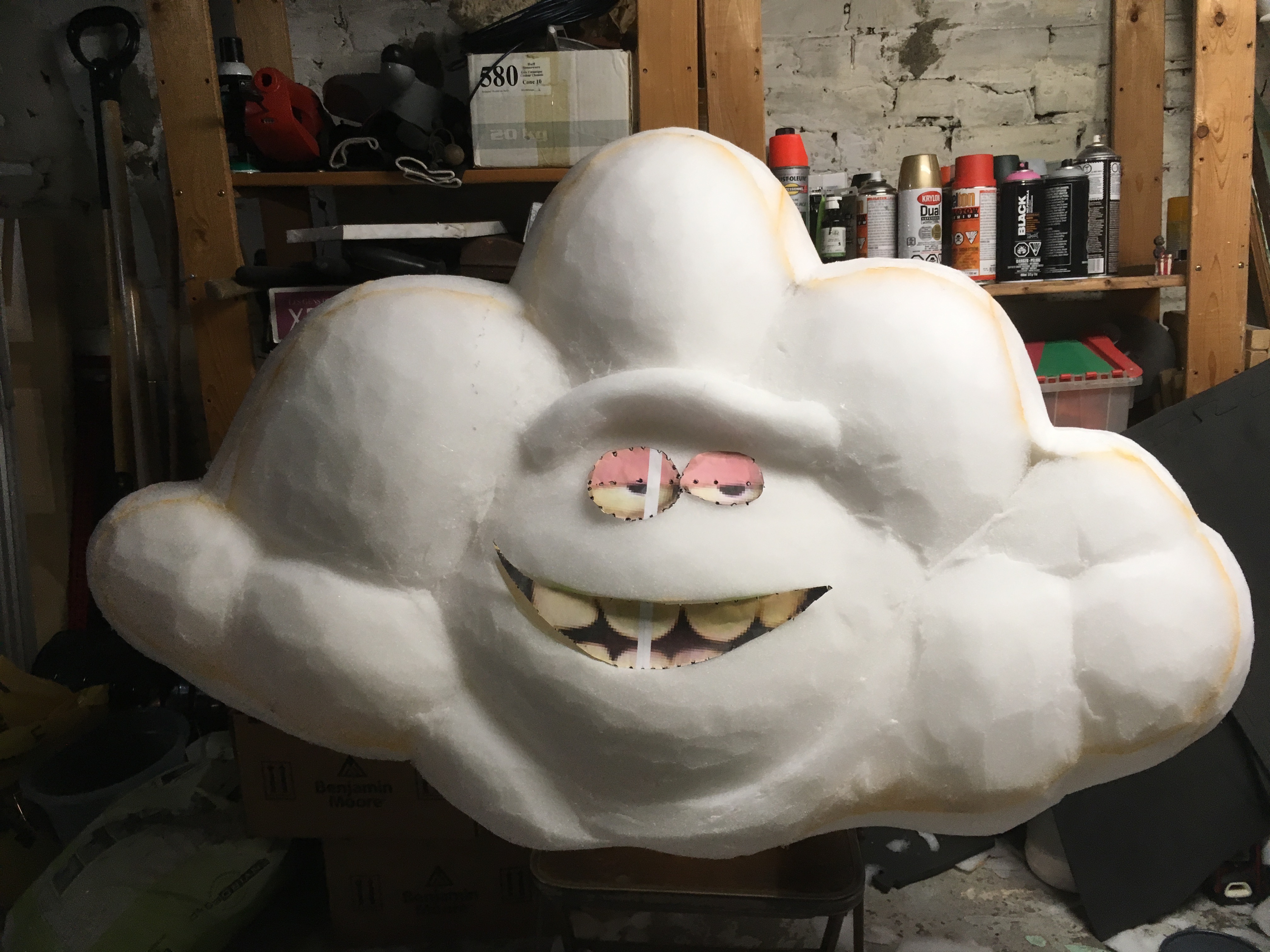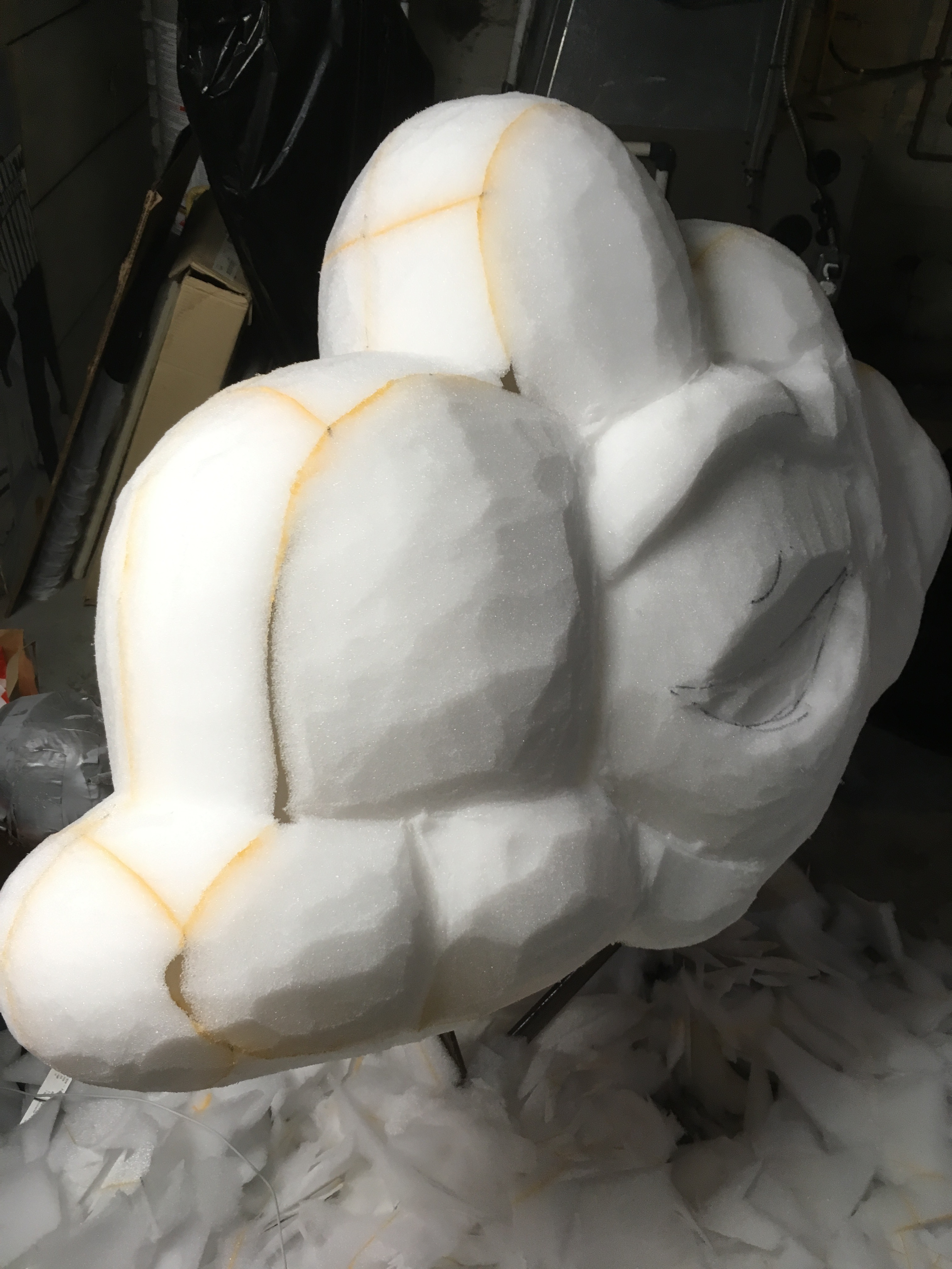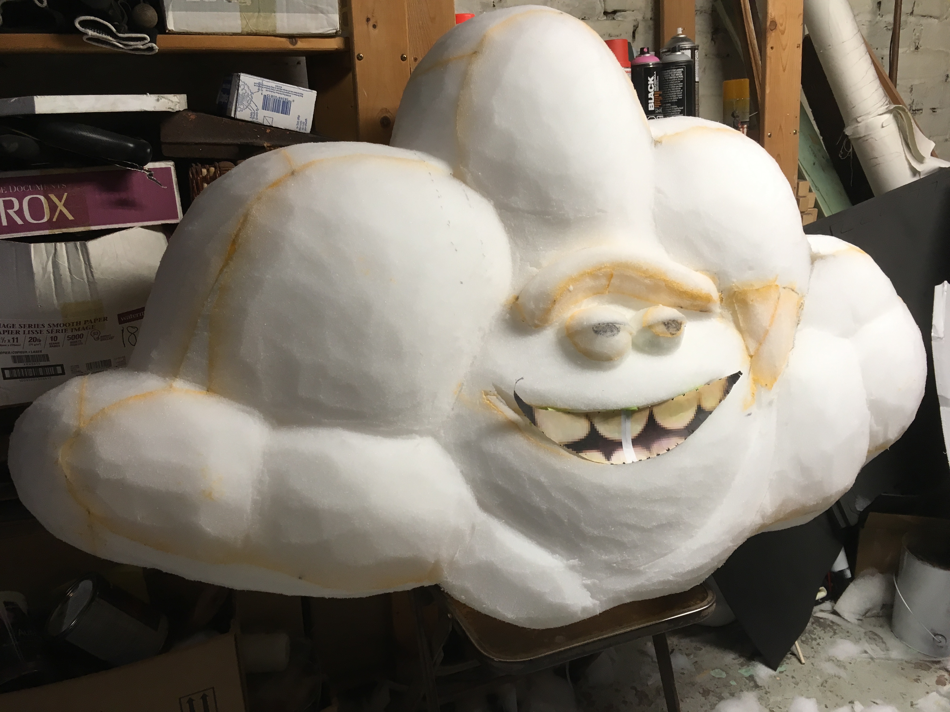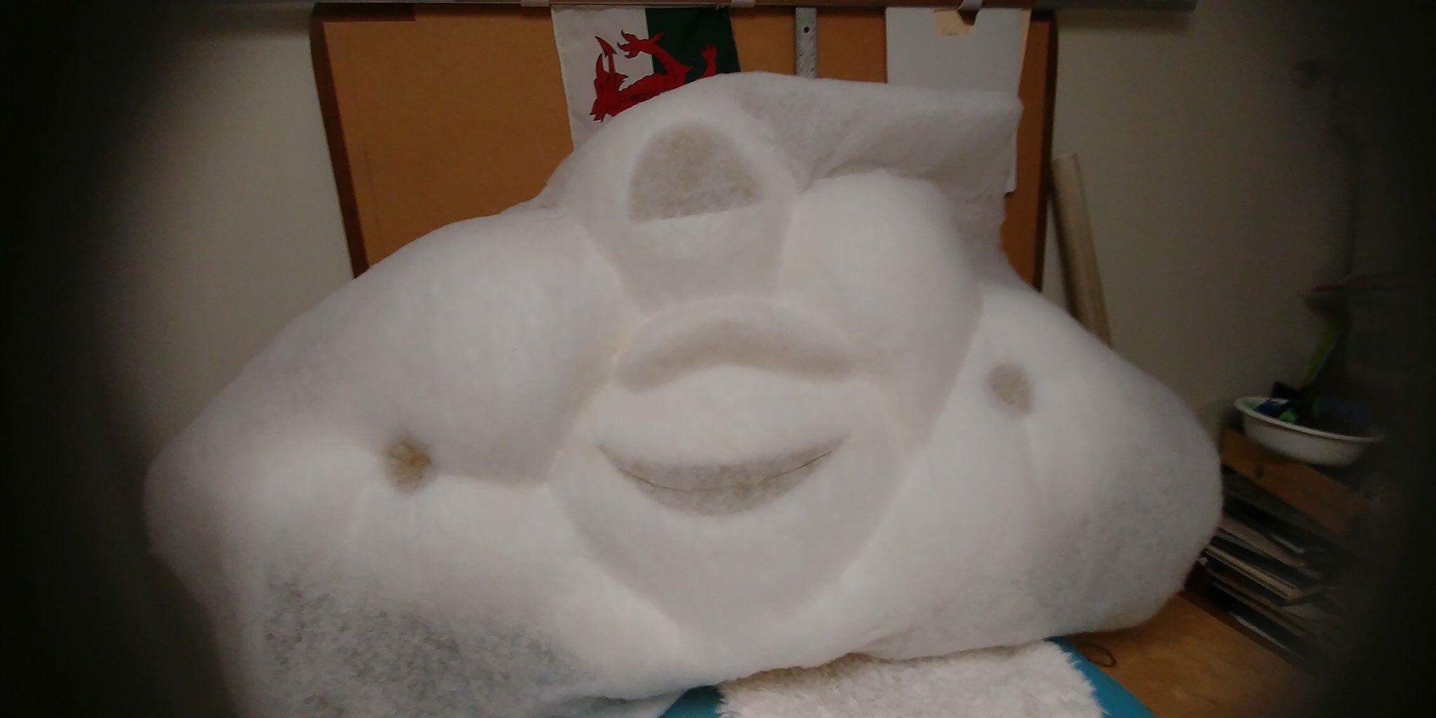 silhouette established as a block gives you a head start on your form. Usually, if I were carving a head, I would cut out the profile of the character from left to right, instead of back to front. The block form gives you the basics shapes and full dimensions in 2 directions. I start with a large olfa knife and crave the "broad strokes" THis allows me to get the form down quicker while checking proportions, shapes etc. Once I feel the form has been fleshed out, I switch to a small plfa blade to tighten up the carve and work the details. With cloud guy, his shape is fairly simple and a lot of the work was done with a large knife. I applied the eyebrow with a separate piece of foam, but once I was finished, I realized the facial details had to move down a bit. The nice thing about foam is you can make a mistake and fix it easily by cutting and regluing, or adding pieces to the carve. After the body was complete, I smoothed the surface with a rasp. This is a simple process of dragging the rasp over the surface of the foam to remove knife marks, bumps etc. However, when you're covering a carve in fur or batting, the imperfections with not be visible due to the thickness of the fabric.