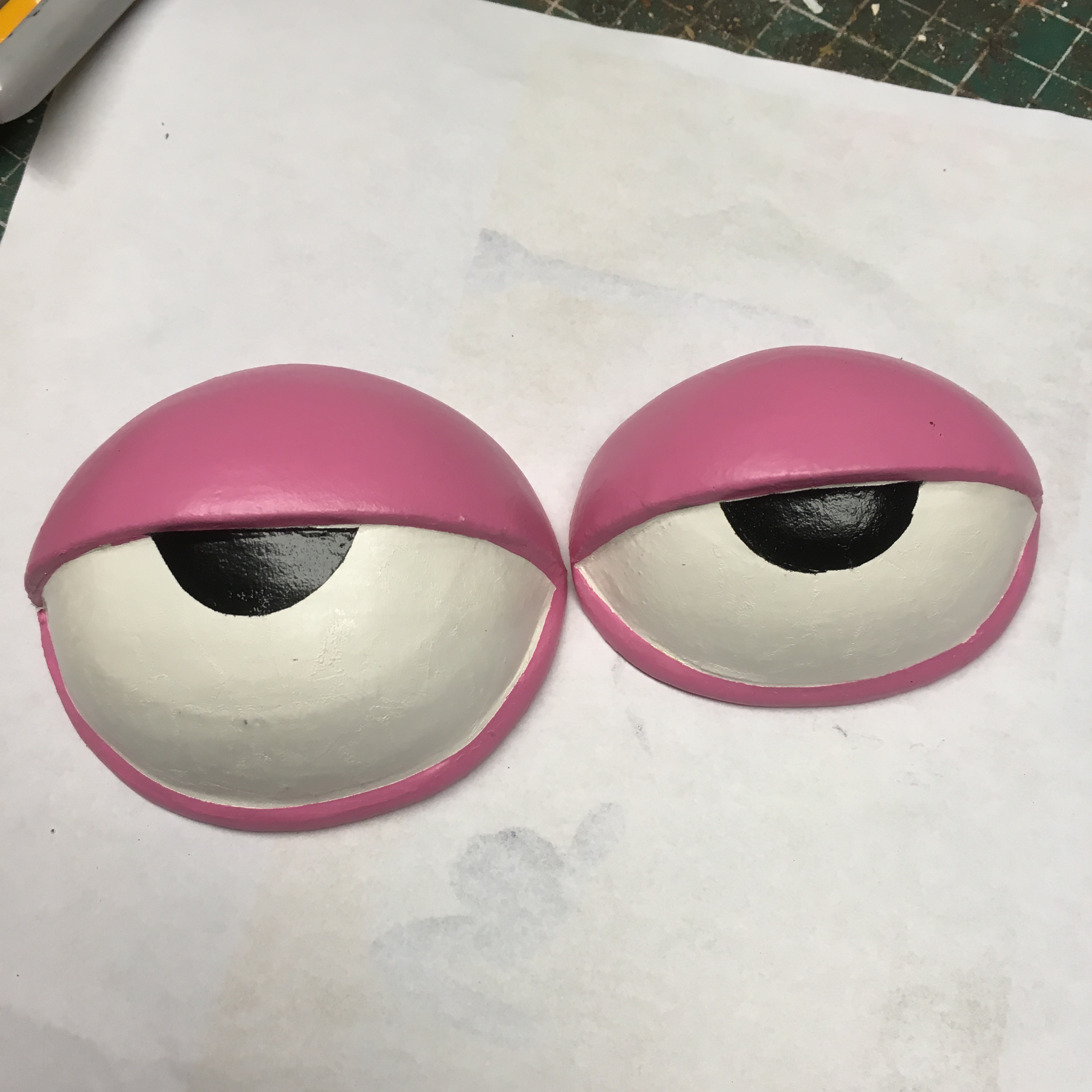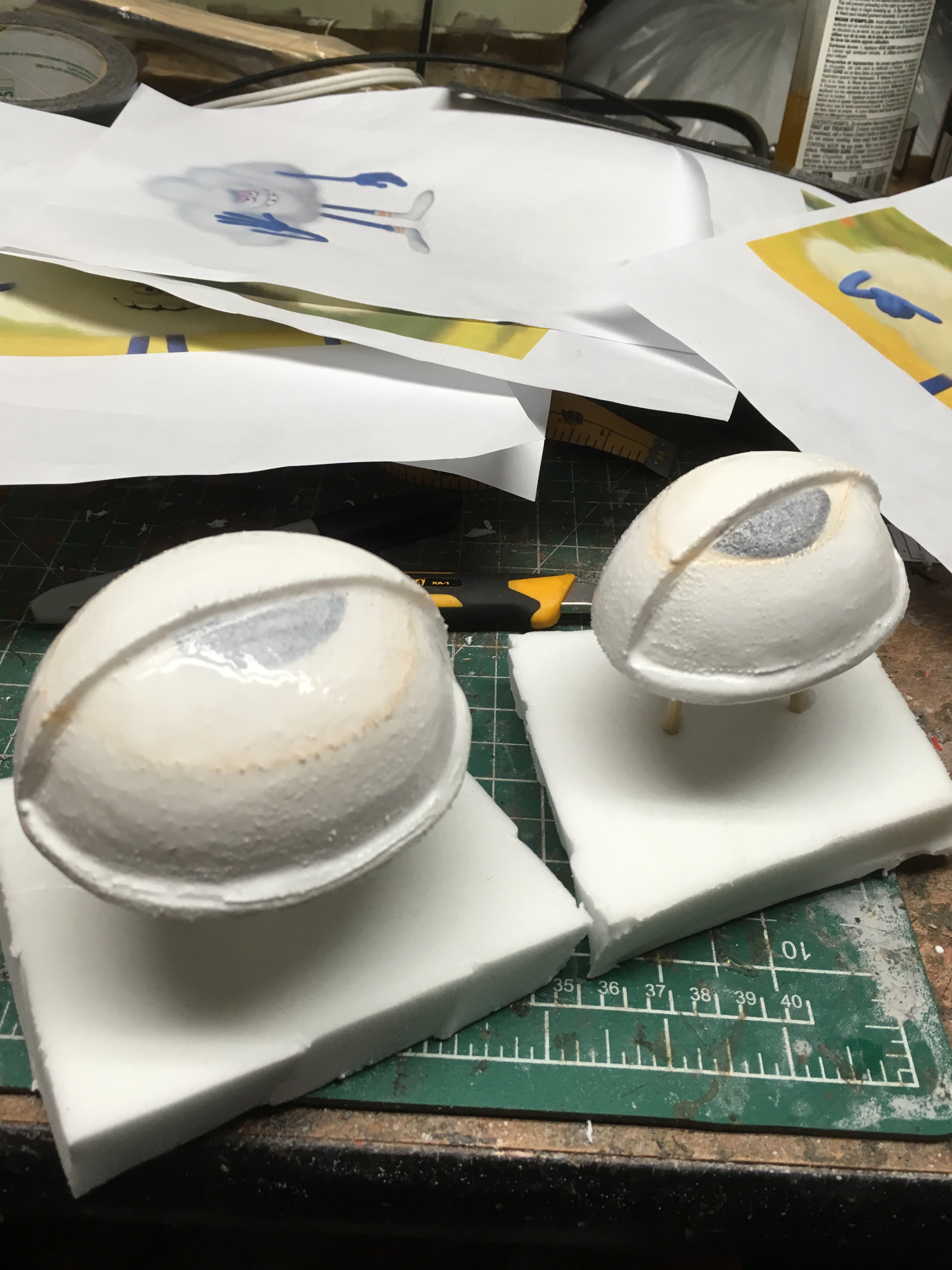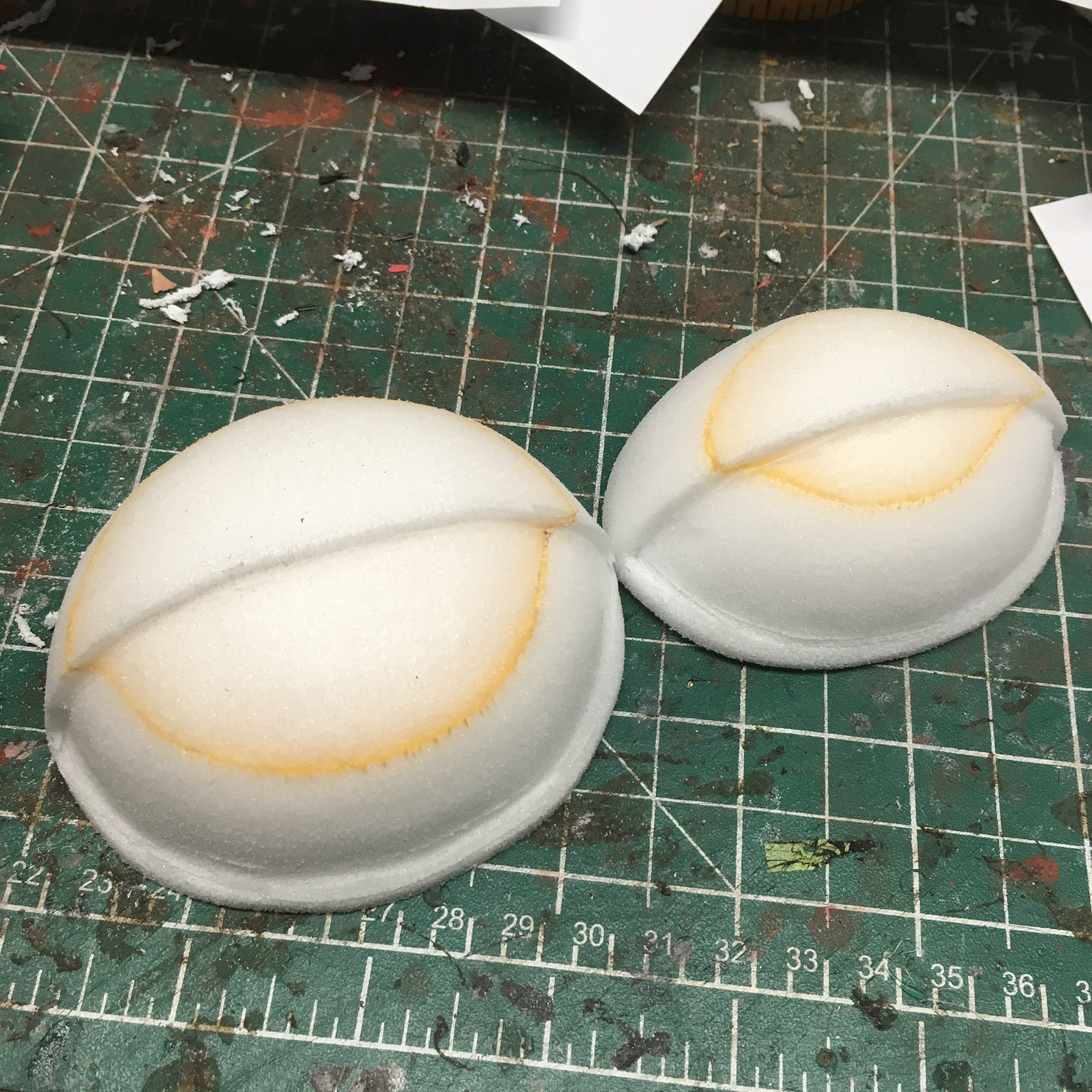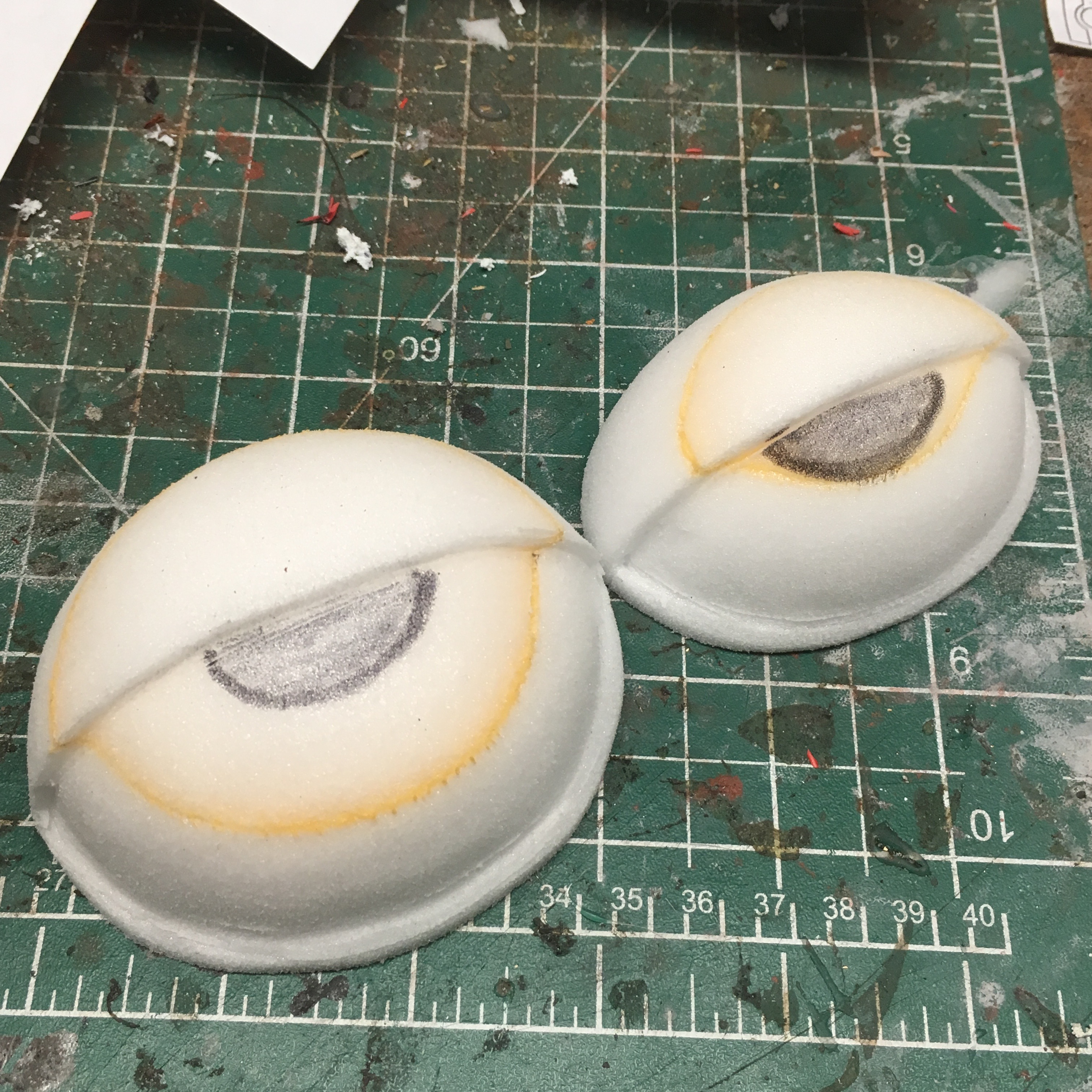 I initially carved "dummie" eyes for placement using the etha foam. The final eyes were carved using plastazote foam which is a smoother denser foam. I made templates then cut out the foam on the bandsaw. The eyes were carved then sanded using a dremel. When the dremelling was complete, I passed the heat gun over the surface to burn any fuzzies and close the cells of the foam. The eyes were sealed using flexbond (white glue also works)
