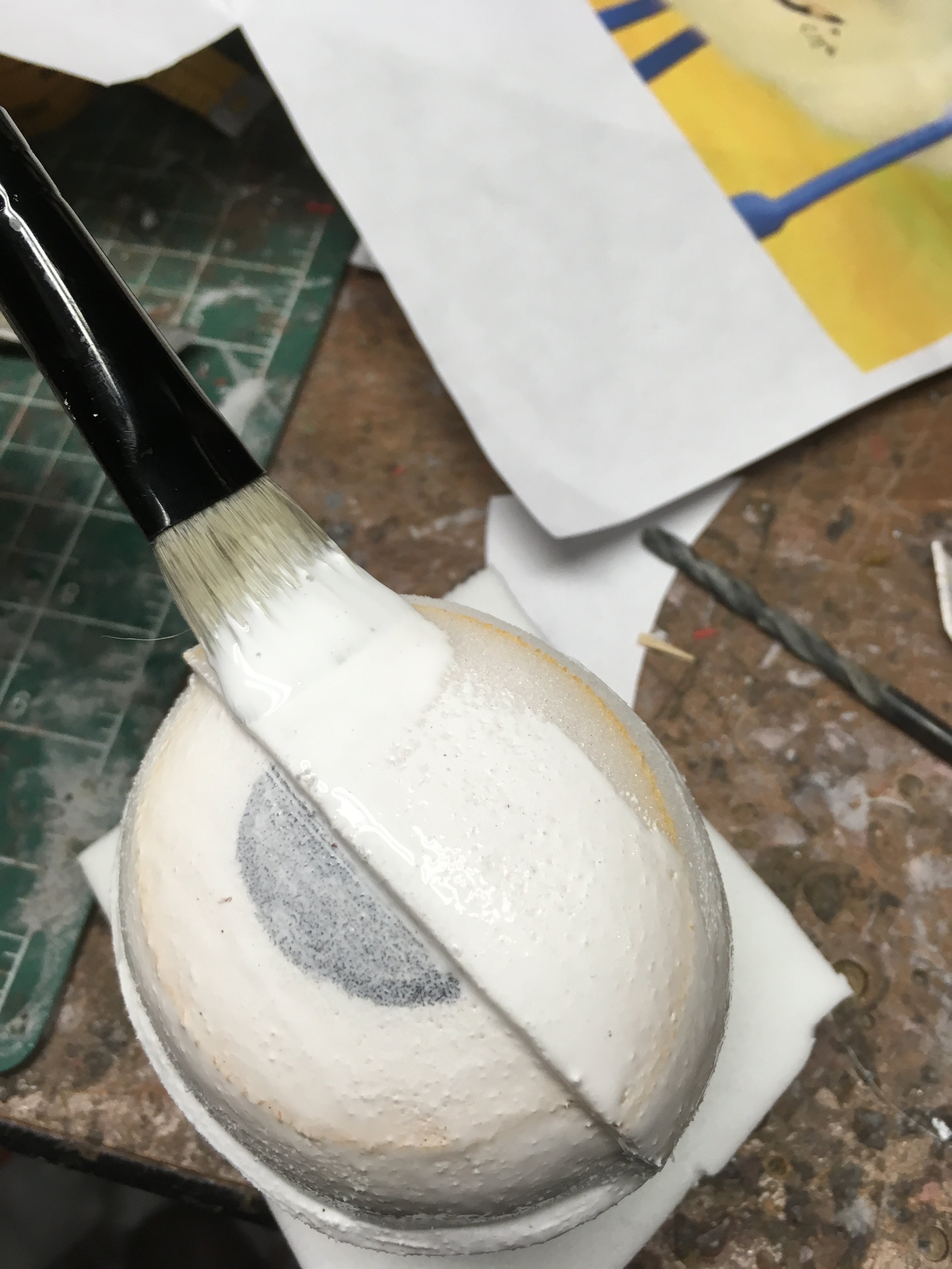 3 thin coats were applied with a paint brush, with drying between each coat. After the 3rd coat is applied, I dip my fingers in water and smooth out the flexbond. The eyes were then masked and painted. A little acrylic wash was added to create some more depth as well as some yellow chalk pastel to achieve some yellowing on the eyeballs.