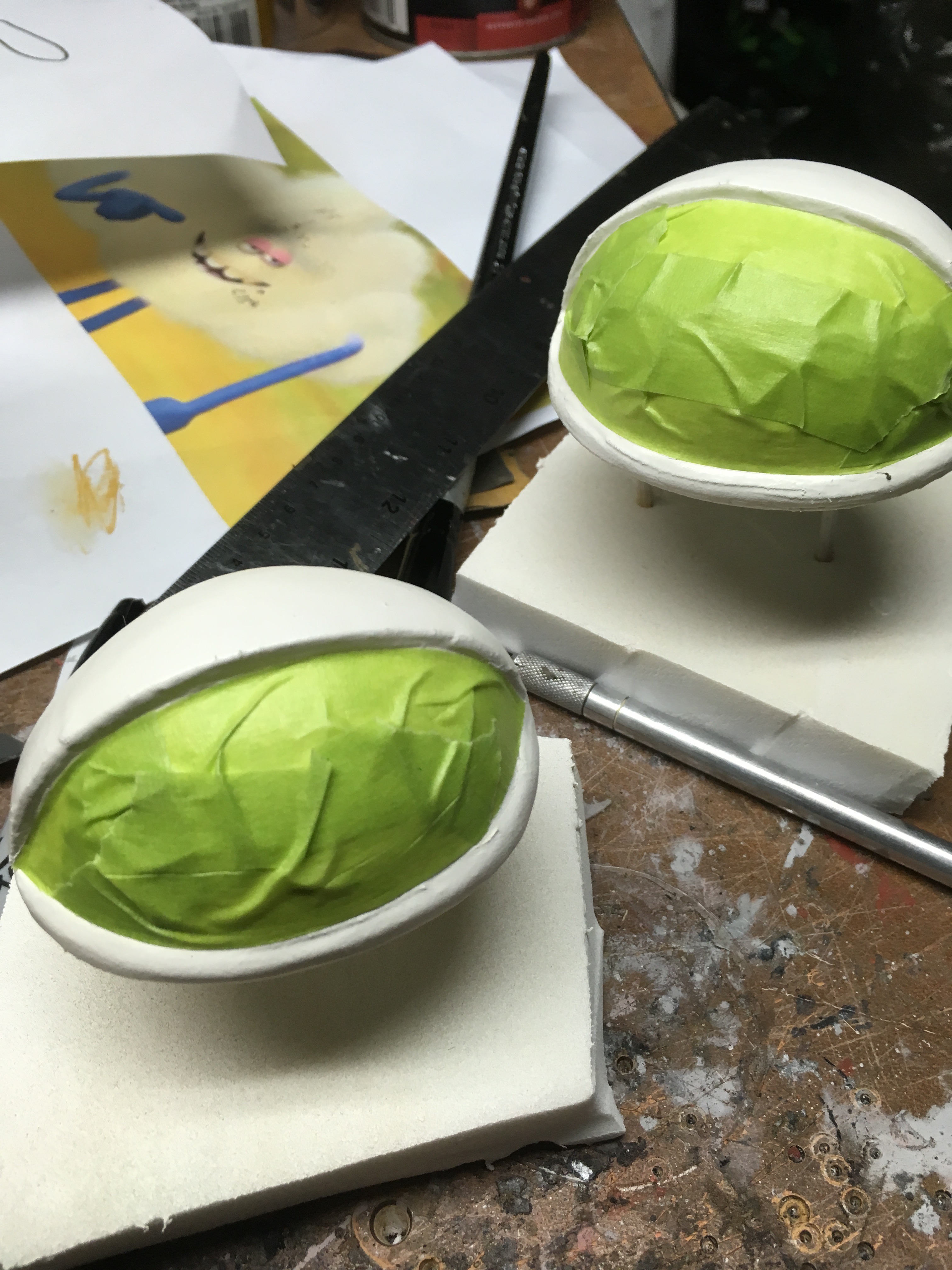 The solid end pieces, or in this case, the front and back need to be dished out in order to gain more space inside the body and reduce overall weight of the costume.