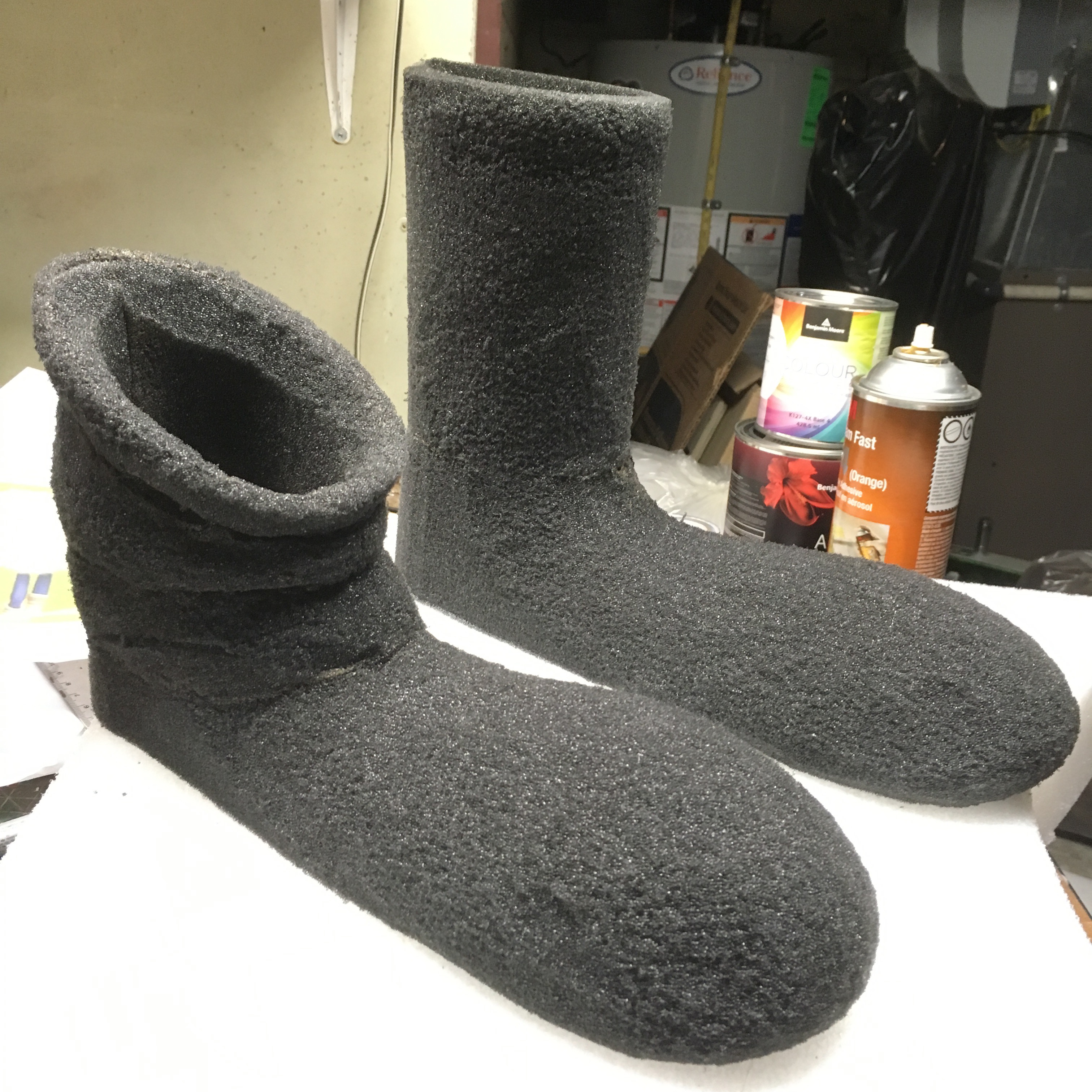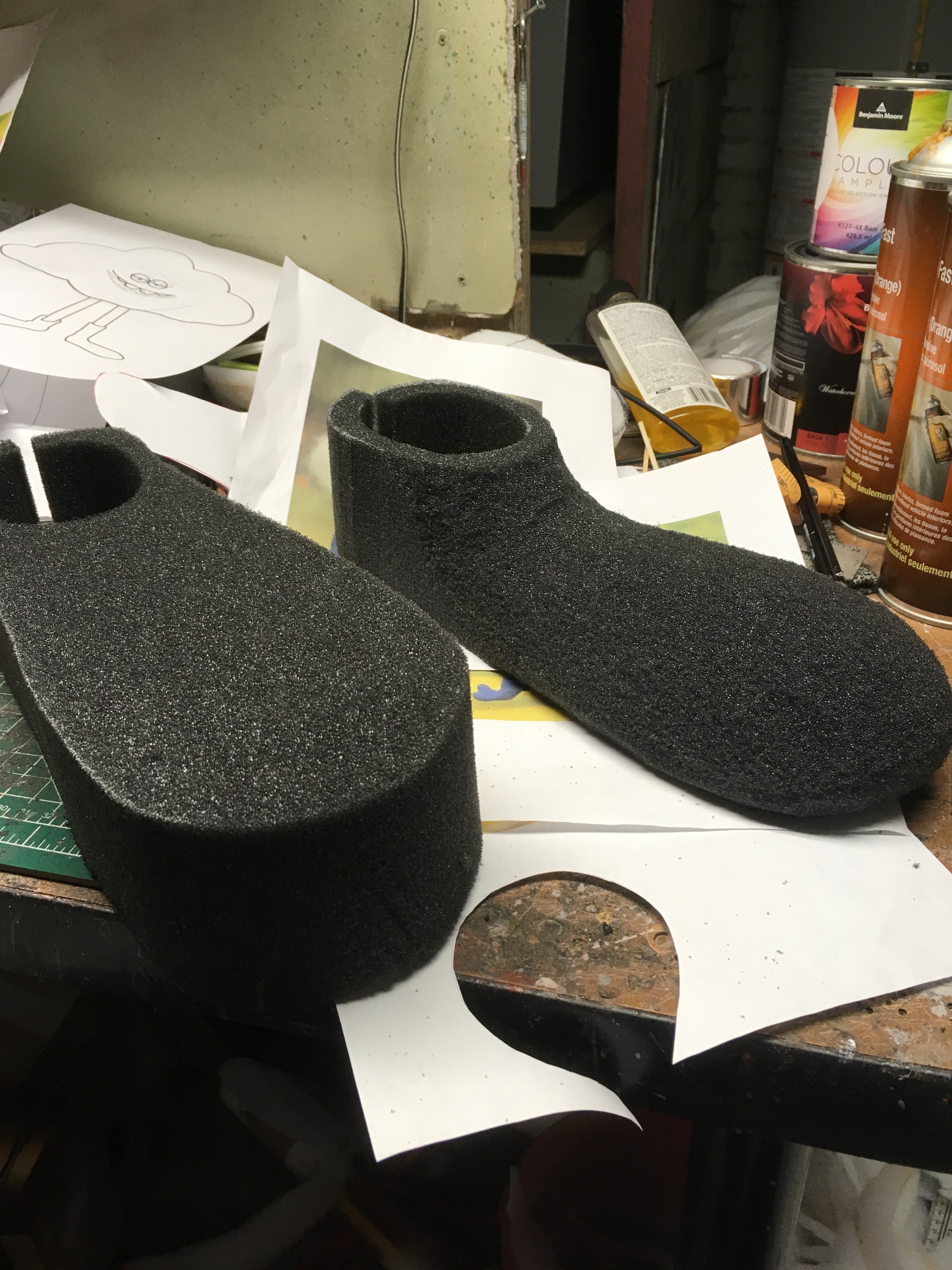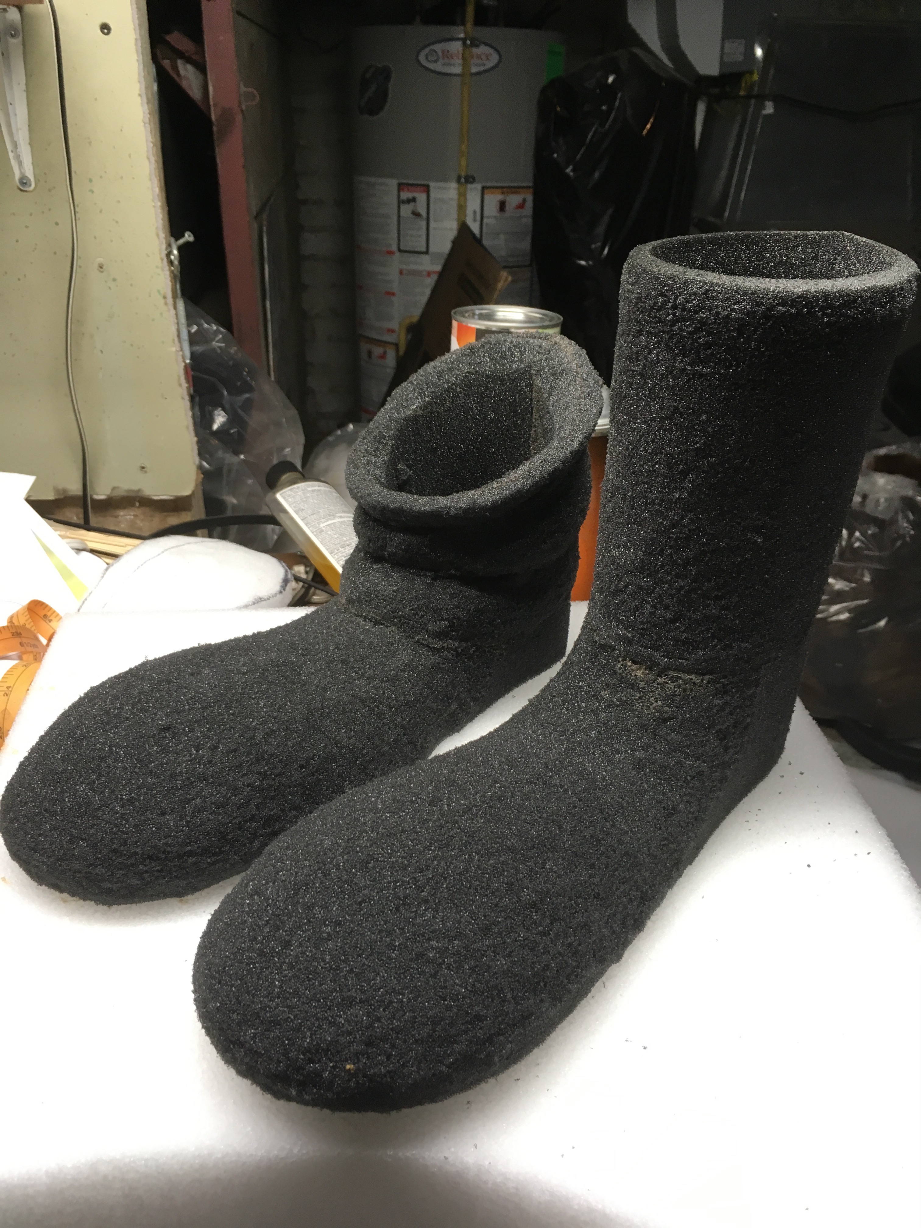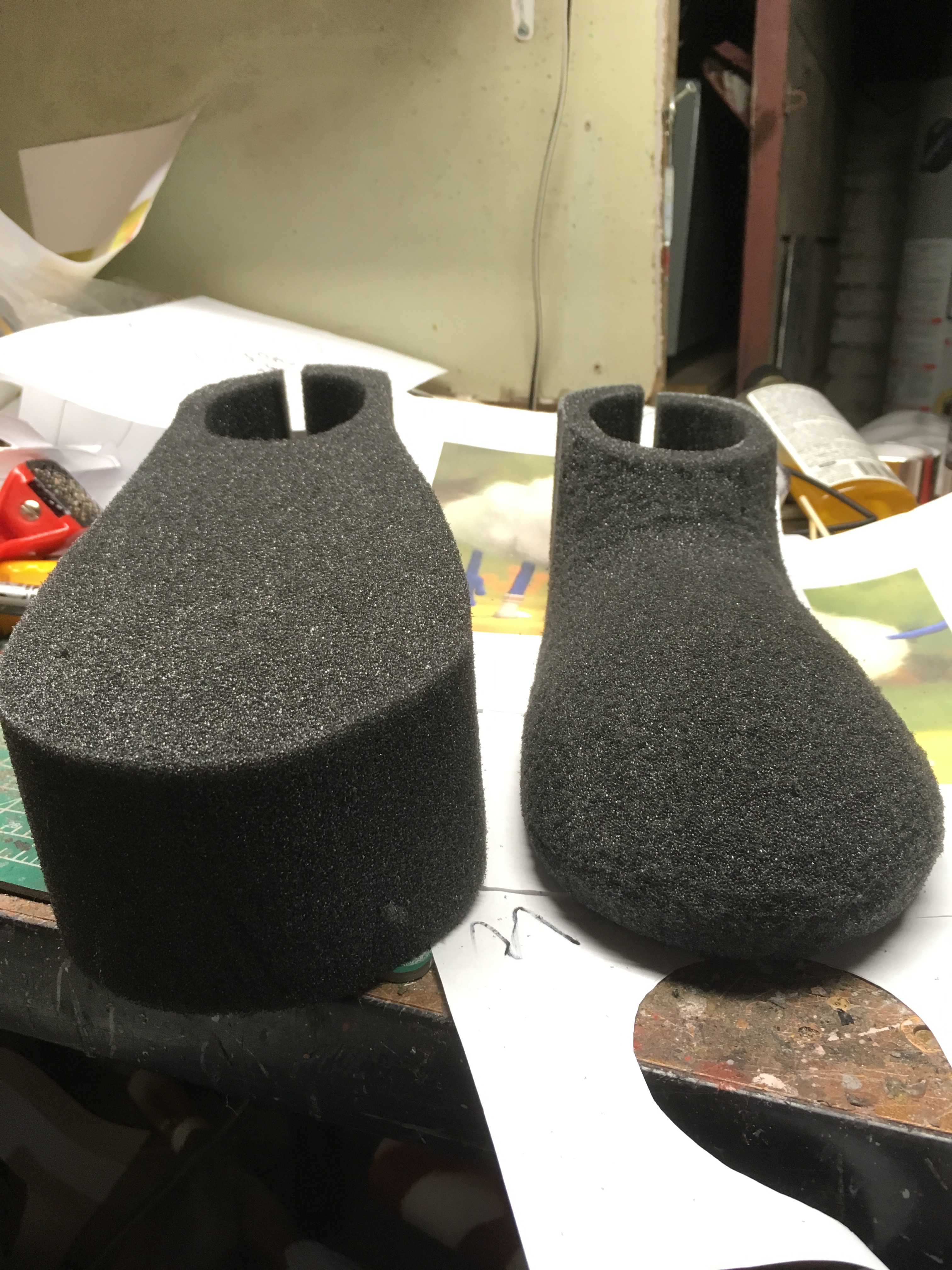 The template was traced onto 6" ester foam and cut out on the bandsaw. The opening eas also cut out, and then glued at the seam. I then flipped the sock / shoe over and traced on his foot pattern, using a left and right fitting. The appropriate amount fo foam was dished out using my small olfa knife. Next I carved the sock using images for reference. The slouch and longer upper of the left foot were added using 0.5" ester cut and glued into a tube. The slouchy side was carved and formed with the foam. Once I was happy with the carve, a cardboard type sole was added using spray adhesive.