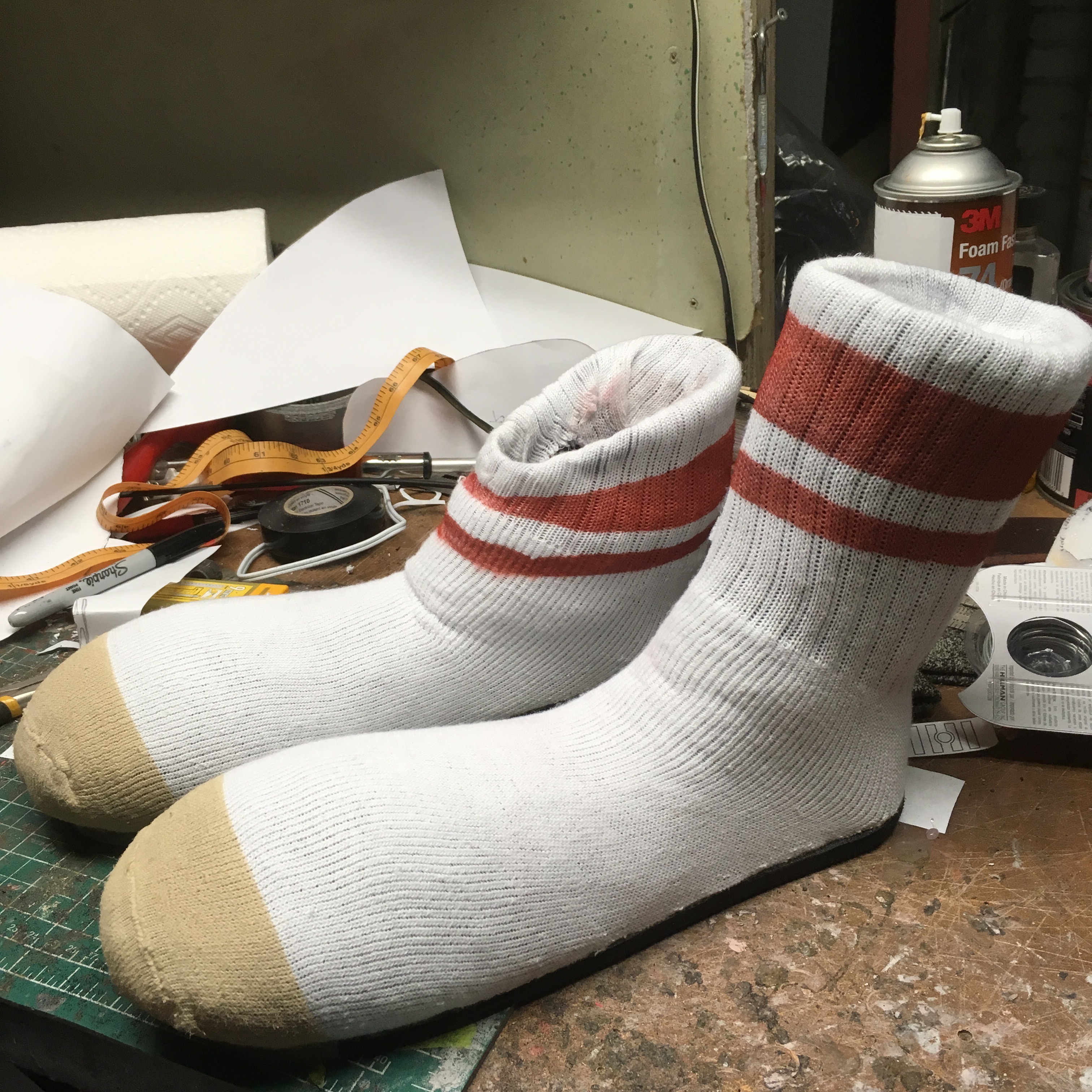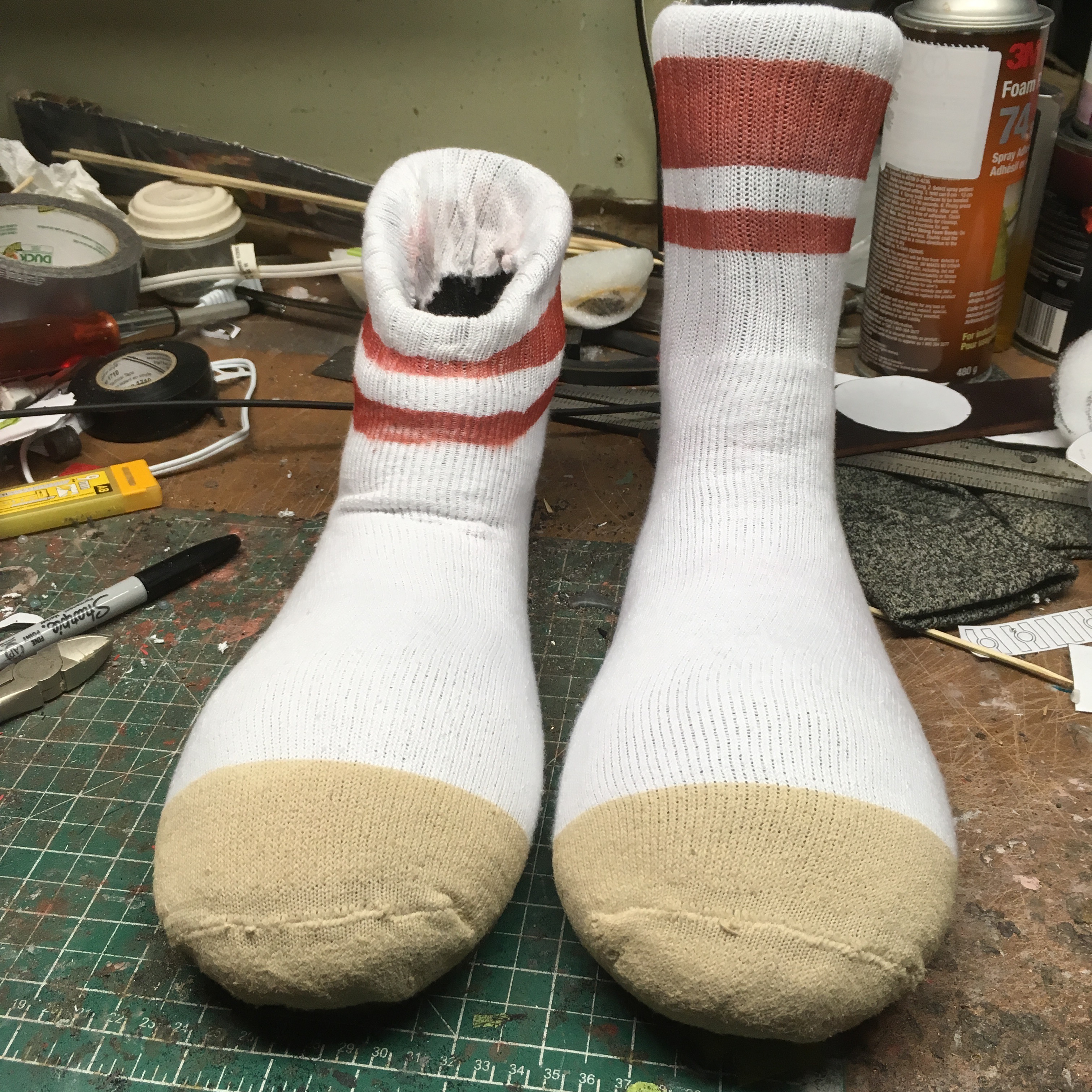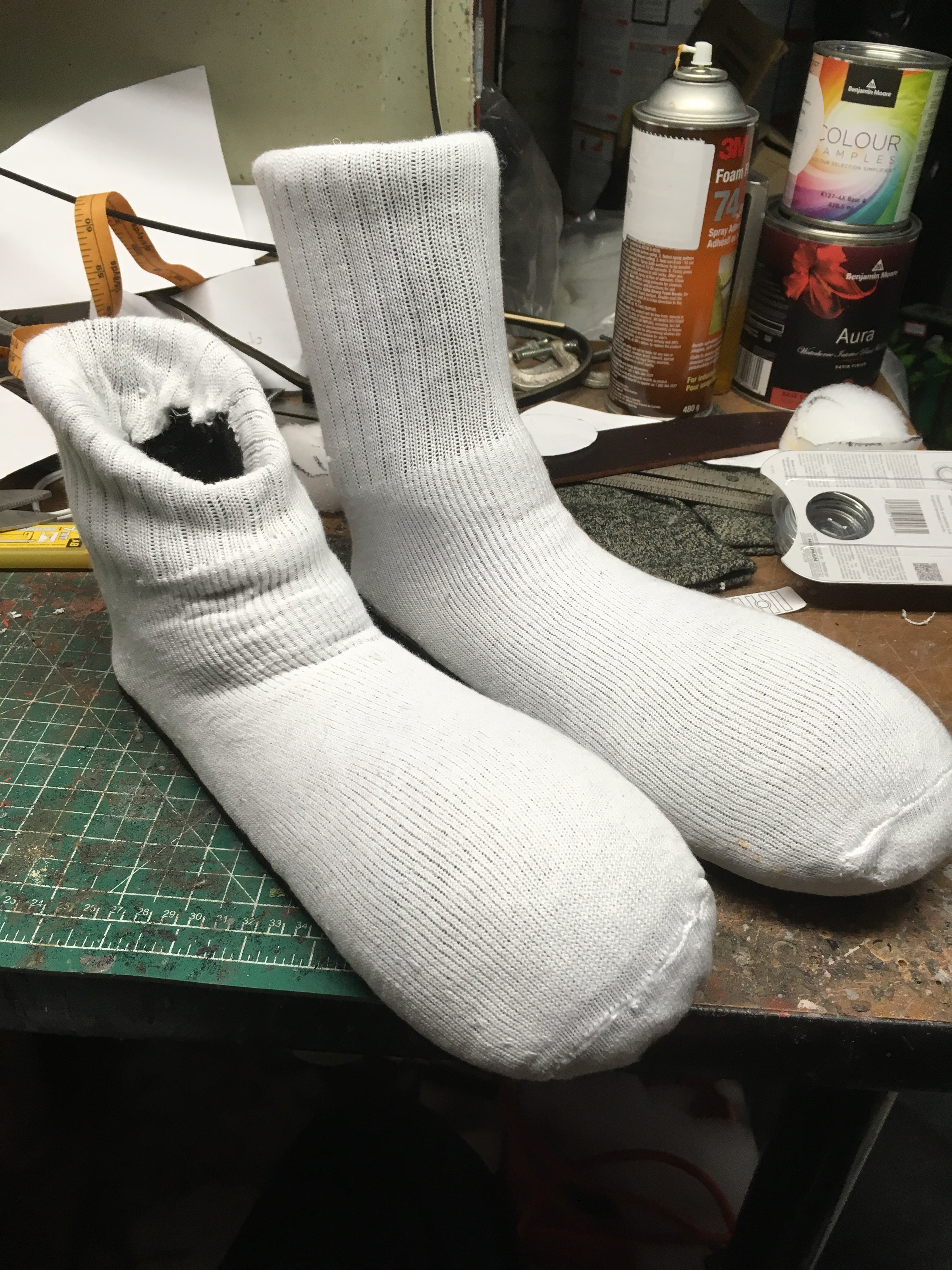 To cover the sock shoes, I purchased a cheap pair of plain white tube socks and pulled them over the shoe. Initially, the elastic in the sock pinched the upper part of the shoe so I had to hand stretch the sock to weaken the elasticity. This worked well and I was able to get the sock stretched over the shoe while retaining the form.