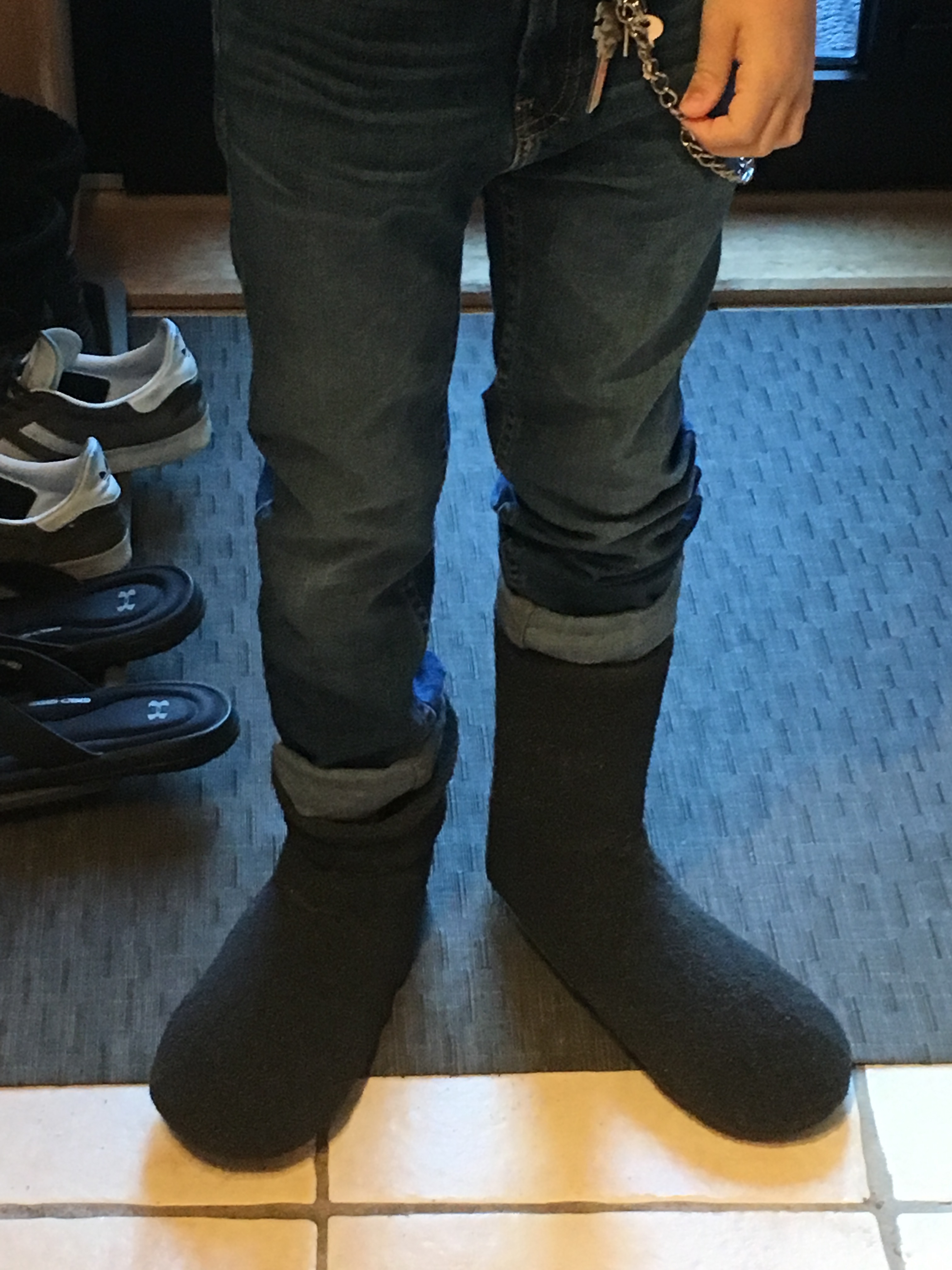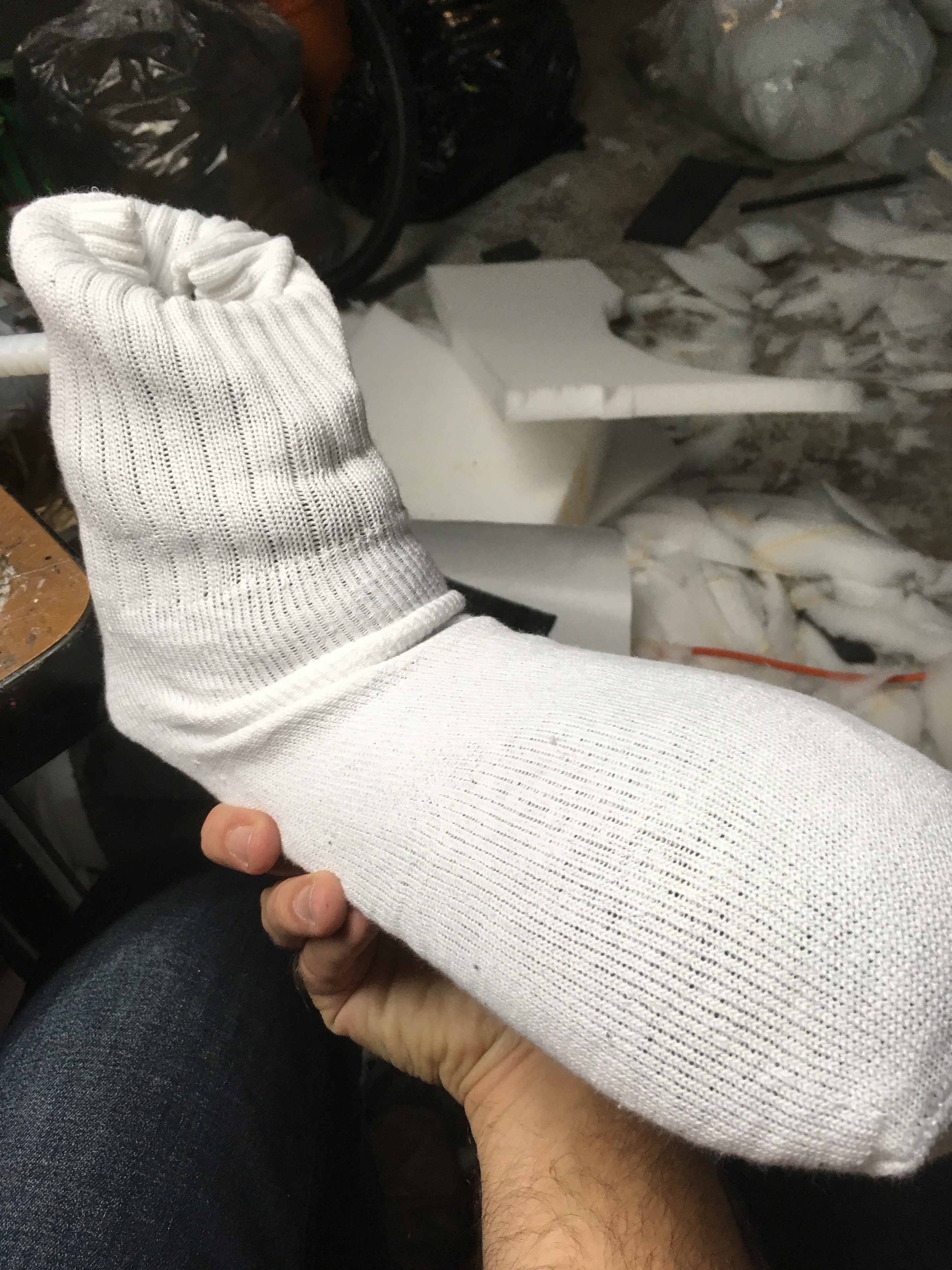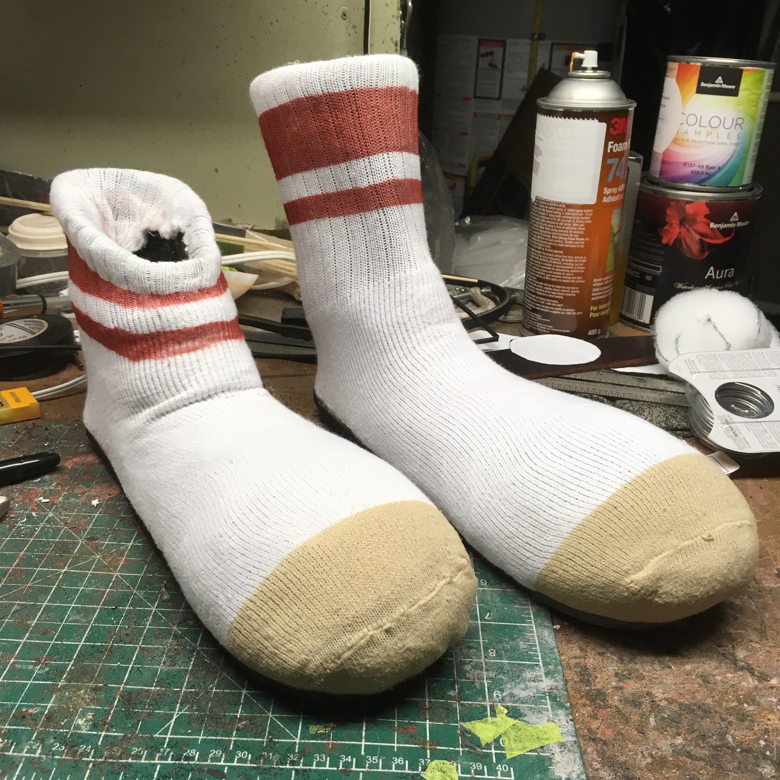 To cover the sock shoes, I purchased a cheap pair of plain white tube socks and pulled them over the shoe. Initially, the elastic in the sock pinched the upper part of the shoe so I had to hand stretch the sock to weaken the elasticity. This worked well and I was able to get the sock stretched over the shoe while retaining the form.