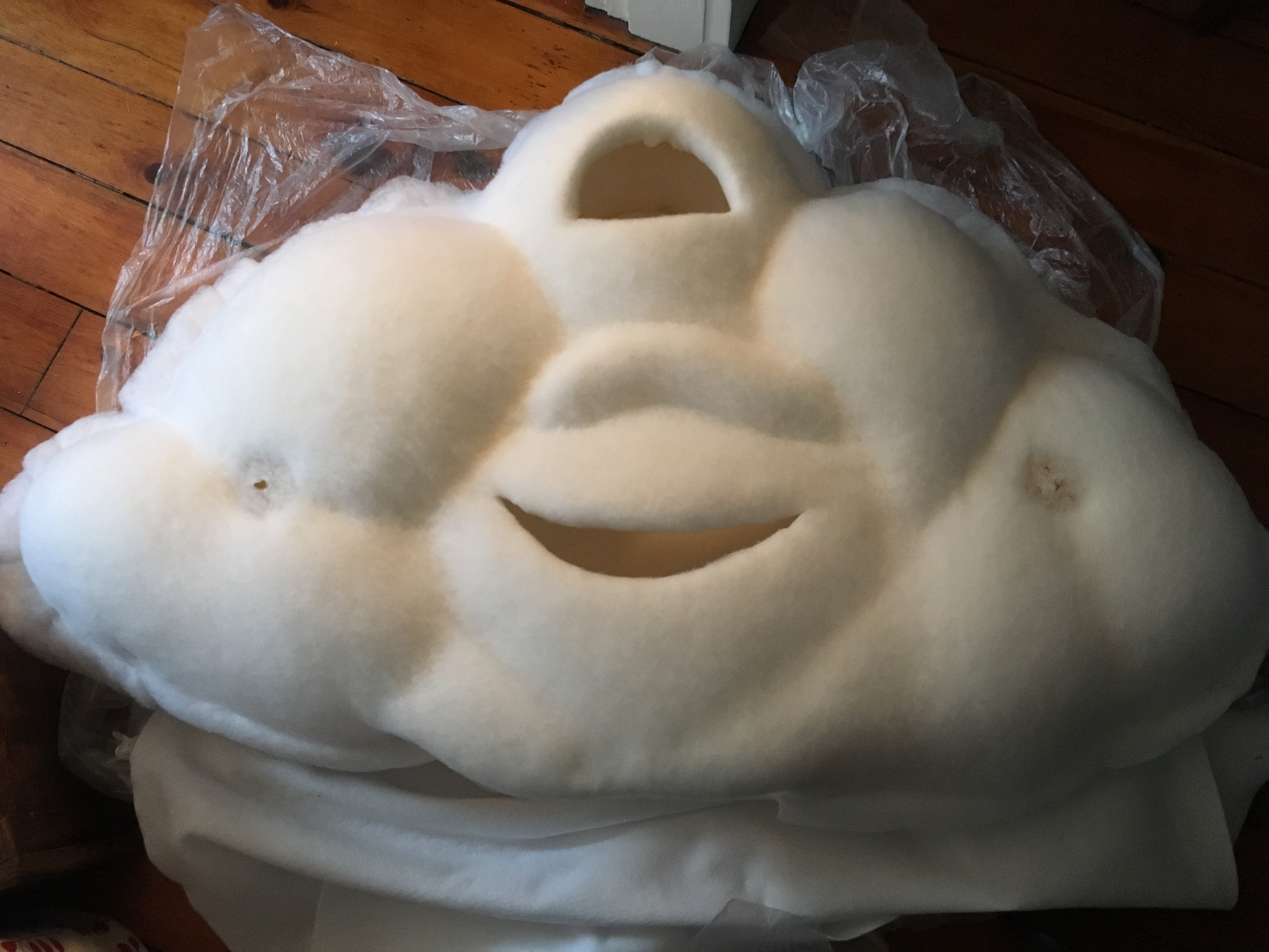 I searched numerous fabric stores trying to find the perfect fabric for Cloud Guy. I knew batting was a good alternative that I kept in the back of my mind, but I was determined to find something that had that vapour looking wispy feel. With no luck I ended up using batting.