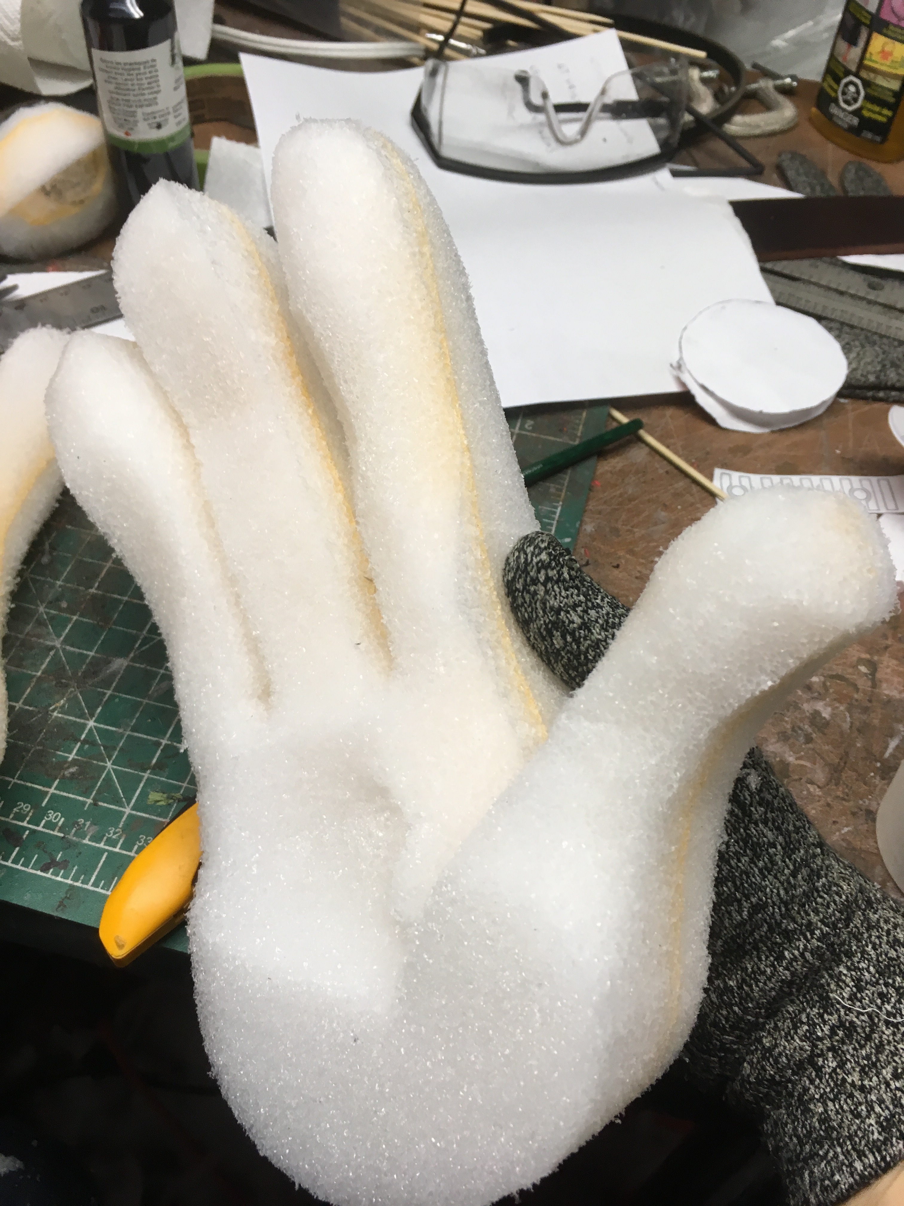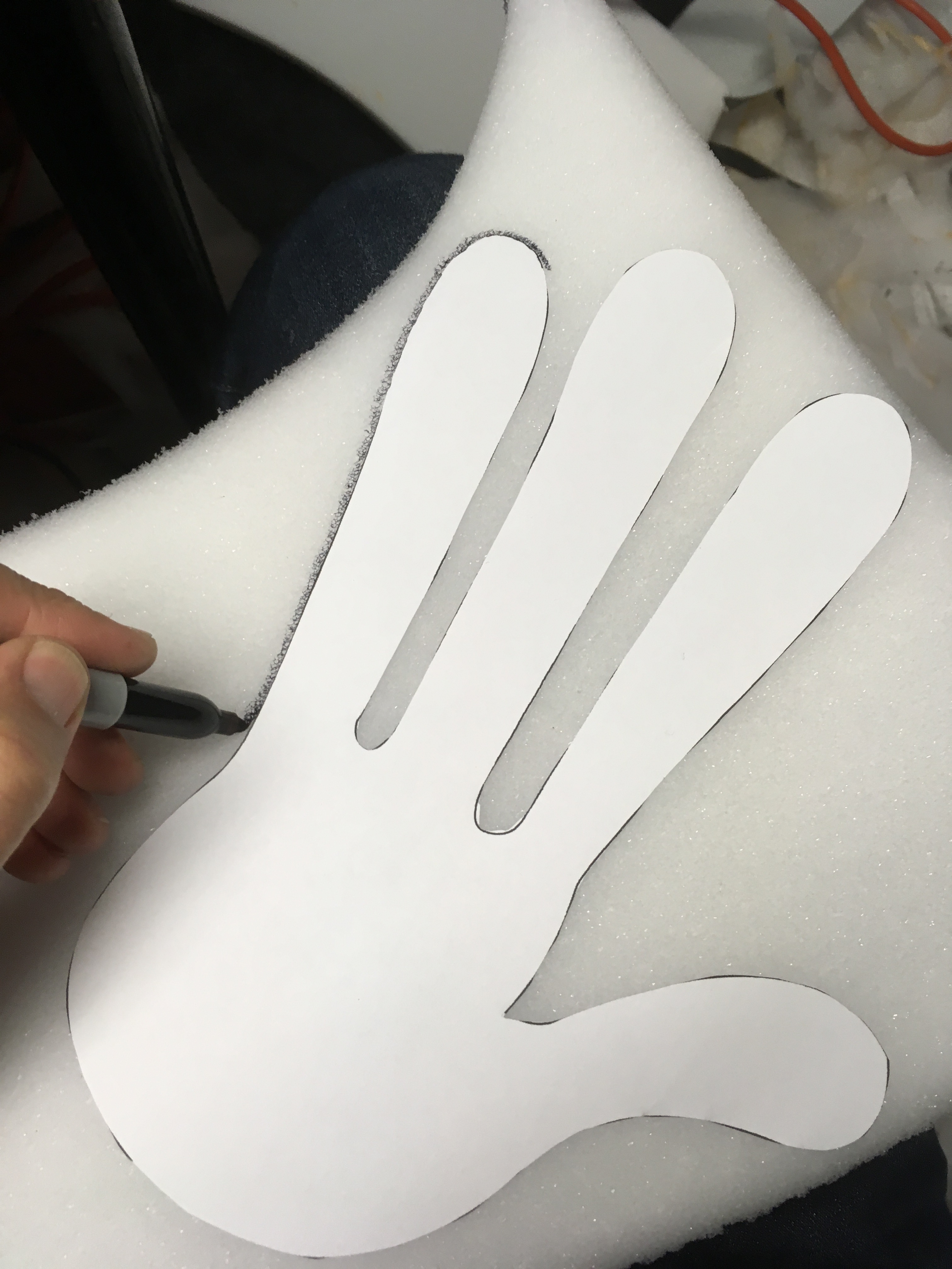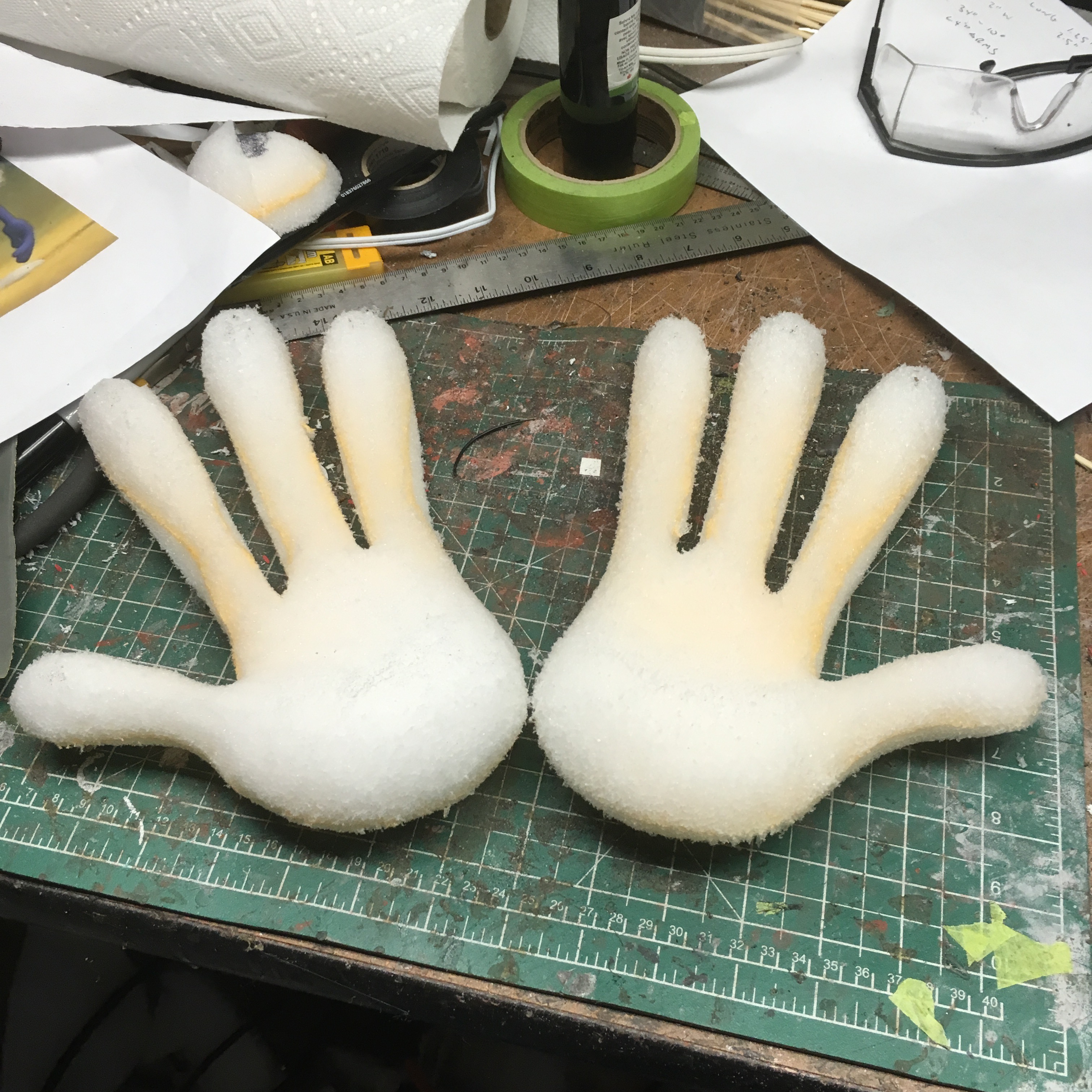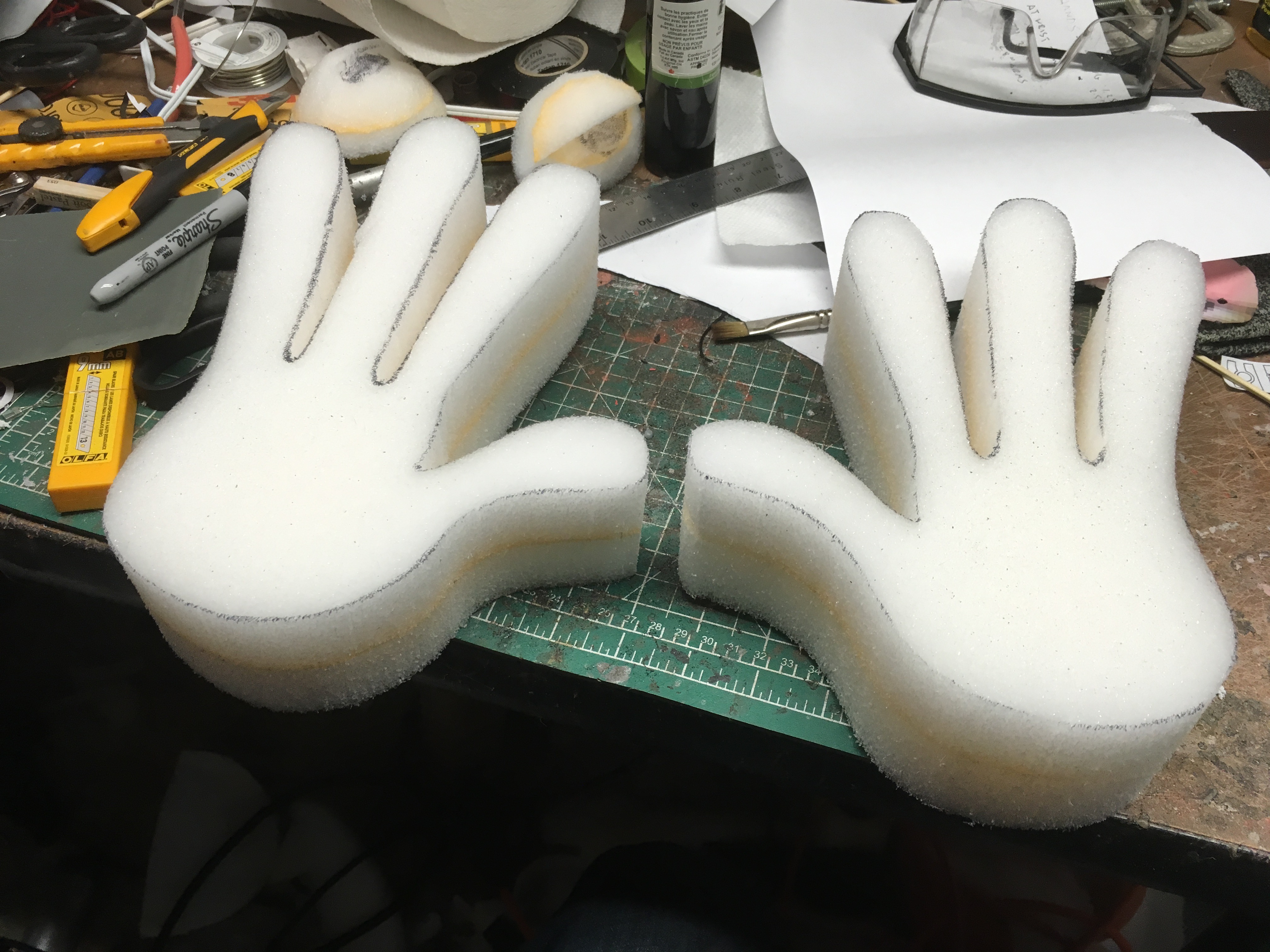 I freehanded the templates in Adobe Illustrator and scaled them accordingly. I glued 2 x1.25" Etha foam together and carved each hand using photos for reference.