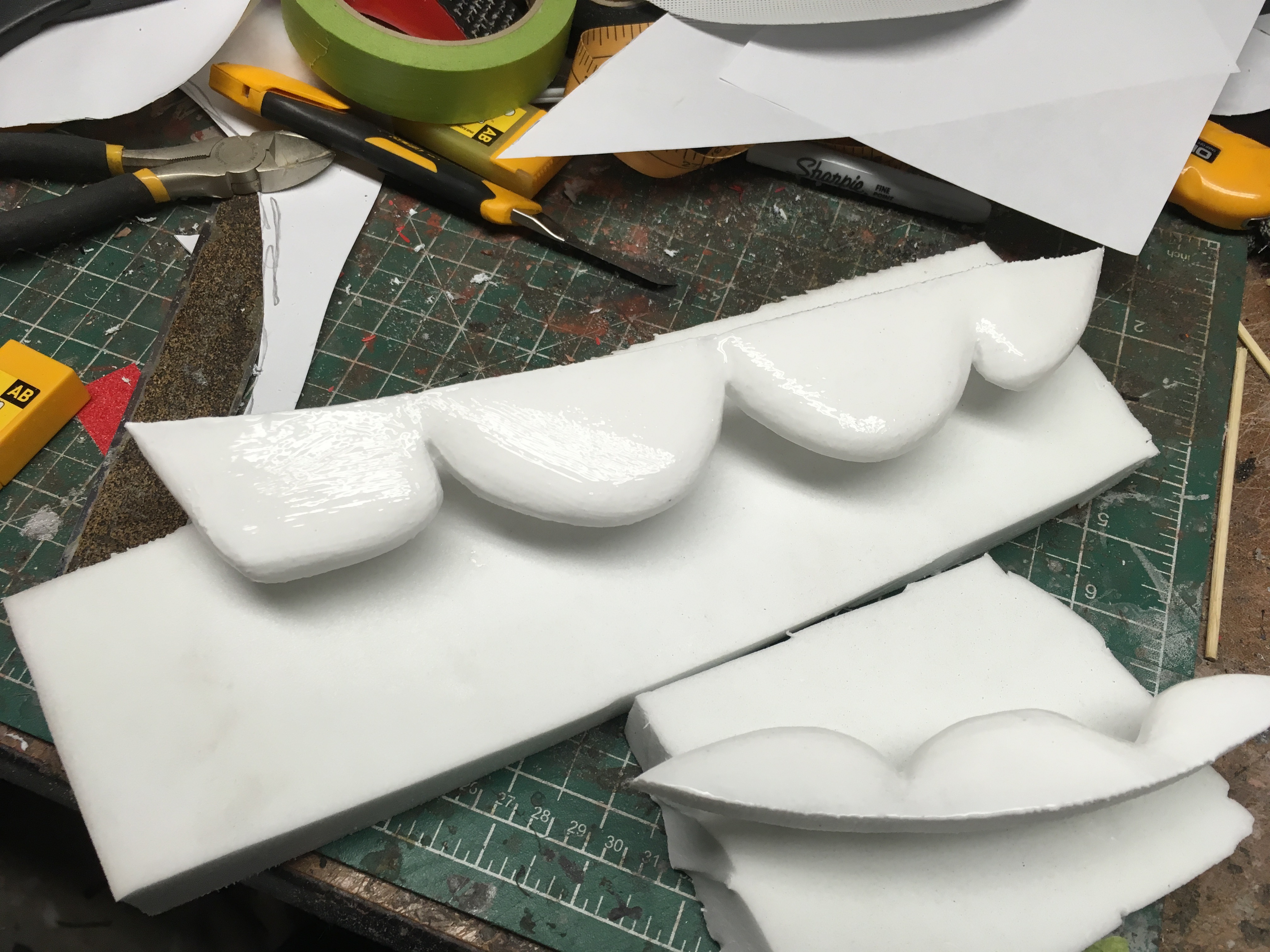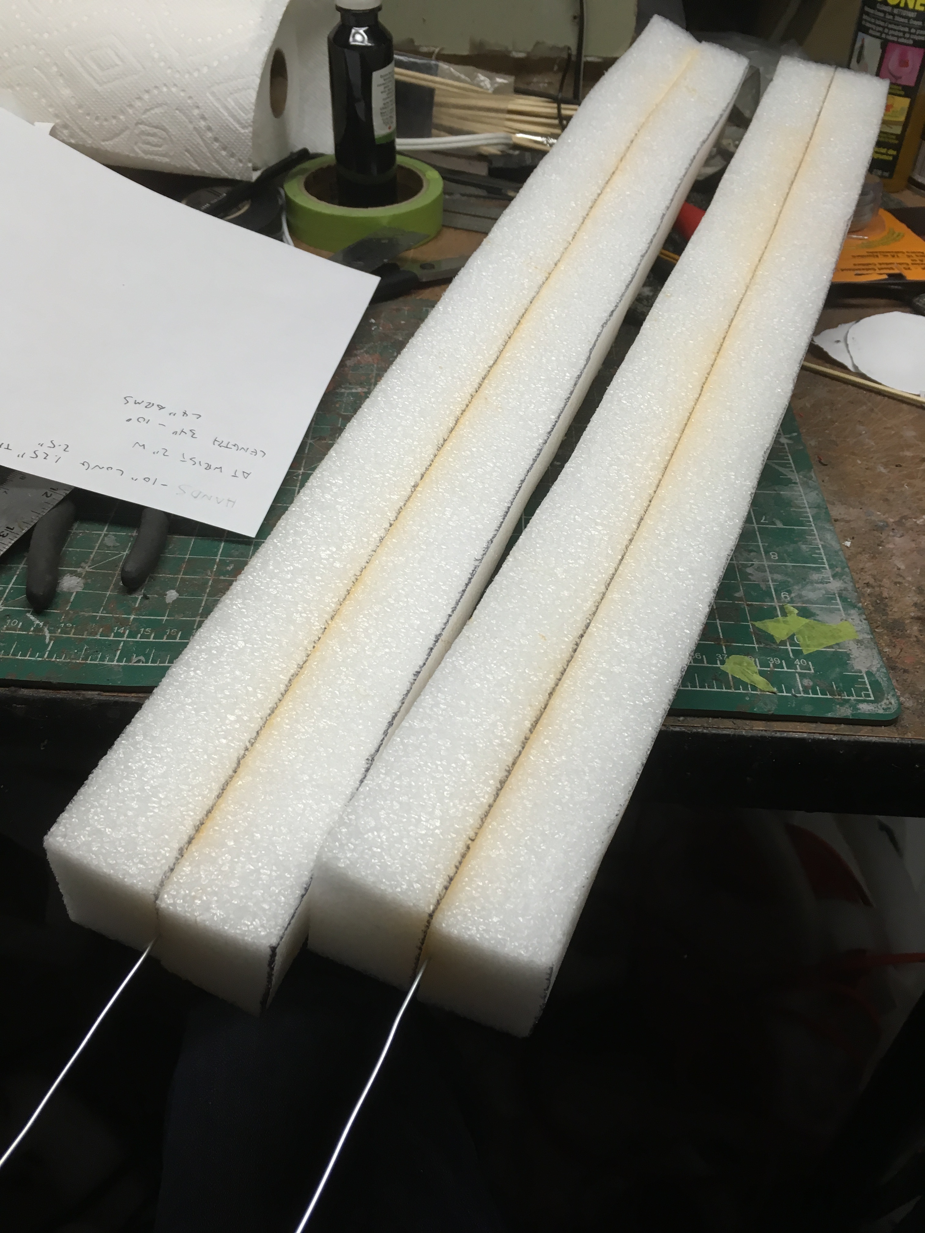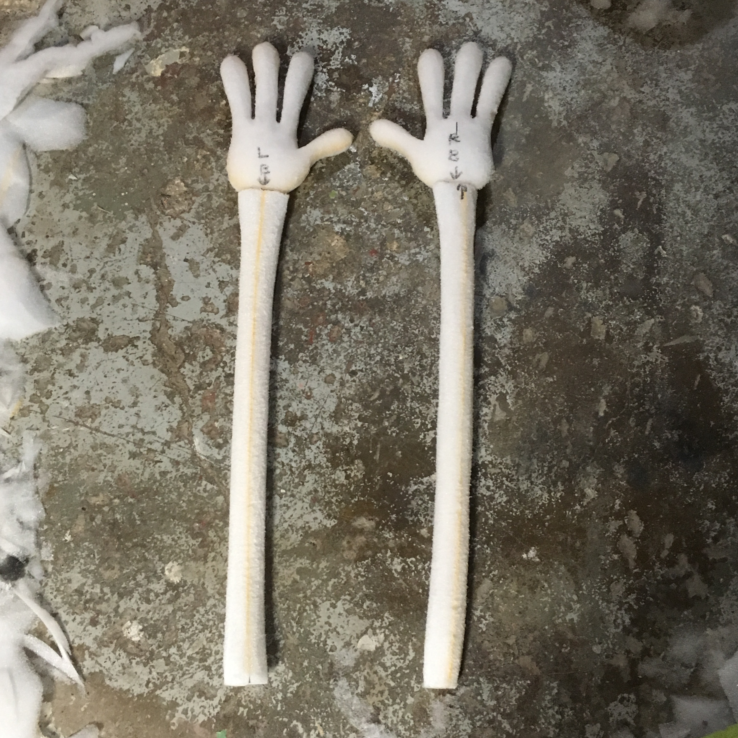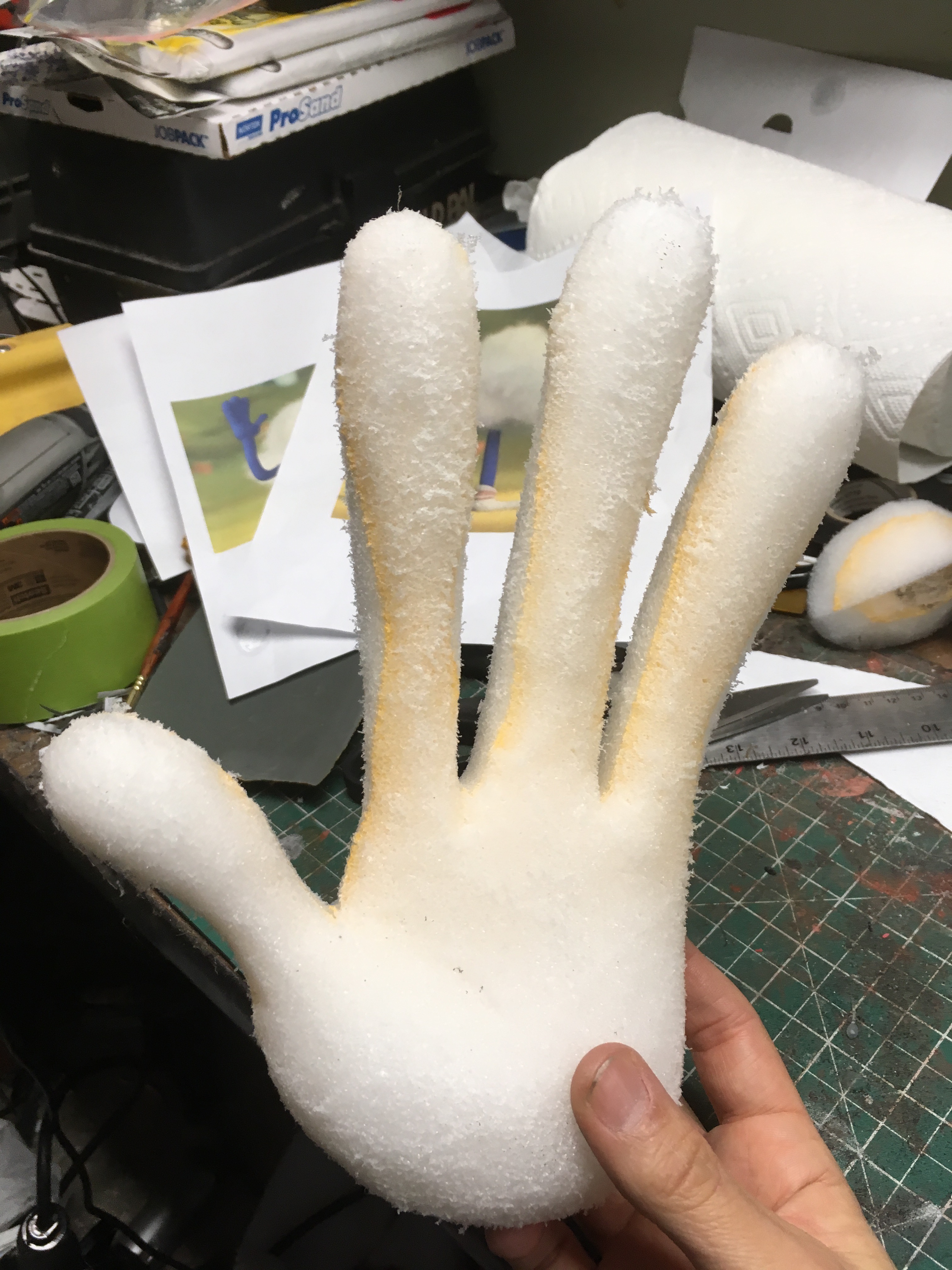 I freehanded the templates in Adobe Illustrator and scaled them accordingly. I glued 2 x1.25" Etha foam together and carved each hand using photos for reference.