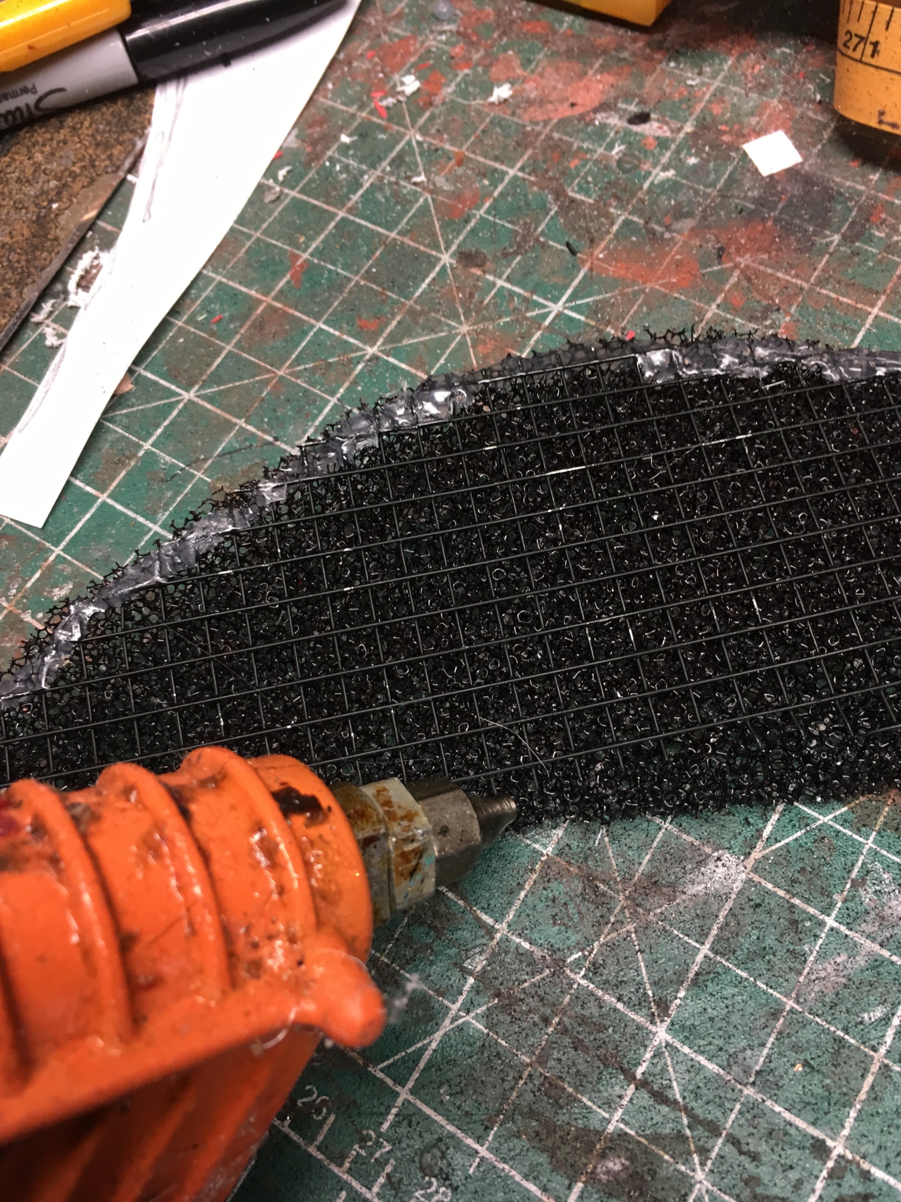 A layer of black protectaire was hot glued the metal screen and the teeth were hot glued to that.