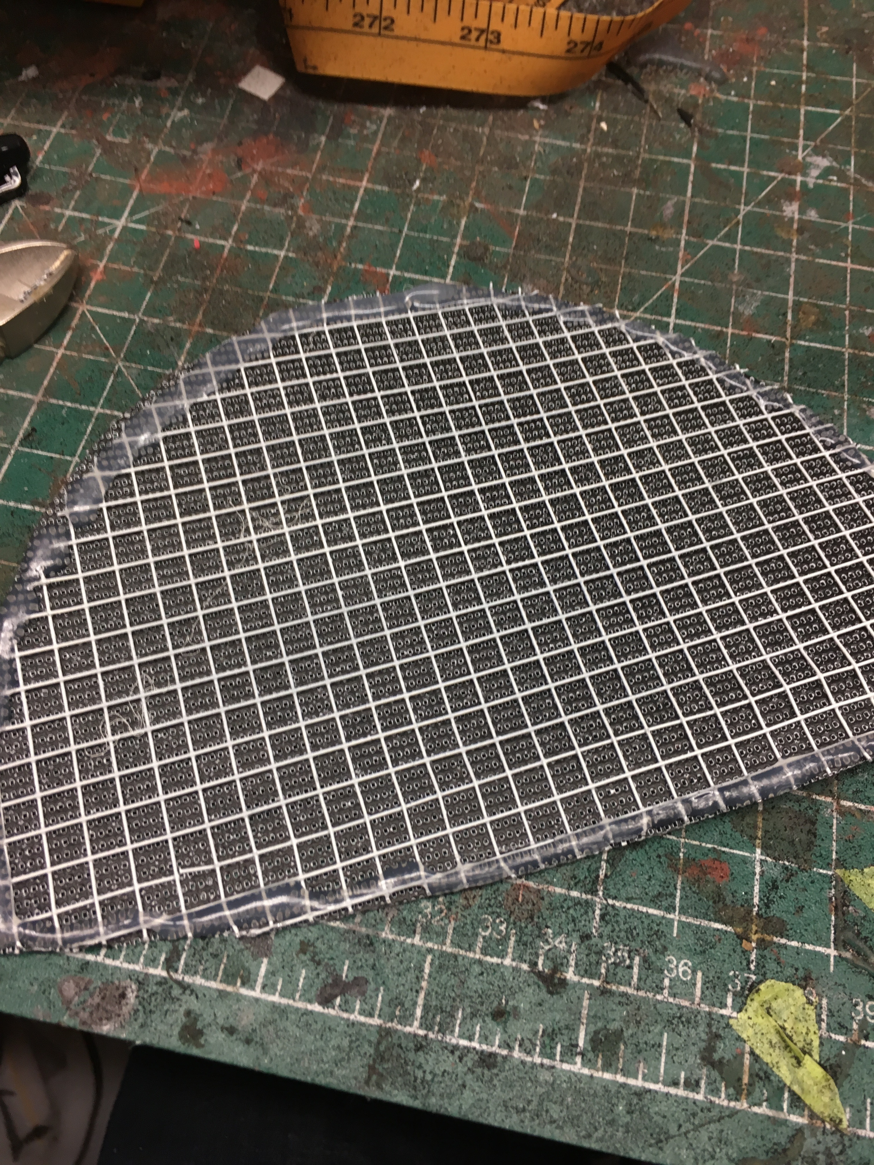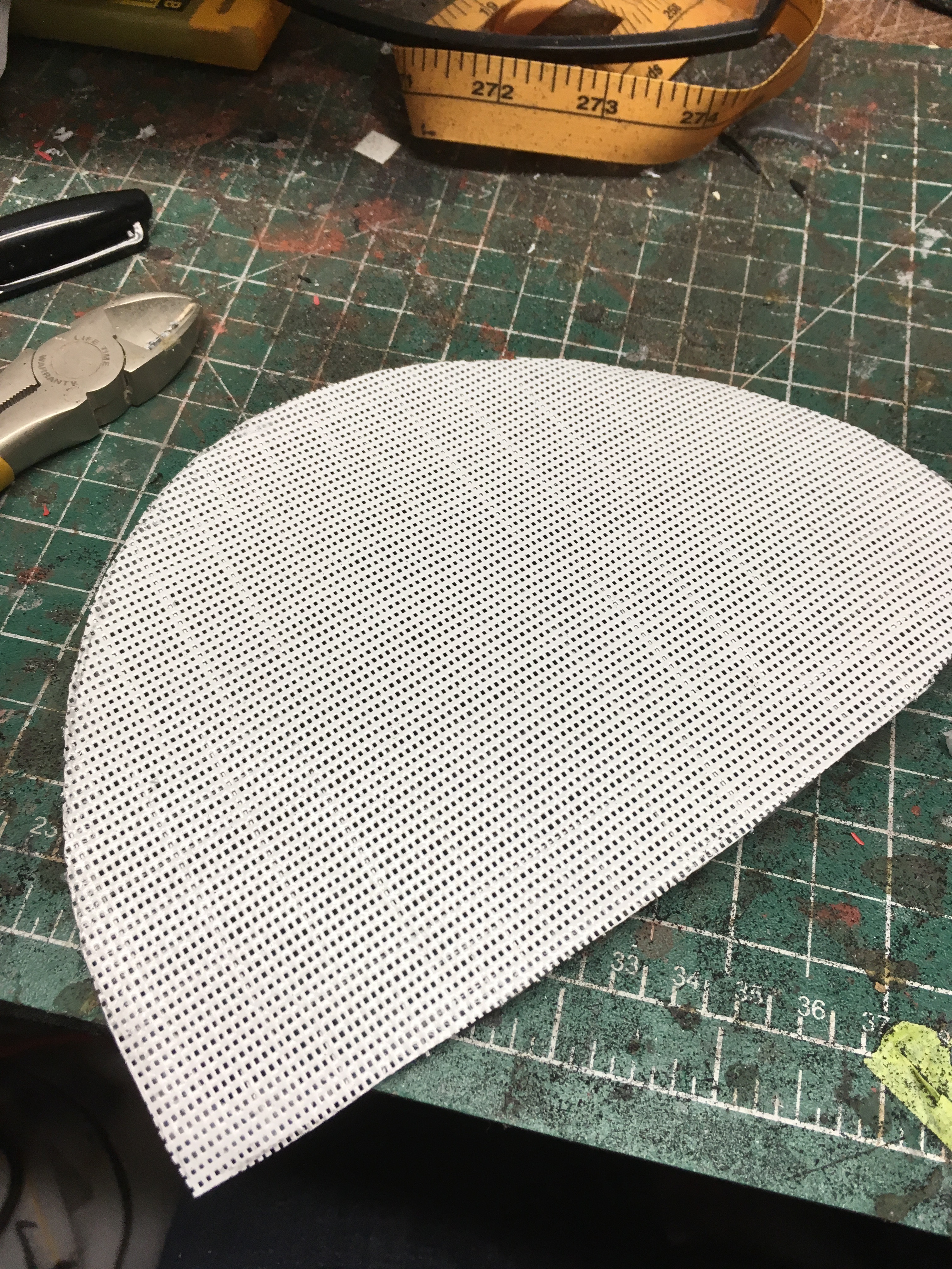 I used hardware cloth (metal screen) as the base layer for both the vision port and the mouth screen. A layer of white aerated fabric was hot glued over the metal screen for the vision port. Once installed, I added a thin veil of batting over the vision port to help make it less conspicuous.
