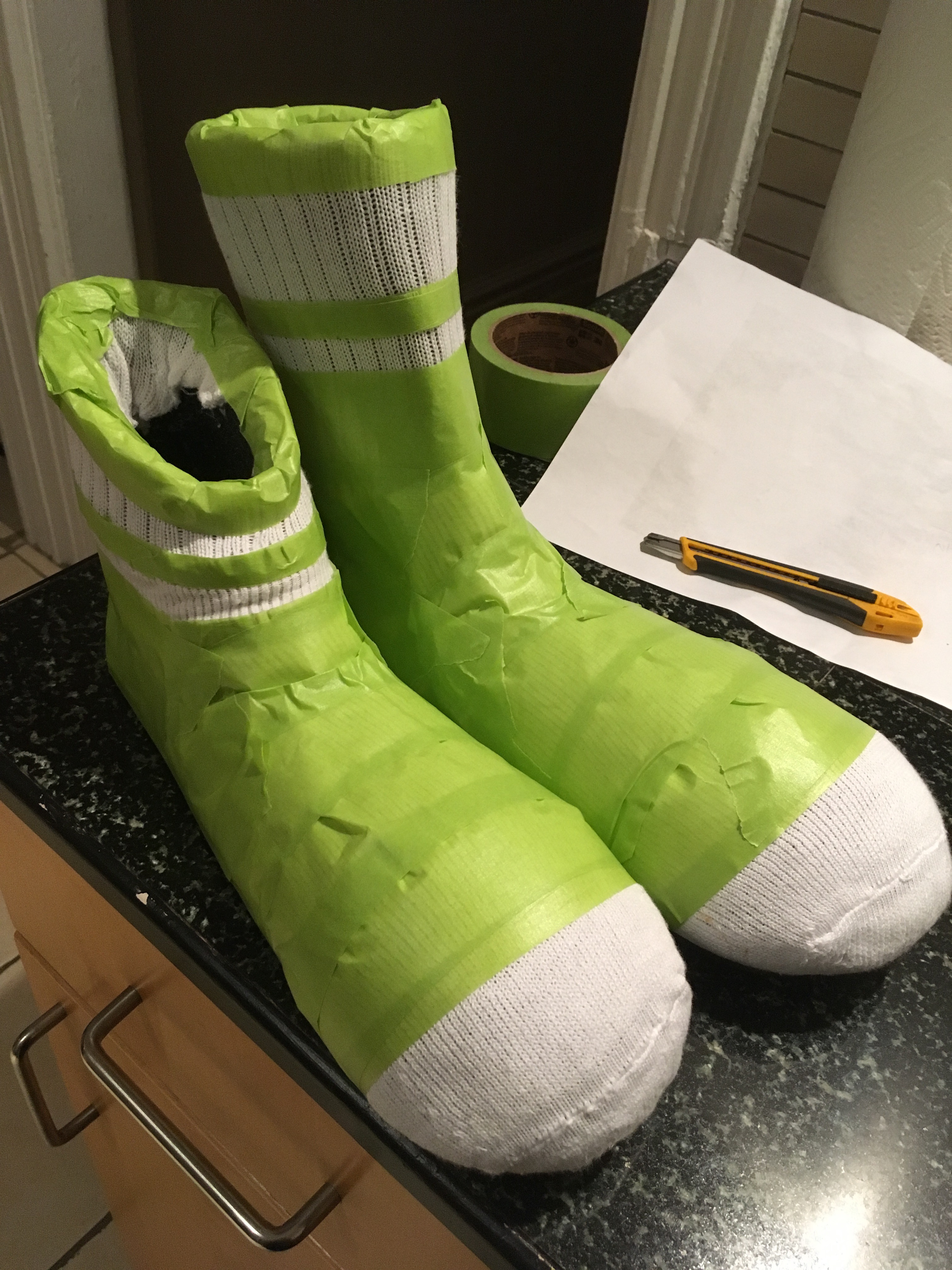 I traced my son's foot so that I could establish the cavity needed for the inside. I then created a paper template of the sock based on reference photos. I had to shorten the overall length of the sock for safety reasons. Walking around in a shoe that was 2-3 times longer than his foot is too much of a tripping hazard, especially on a dark Halloween night.