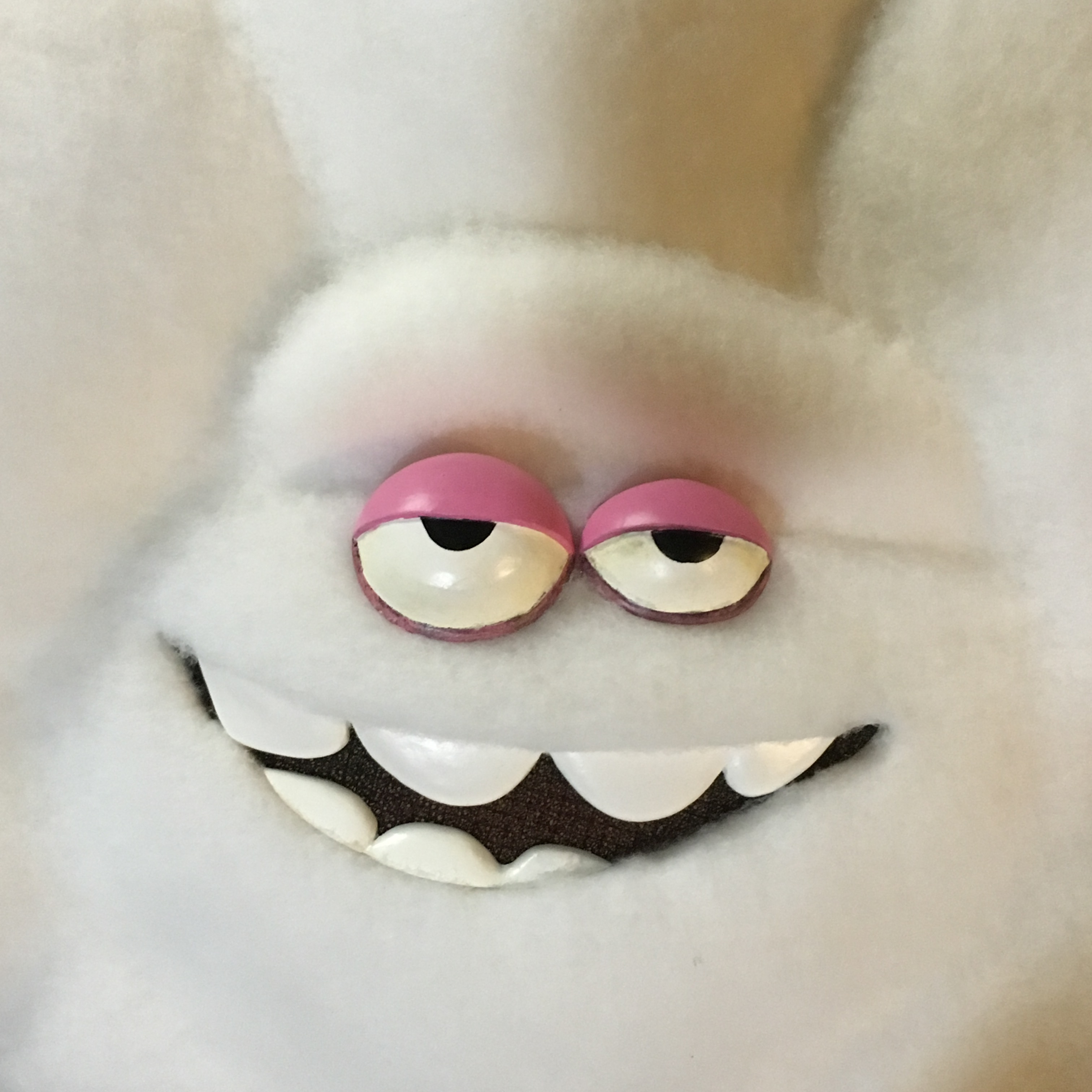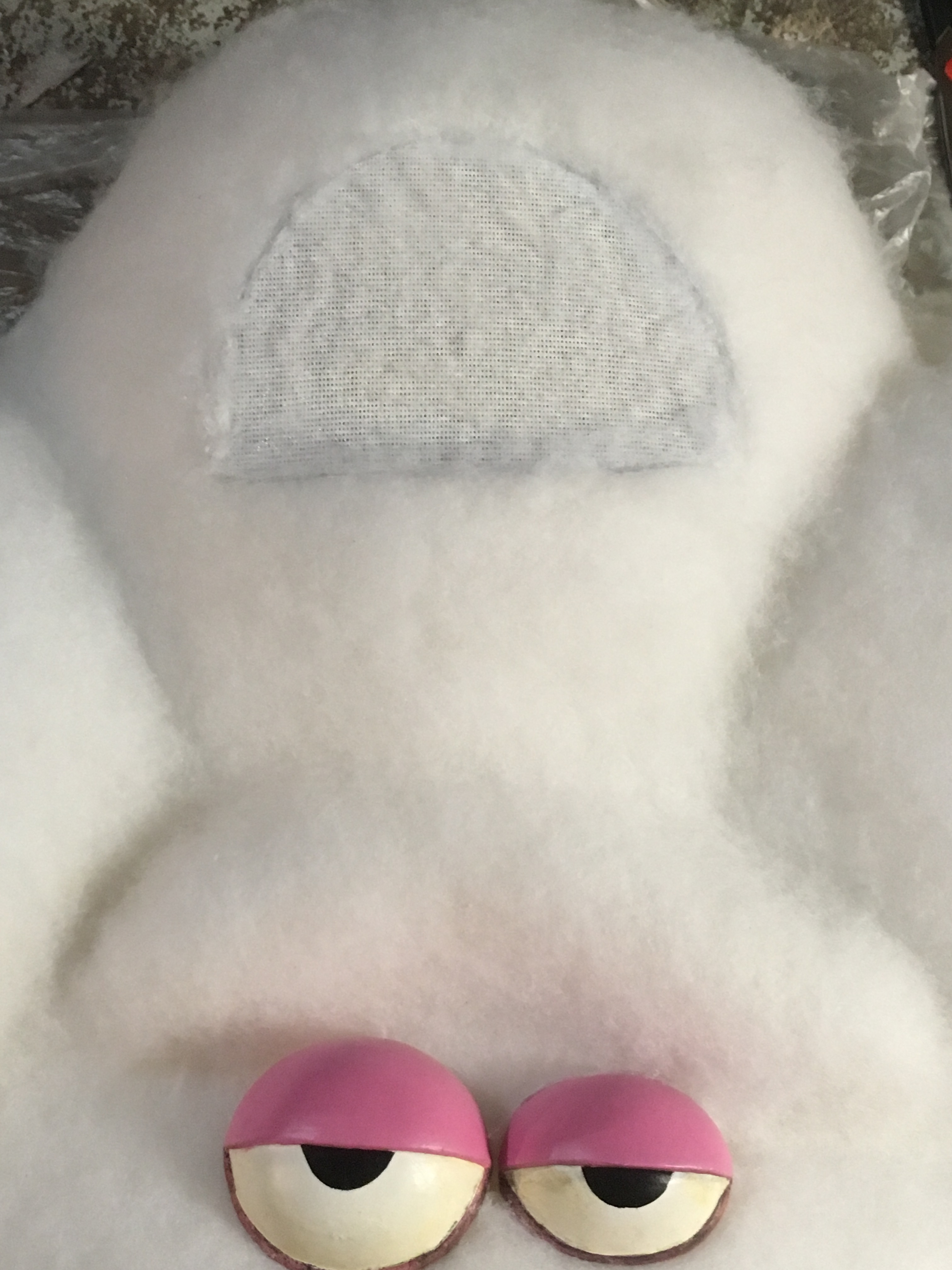 His body is pre-covered using white hermolam (Fleece is fine too) as a base layer. Using spray glue, you lightly spray small sections of the surface and drap ethe fabric over the form, pulling and stretching to conform to the shapes. Repeat the process while tucking the fabric into areas where there is detail. Once the body is covered, it is trimmed, arms and mouth are cut out leaving extra material to be folded and hotglued to the inside of the body.