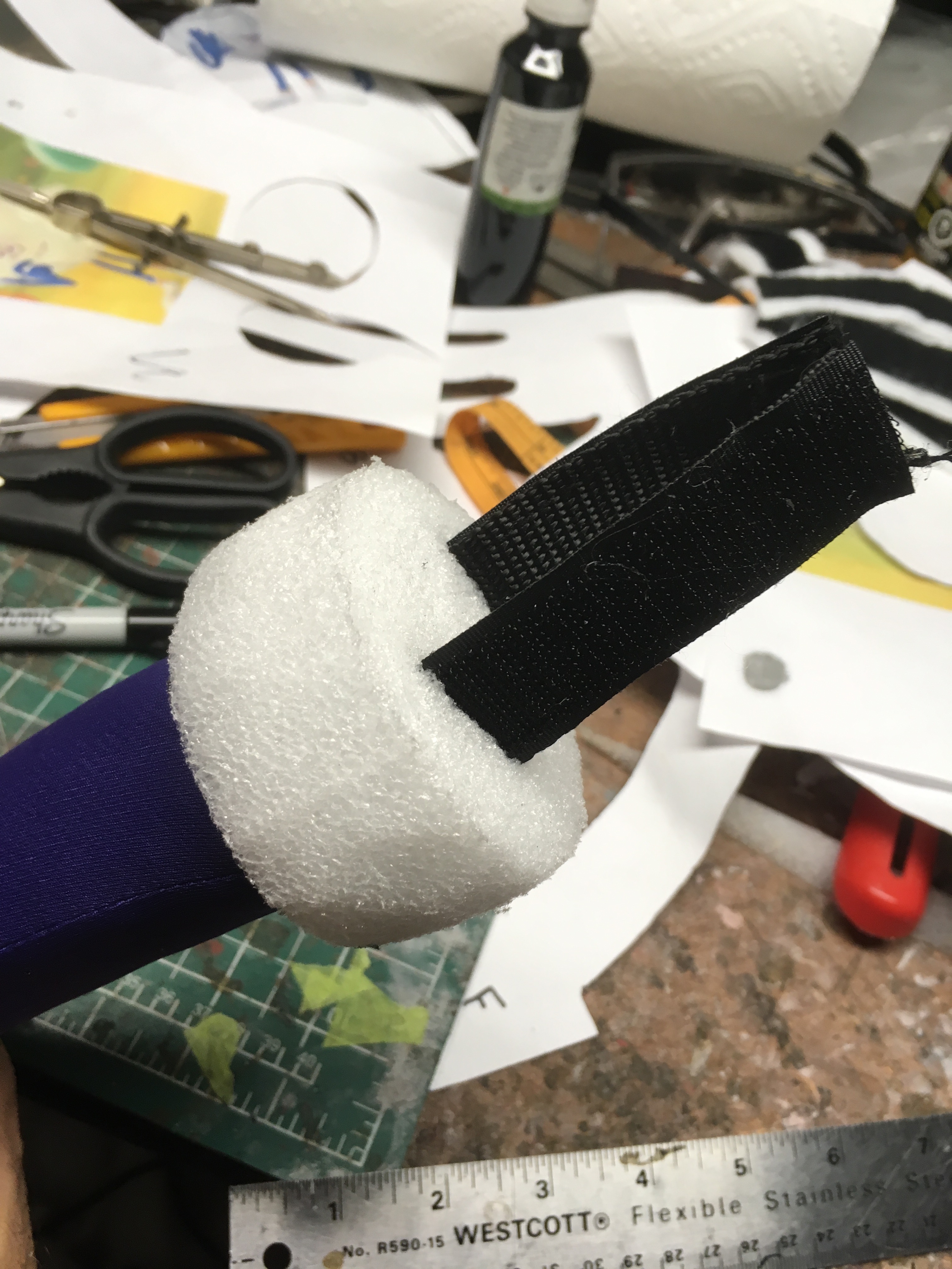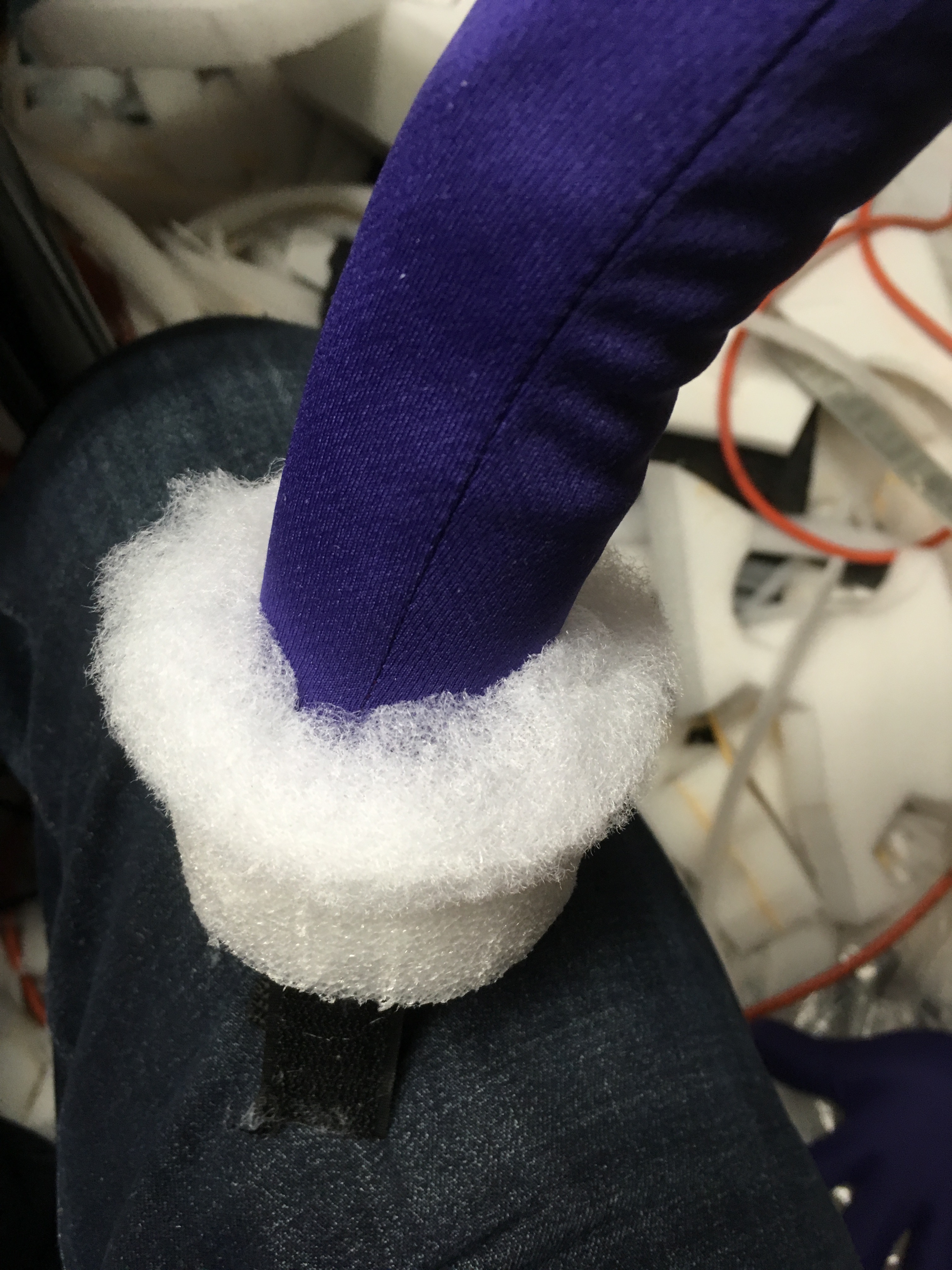 Once the arms were carved, they were covered in spandex by a co-worker. 2 Velcro tabs were added to the ends of the arms and to the inside of the bottom on either side of the arm holes.