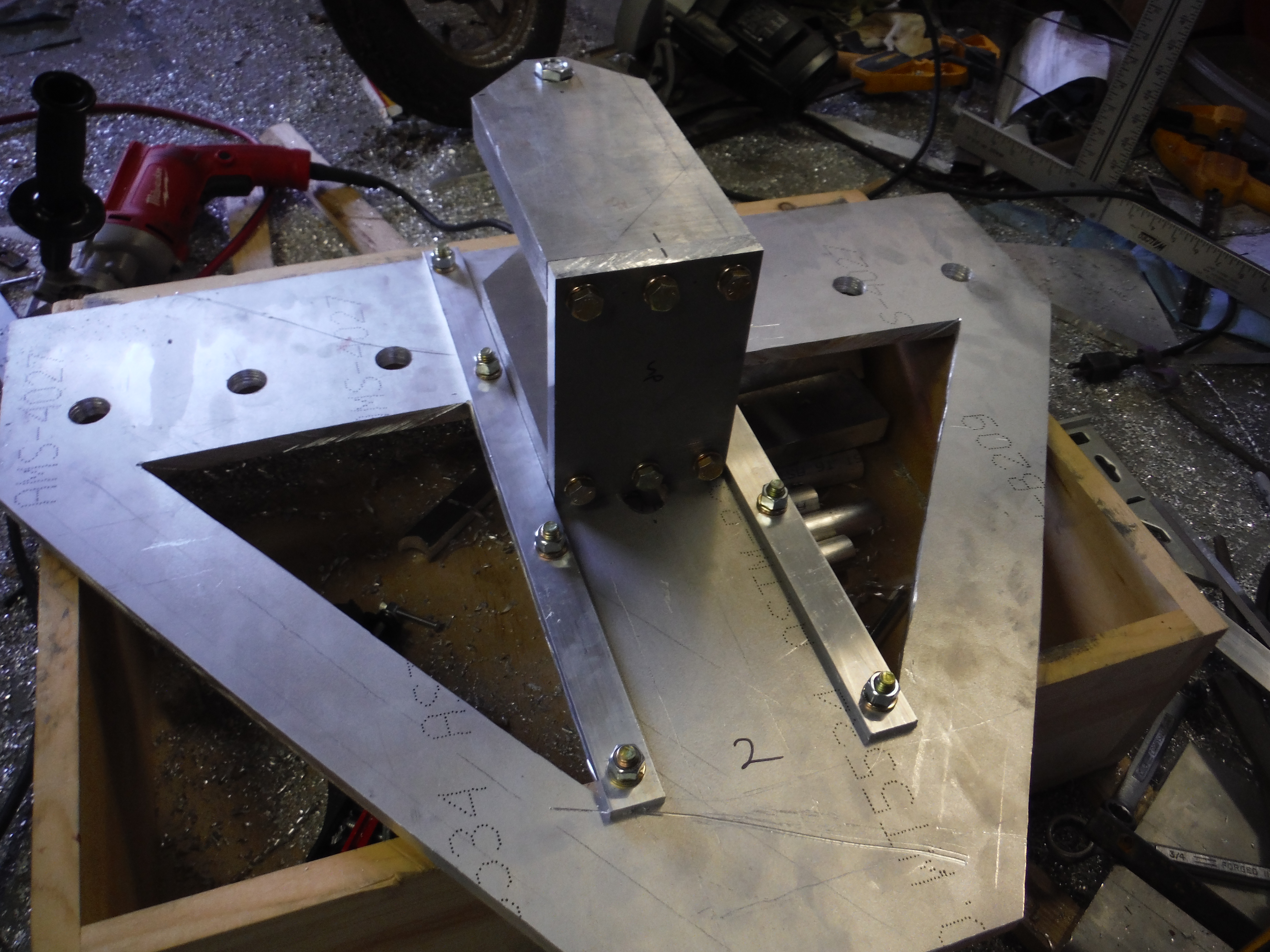 First, use 7/16" bolts to mount the bearings to the side plates as shown in the first 3 images, then mount the side plates to the top plate. Now, use a drill press with a 13/64" drill bit to drill 2 holes 1" deep in each side of the top plate, spaced 2 1/2" apart. Use a 1/4-20 tap to thread the holes, and screw 1/4" by 1" bolts and nuts into the holes. After you screw in the 1/4" bolts, use the nuts to lock them in place.