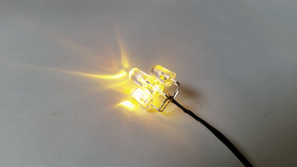 The warm white led gets soldered in underneath the flickering led and then we solder the two 90 degree bent LEDs to either side.