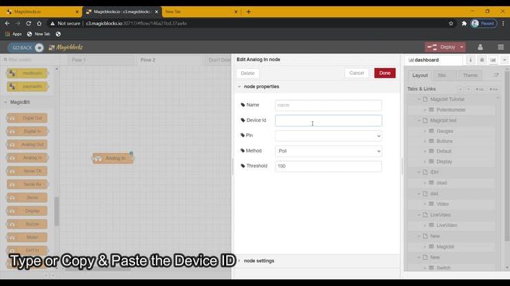 2. Double-click on the Analog In block and type or paste your unique Device id from the Device Manager Tab on your Magicblocks account. [ This will link the digital in with the Magicbit ]