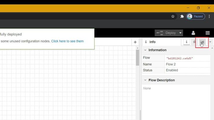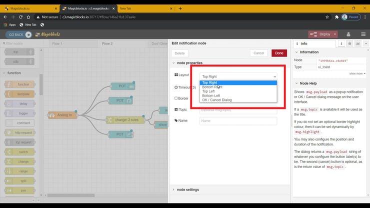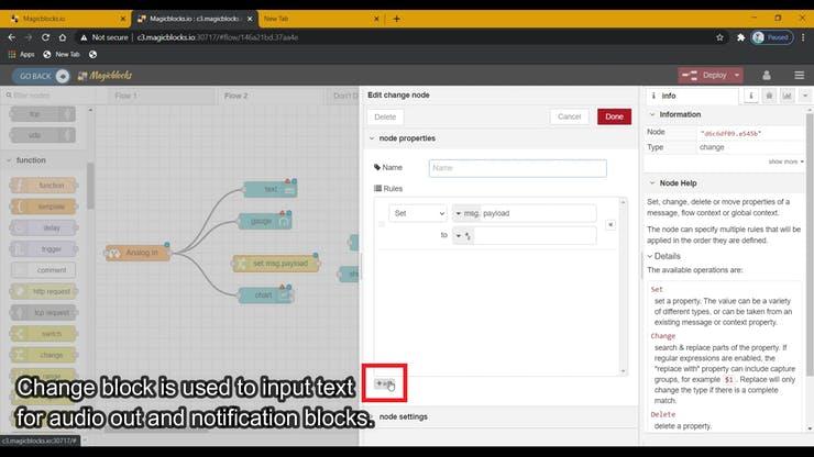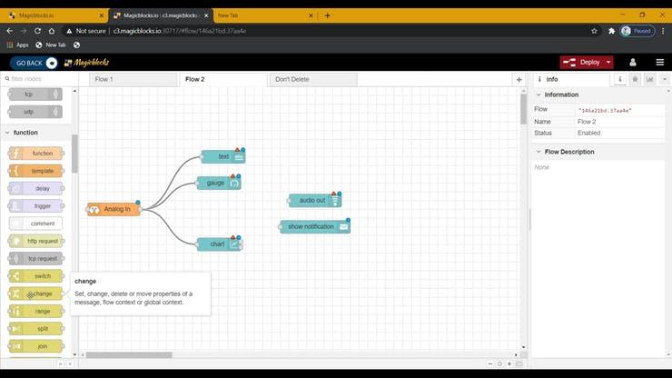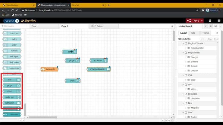 1. Drag & Drop the Text, Guage, Chart, Audio Out, Notification blocks from the Dashboard section on the left of the screen to the Flow.