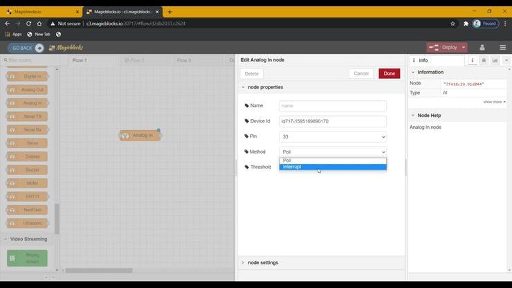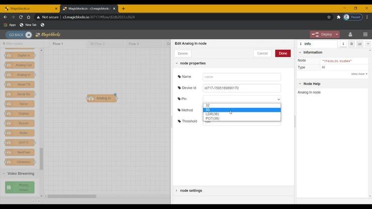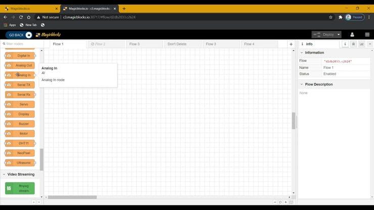 1. Drag & drop the Analog In block from the input nodes section on the left of the screen to the Flow.
