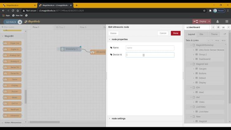 2. Double-click on the Ultrasonic block and type or paste your unique Device id from the Device Manager Tab on your Magicblocks account. [ This will link the Ultrasonic sensor with the Magicbit ]