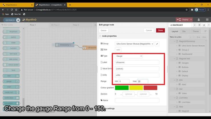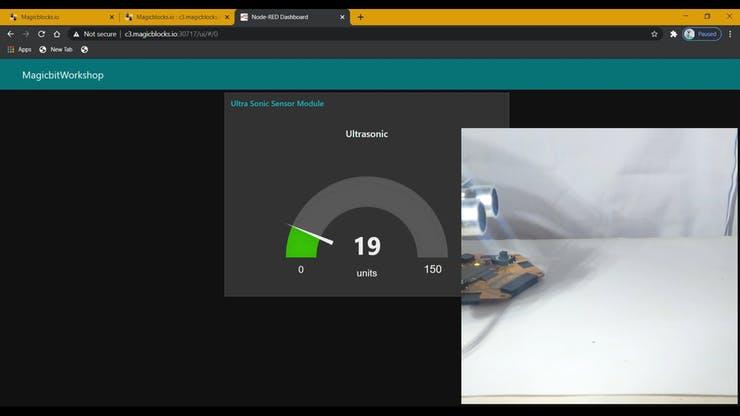 - Interact with the Ultrasonic Sensor to display the change in the Dashboard Gauge.
