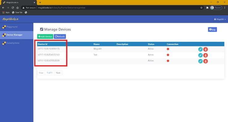 Next make sure your Magicbit is connected to the internet and plugged-in and also linked to your account through Device Manager.