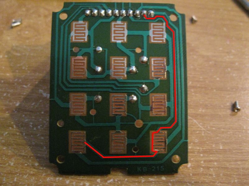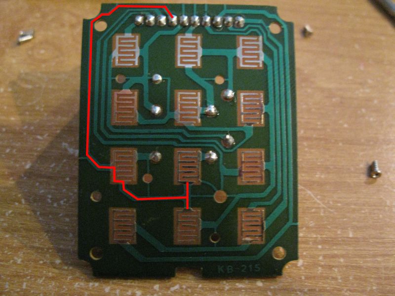 I've got 10 leads, but no idea how they lead to the 12 different buttons. So I have to trace the leads. The images below trace my particular keypad using red lines. Dashed lines follow the jumpers in the back.