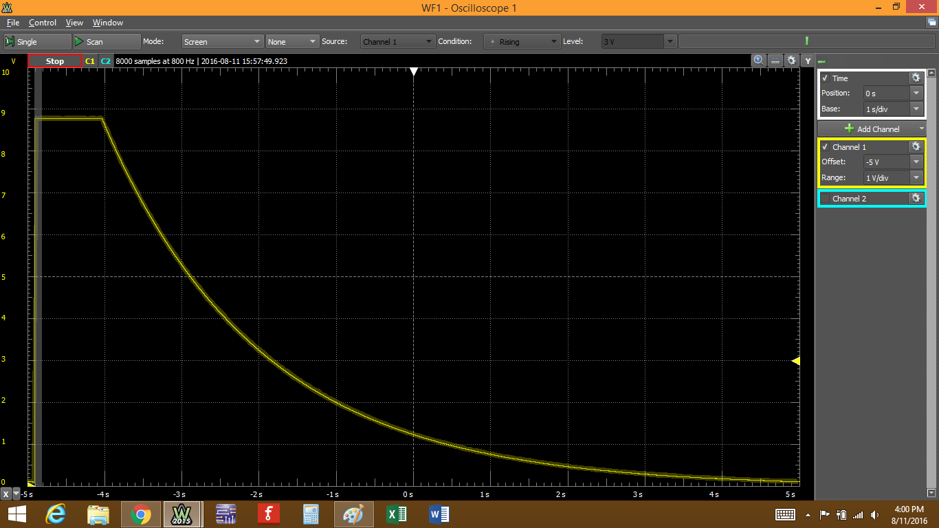 I've also changed the Time base setting to 10ms/div. The goal is to capture the data from the capacitor charging. Make sure your switch is off for at least 20 seconds, then click "Run". The "Run" button should be a "Stop" button and right below it you should see