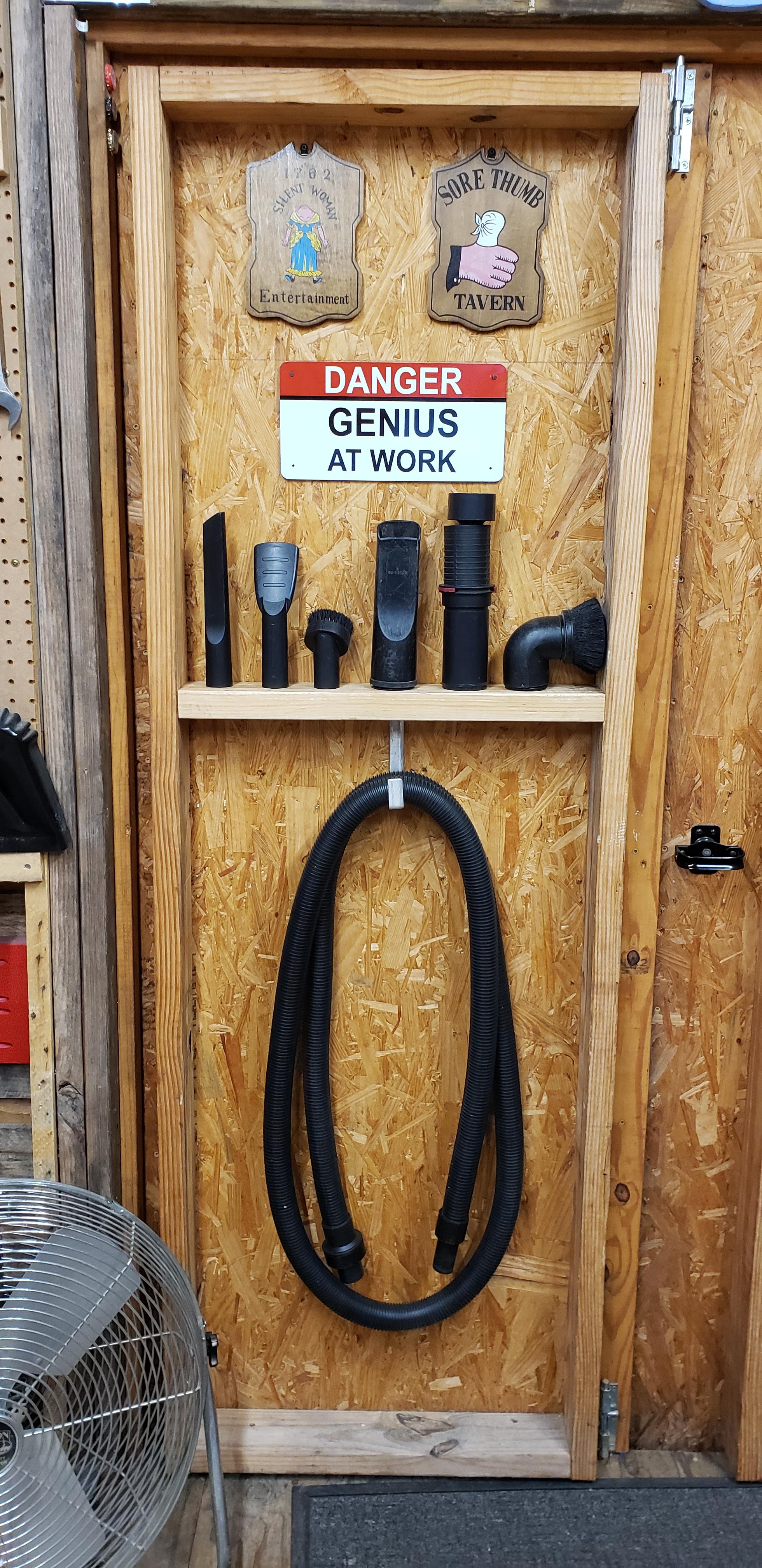 My vacuum tools were all over the place. I had some in a box sitting on top of my ladder, others just lying wherever they landed. Now they are in one place and also easy to get too from outside when vacuuming the cars. This was made with just scrap materials.