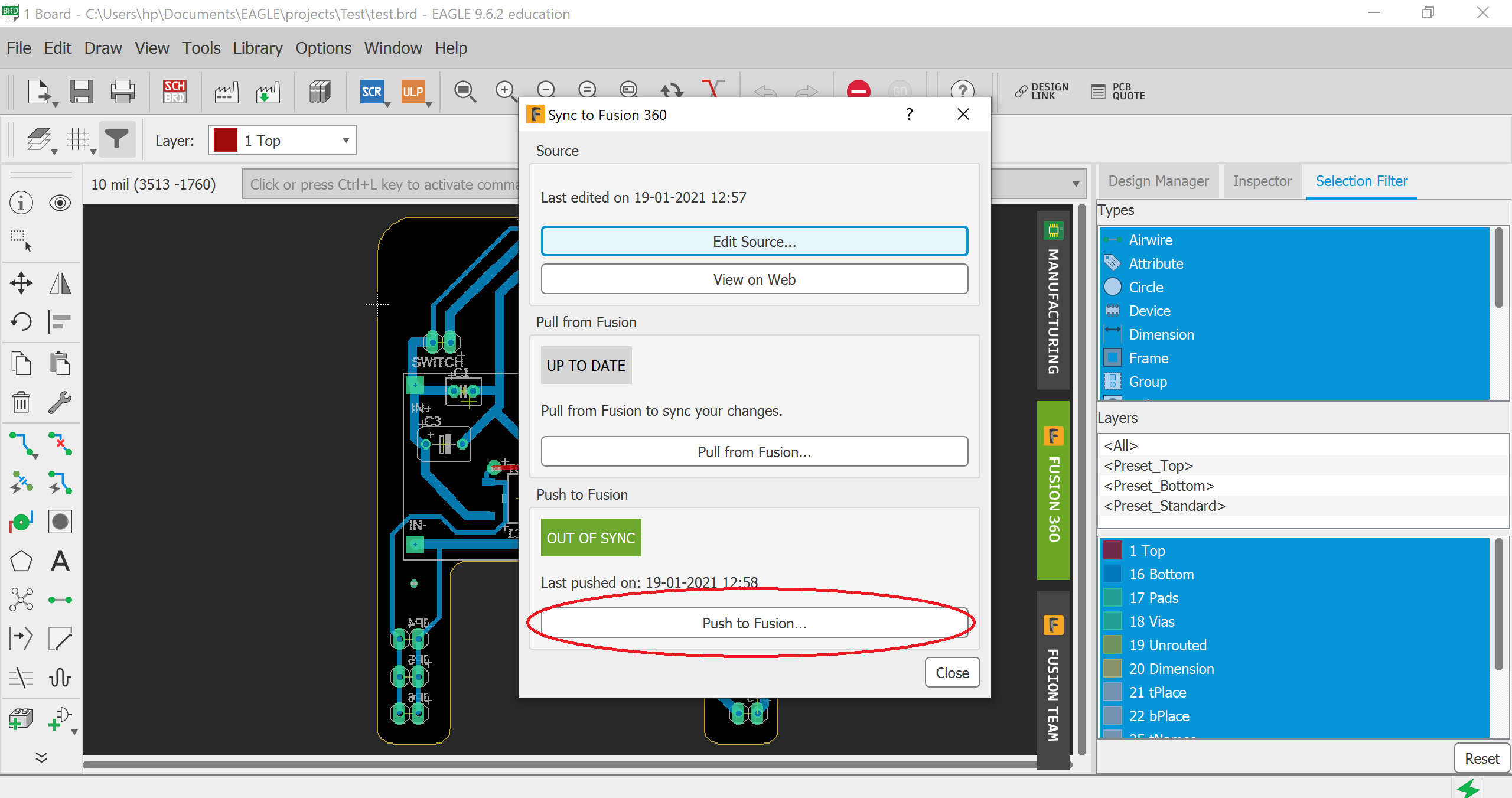 Fusion Sync feature available in the Eagle CAD allows you to directly export the 3D model of the PCB to the Fusion 360 project and also the same 3D model will be refreshed as you work upon it later.