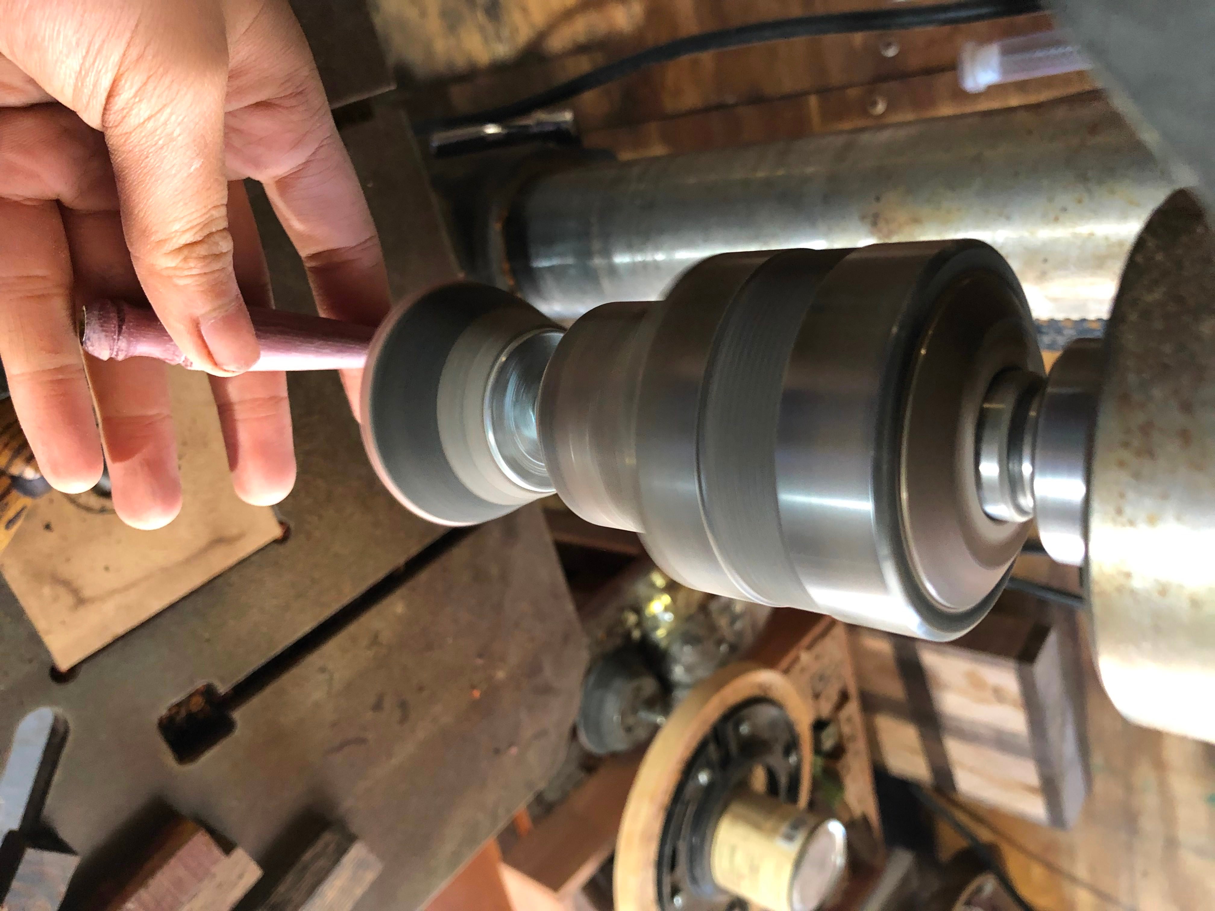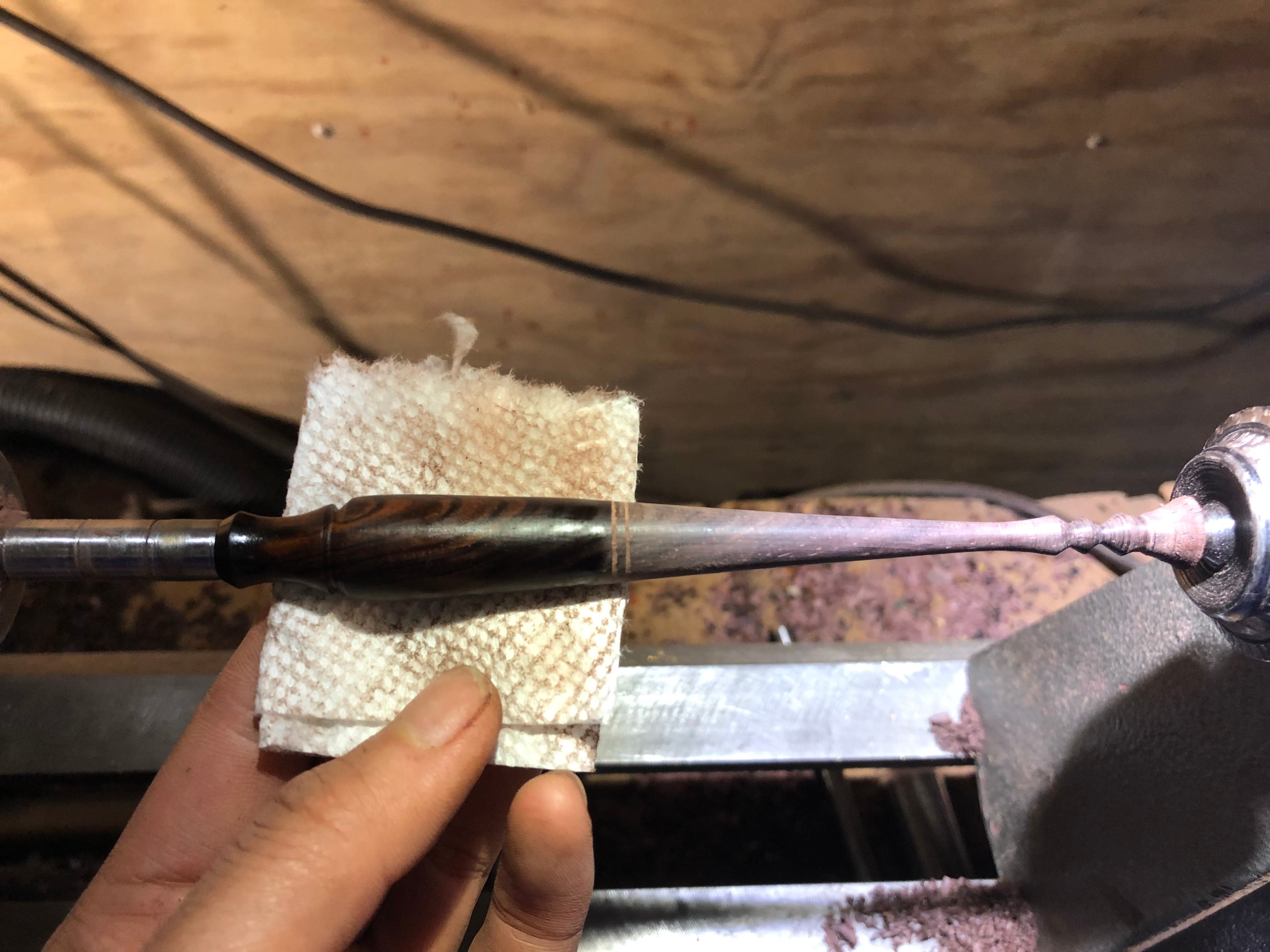 To do this, I mounted a sanding wand in the chuck and used corresponding sanding pads to smooth out the jagged end. Again I used the same grits, up to 400 grit, before wiping with oil.