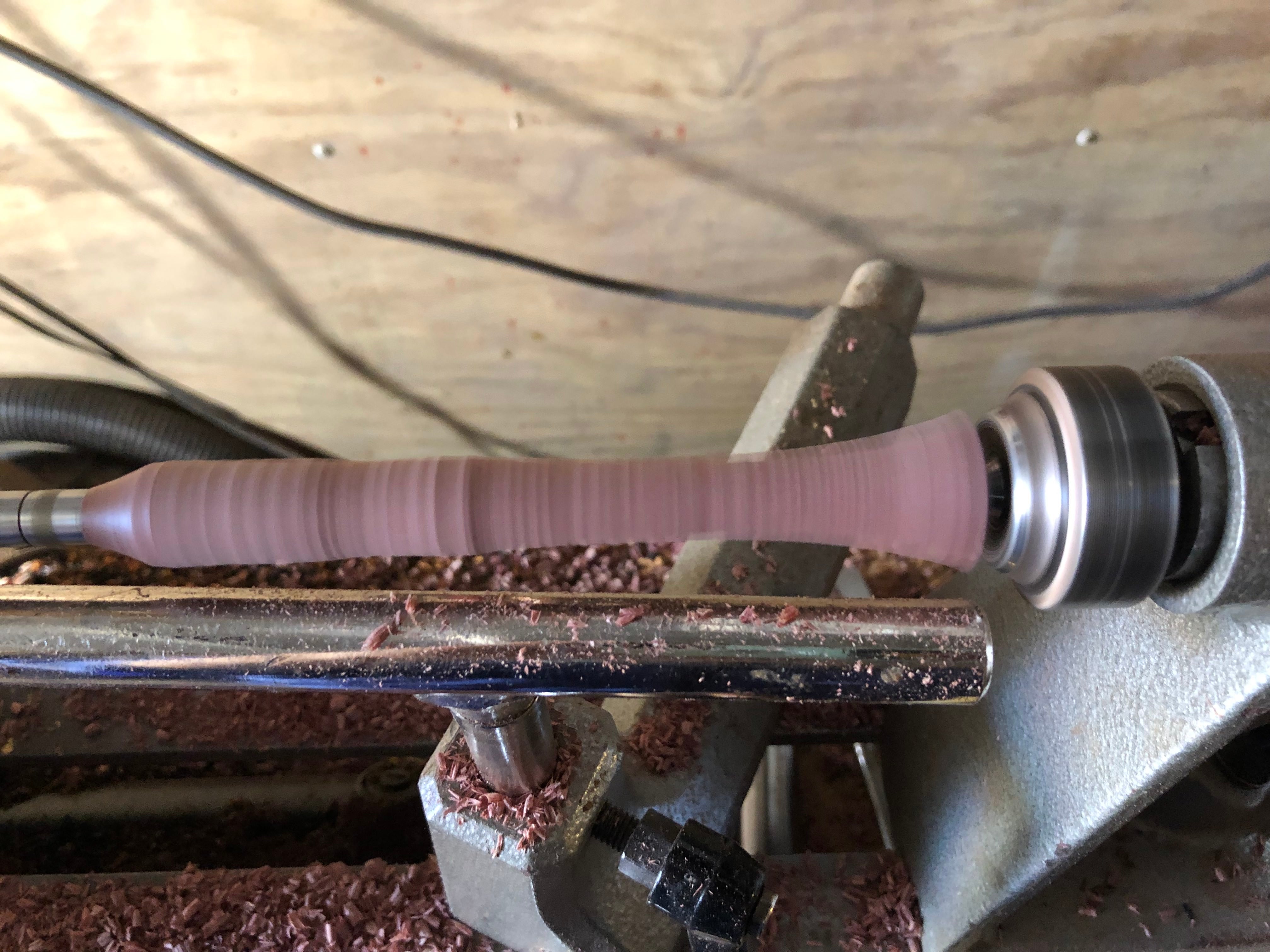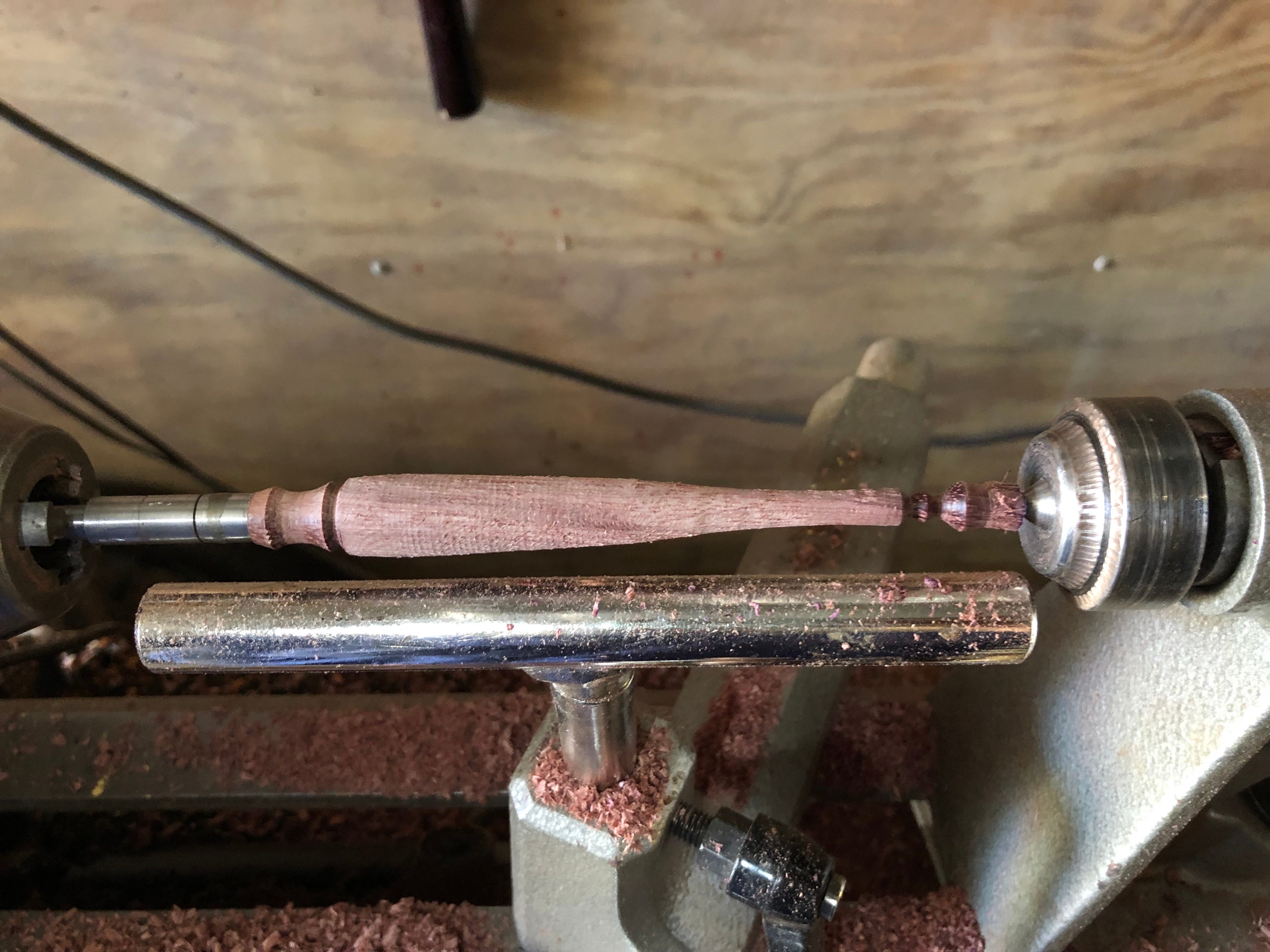 While turning the long section, you'll want to cut slowly and not too deeply. If you cut too deeply and your tools cause the wood to shift at all, that would throw off your centricity and cause you to cut off-axis. It might look fine when you take the wood off the lathe, but it would manifest when you put the top on your slimline pen and you notice the tip isn't straight. Rough out your shape slowly, and turn up the speed as necessary to avoid catching on the wood. Be especially careful while using a spindle gouge to make deep cuts. The wood may "chatter" as you get thinner and thinner: this will cause uneven grooves in your wood from it flexing. To avoid this, go slowly and if it gets too bad, consider using a steady rest if you have access to one. This shouldn't be needed if your wood is less than ~6in long.
