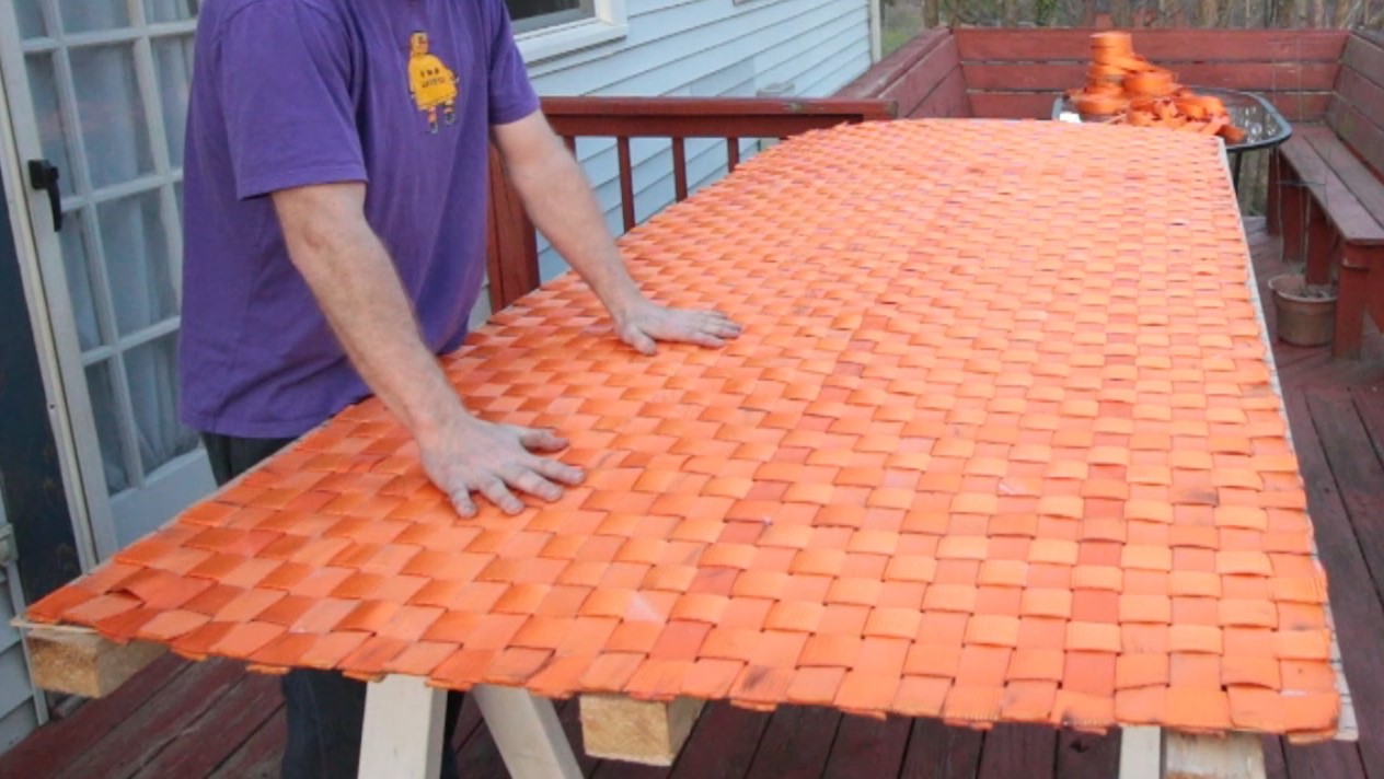 I cut all my pieces before weaving. I decided to make my blanket the size of a 4 foot x 8 foot sheet of plywood. One of the lessons I learned while making the mat was that it was hard to trim the ends with just a little extra length sticking out. I went with about 6 inches on all sides. This gave me plenty to hold on to while trimming. I used (28) 9 foot long pieces and (55) 5 foot long pieces.