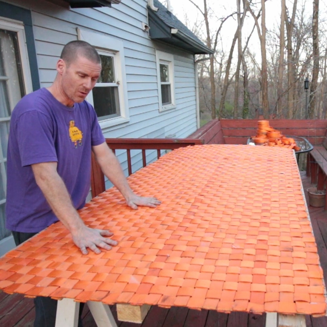 I put the long pieces down first. Using my marks on the plywood I put down every other long strap. Using the marks on the sides of the plywood, I put down every other short piece. I then put down the rest of the long pieces. This saved me a bunch of the weaving process because I only had to weave in every other short piece.