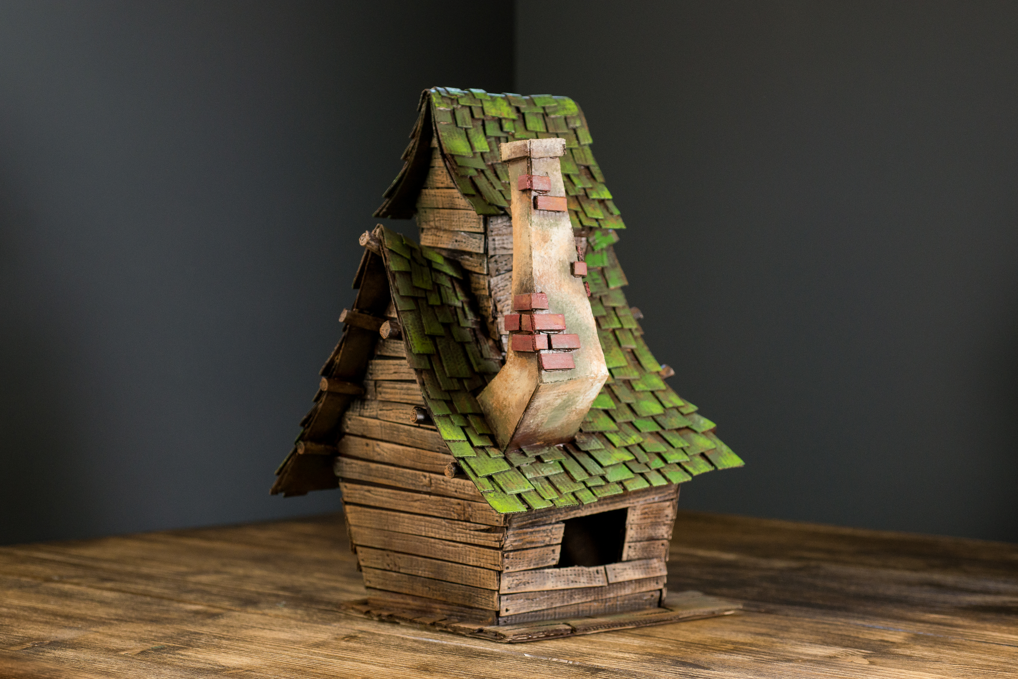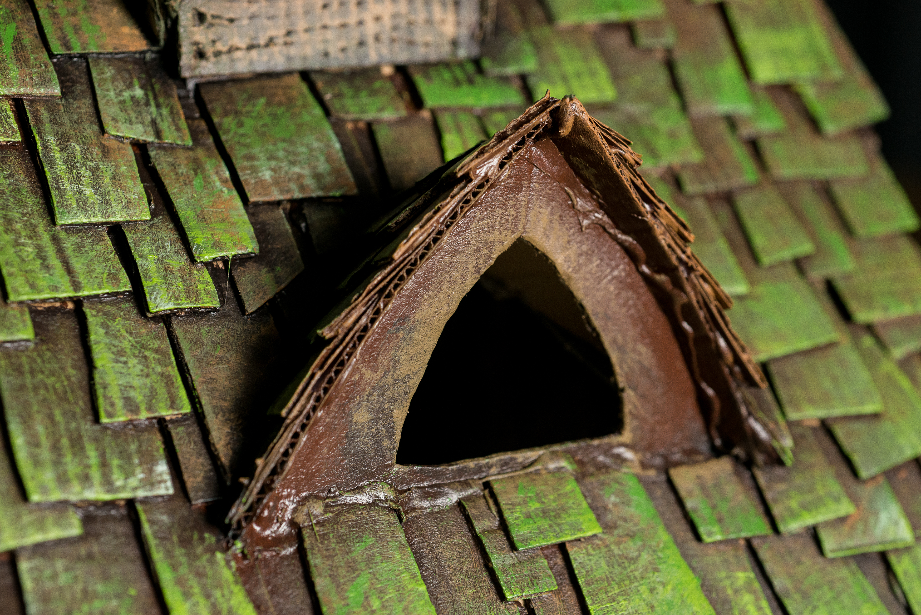 When the basic details were finished I started adding the smaller details like roof tiles and small wooden boards all over the surface of the house. For the tiles I cut small rectangular cardboard pieces. I used pizza boxes for those because the cardboard is thinner. For the roof tiles you always want to start from the bottom and work your way up. This is the most time consuming step but, I would recommend you take your time and do this right. The roof is a big piece of the house. Visually you first see the roof and its textured surface so don't rush and make big tiles just to finish sooner. Do this step right and you will end up with an amazing little house. For the wooden boards I used a thicker cardboard. I tried to place them in a crooked manner to make the witch house look realistically old and messy. I also left little spaces between them in some areas so I get a more realistic effect.
