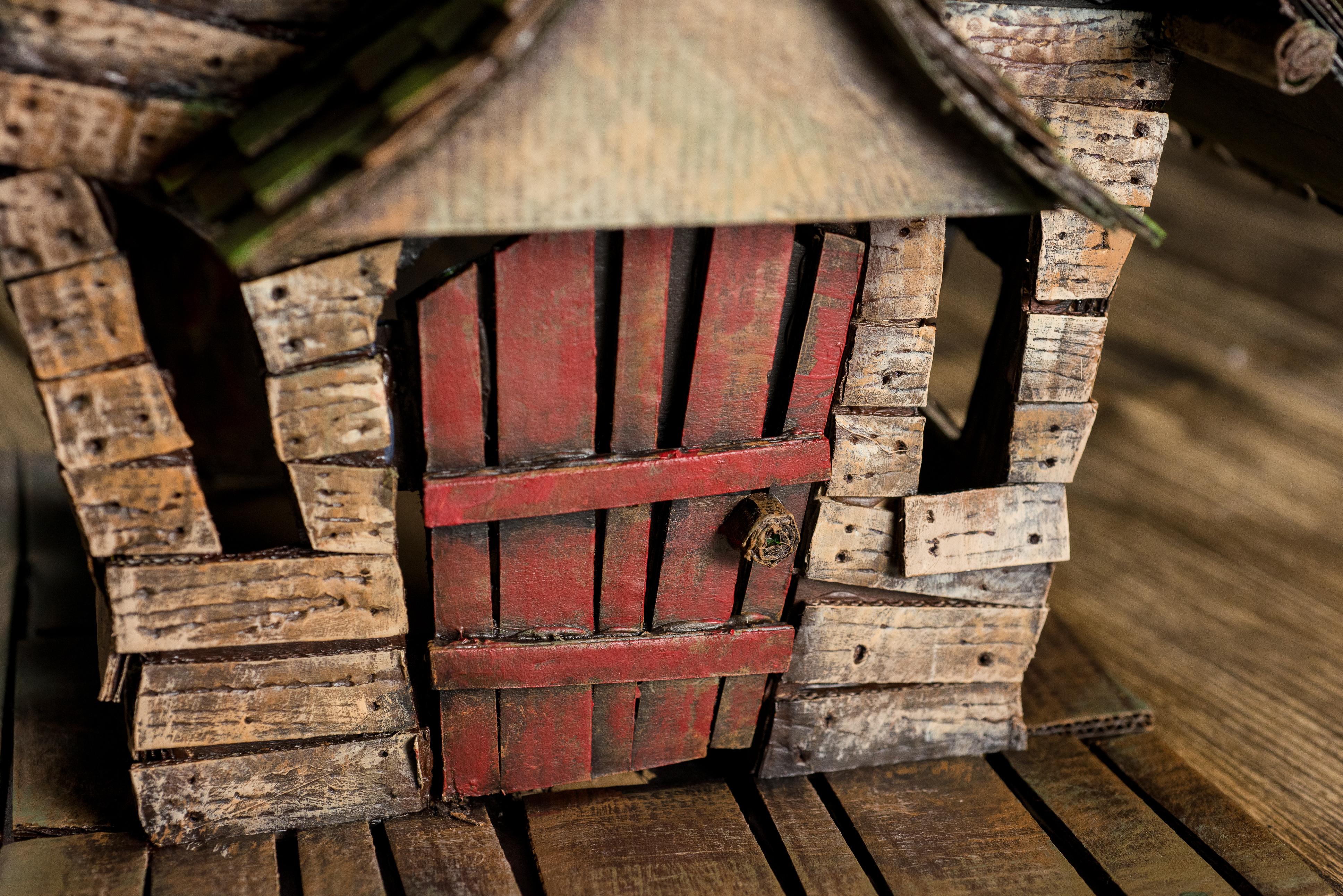 I made the textured wood using a ball pen and pressing the wooden pattern deep in the cardboard. I also made some holes in the cardboard for each wooden board so it looks like it has little nails. This texture adds such a nice realistic effect and it helps a lot in the next step when adding color and patina. I added some bricks to the chimney and also made flooring on the porch. I made some small wooden boards for the door as well and used a little piece of craft foam for the hinges.