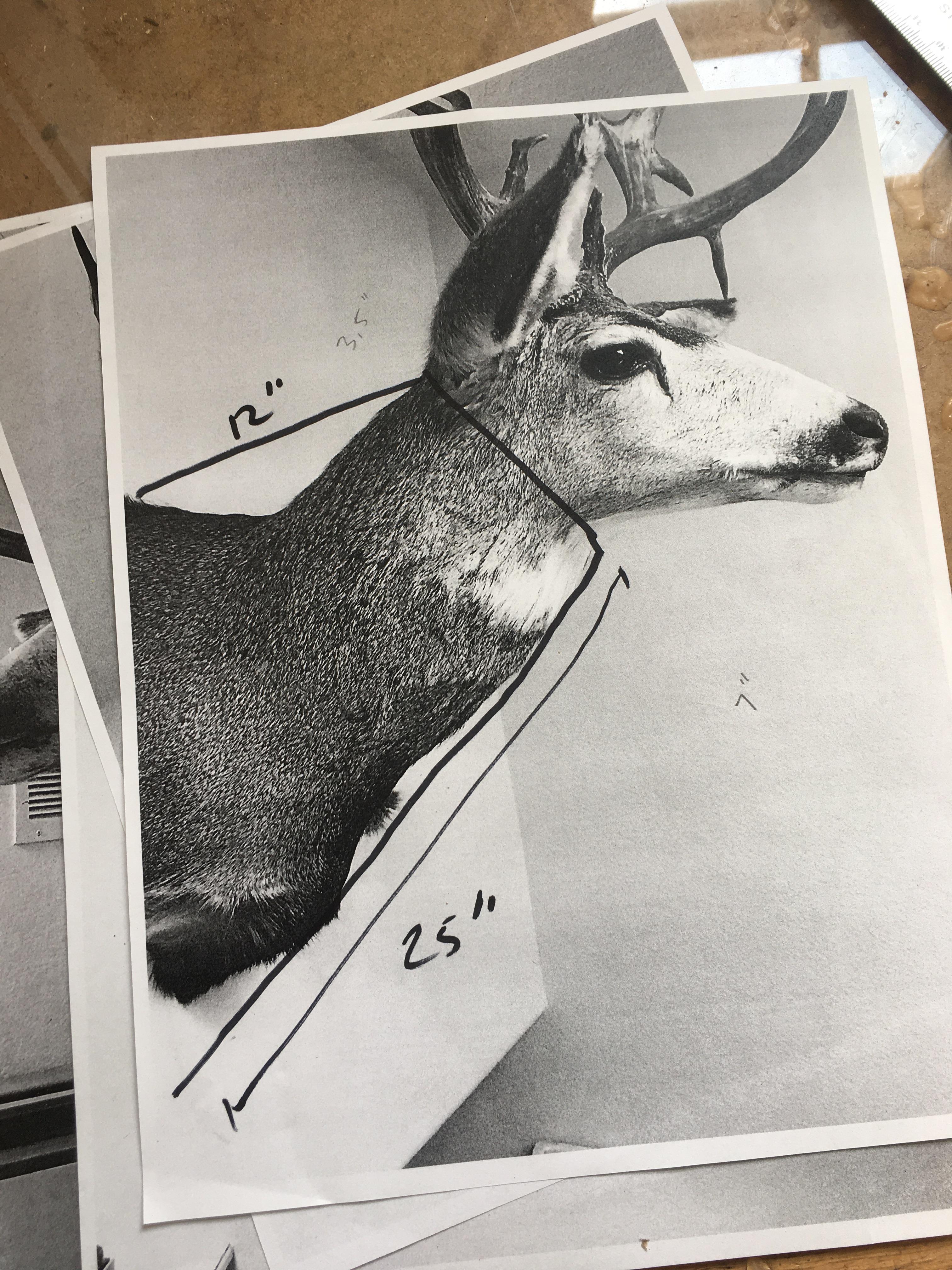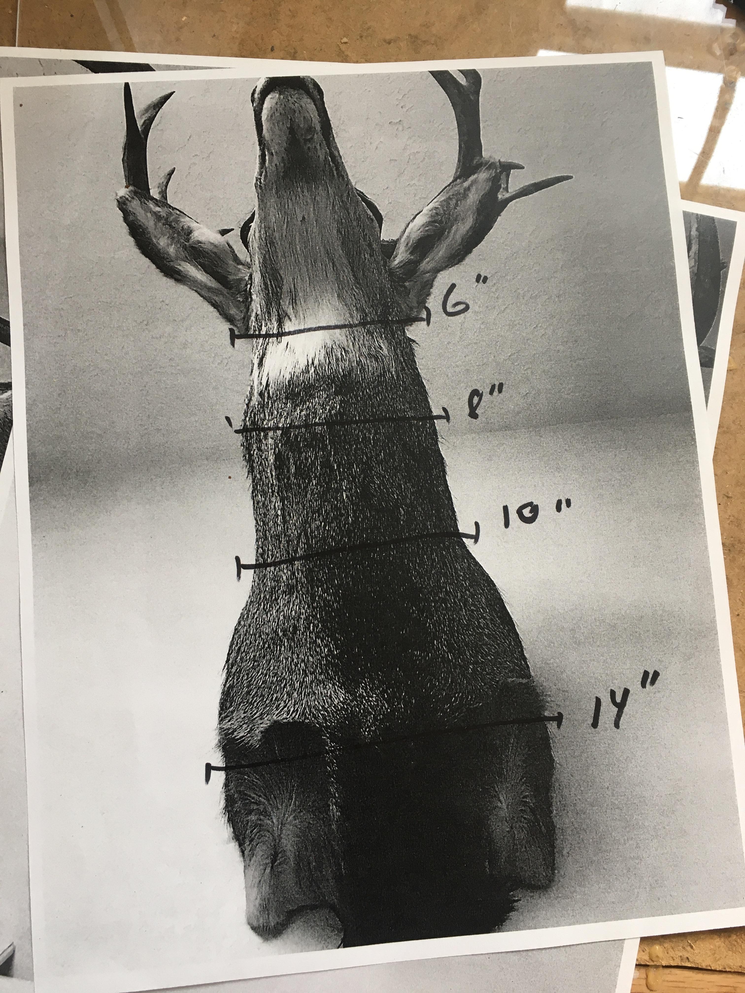Print out you pictures and mark up with your actual deer head measurements. The neck measures taper down dramatically down to the head. By using algebra (useful for the first time in my life), you can convert these measurements into inches and find other needed measurements, such as the line connecting the neck to the head.