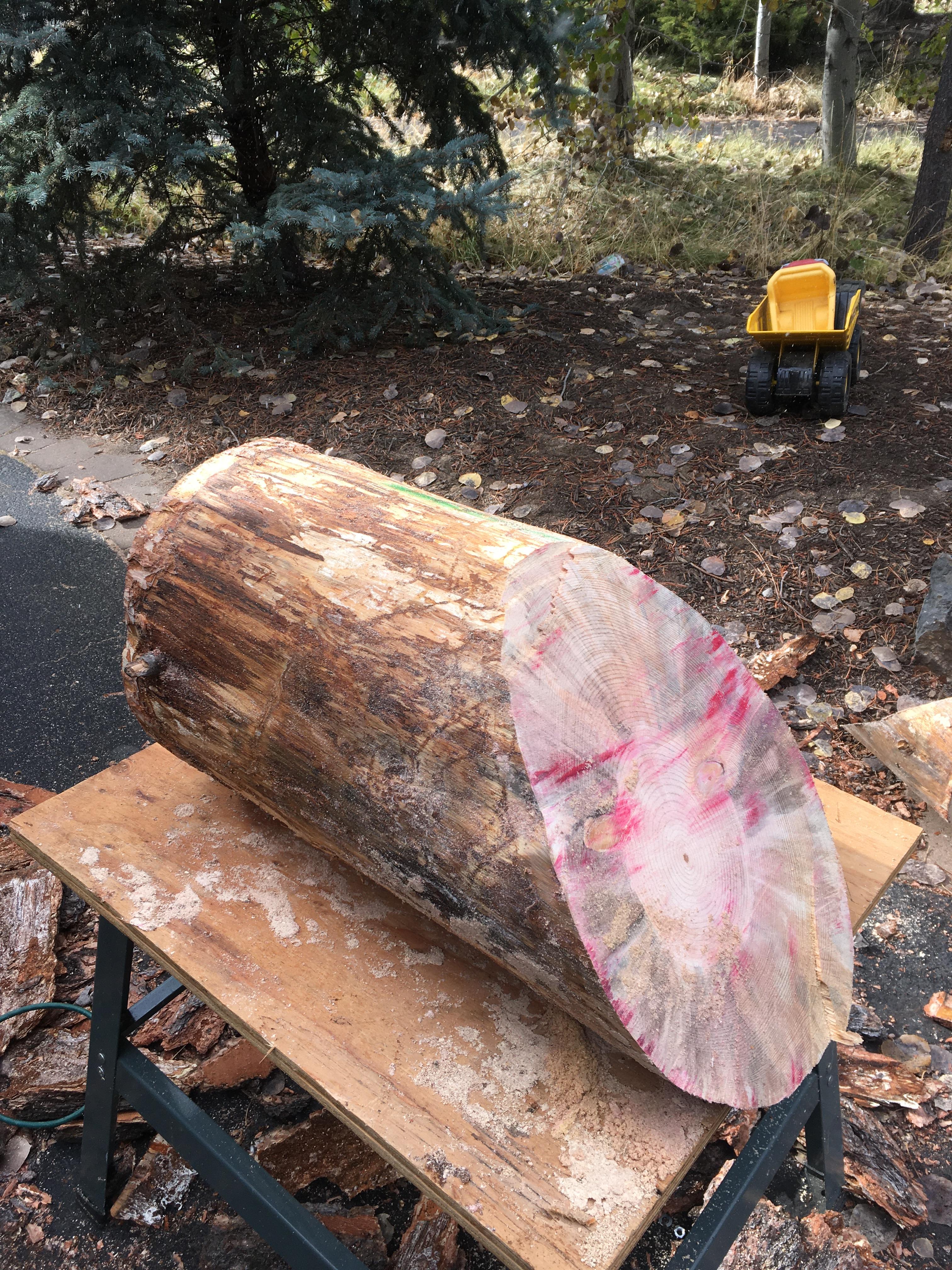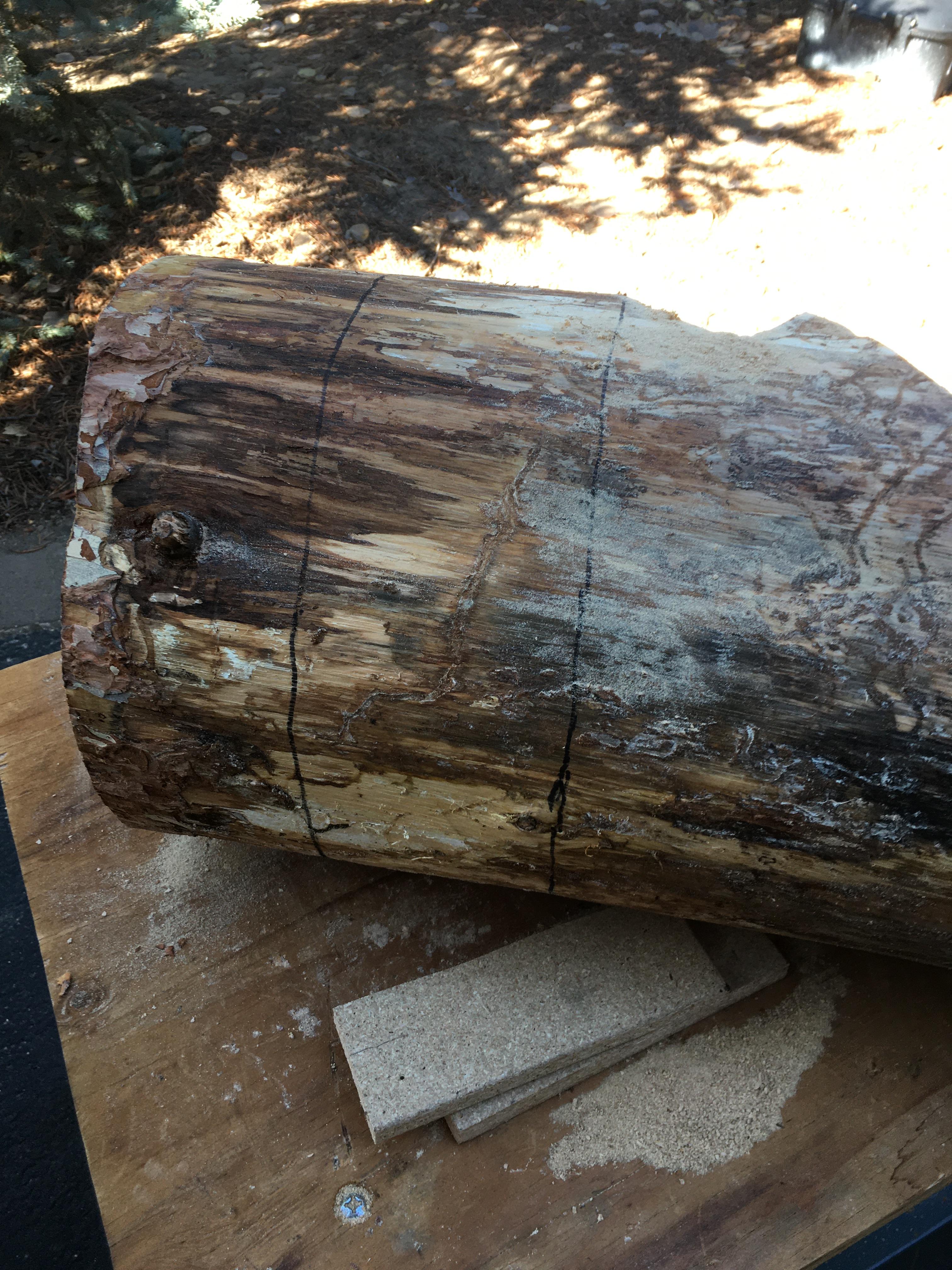 Once stripped, use your angle for mounting on the wall, and apply that angle on the log. A big black sharpie will be to serve as your line. I used a board against the log and looked at it sideways and drew it from that perspective.