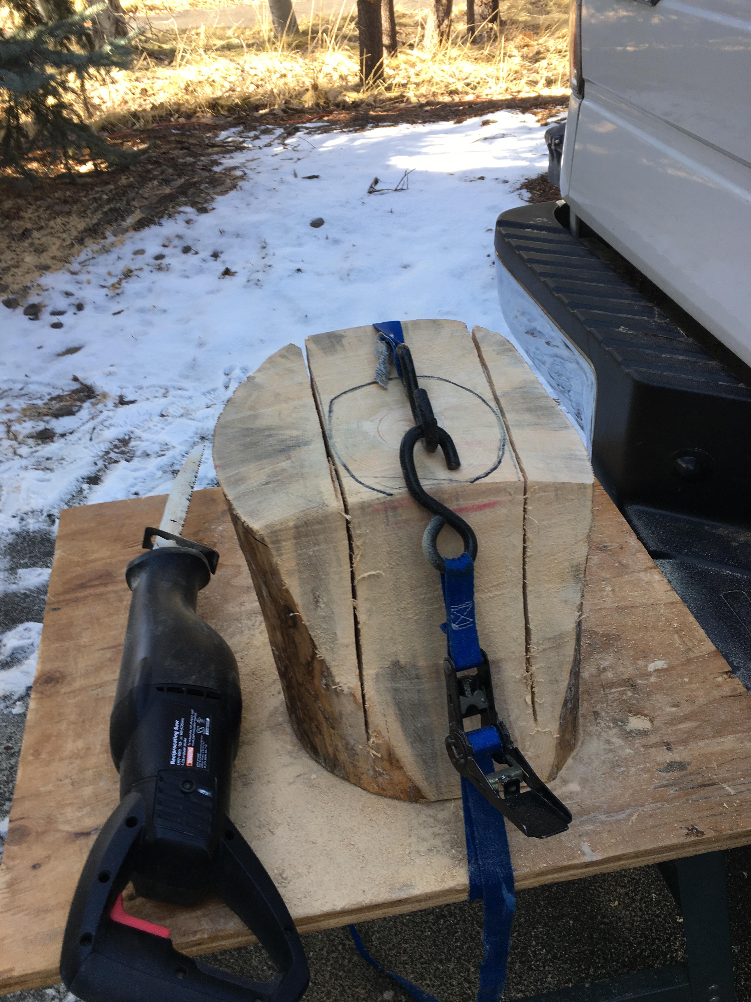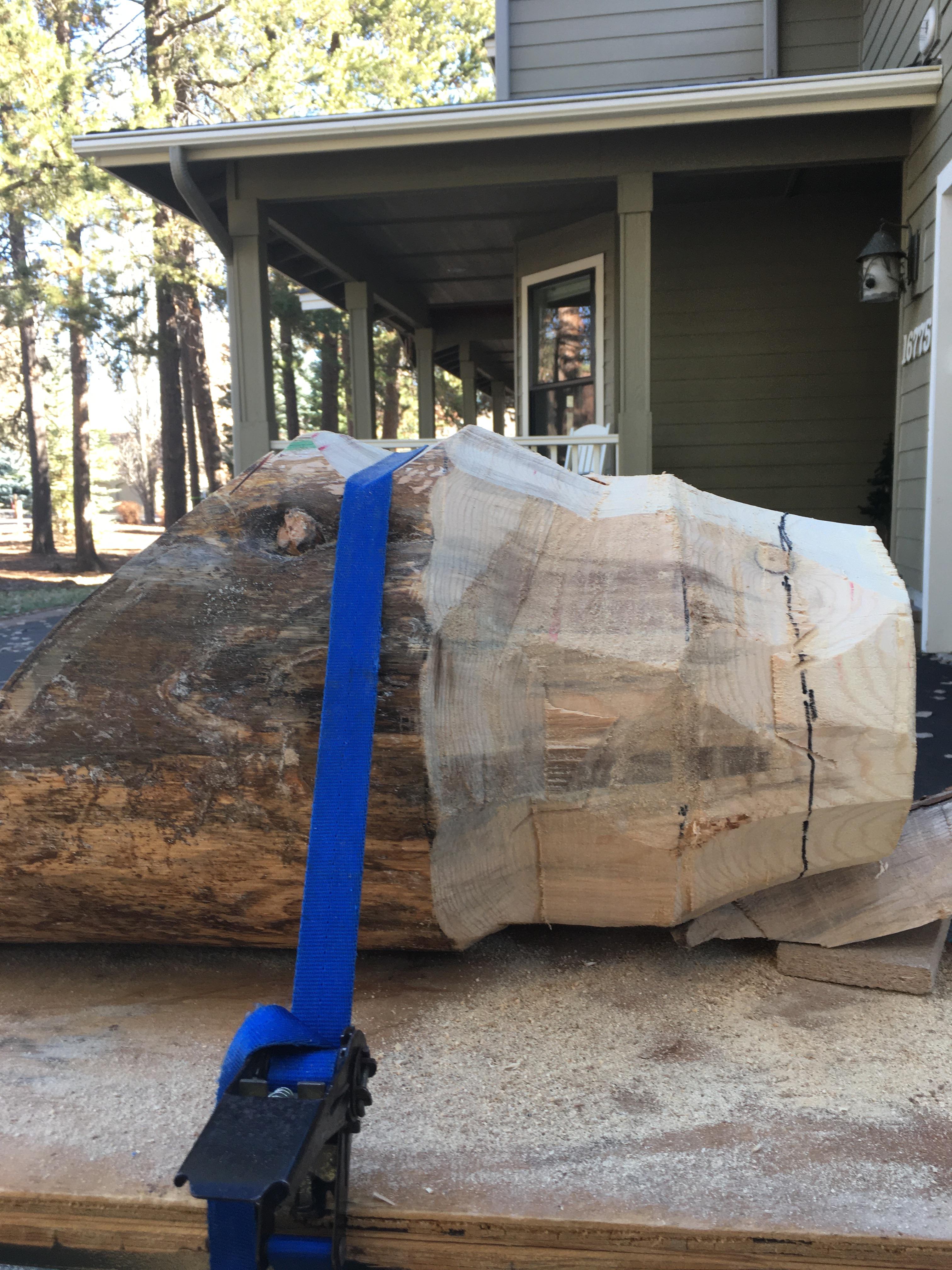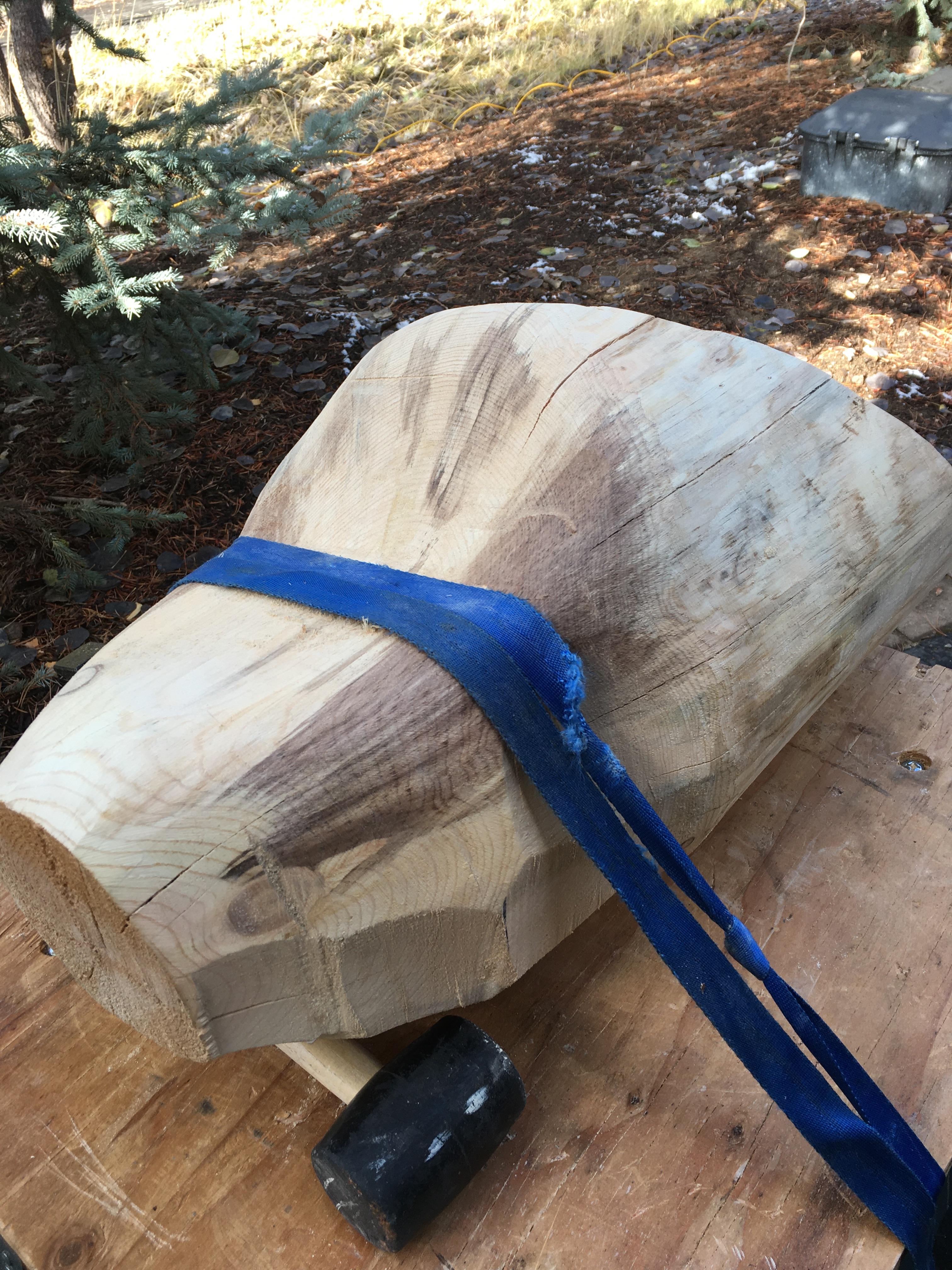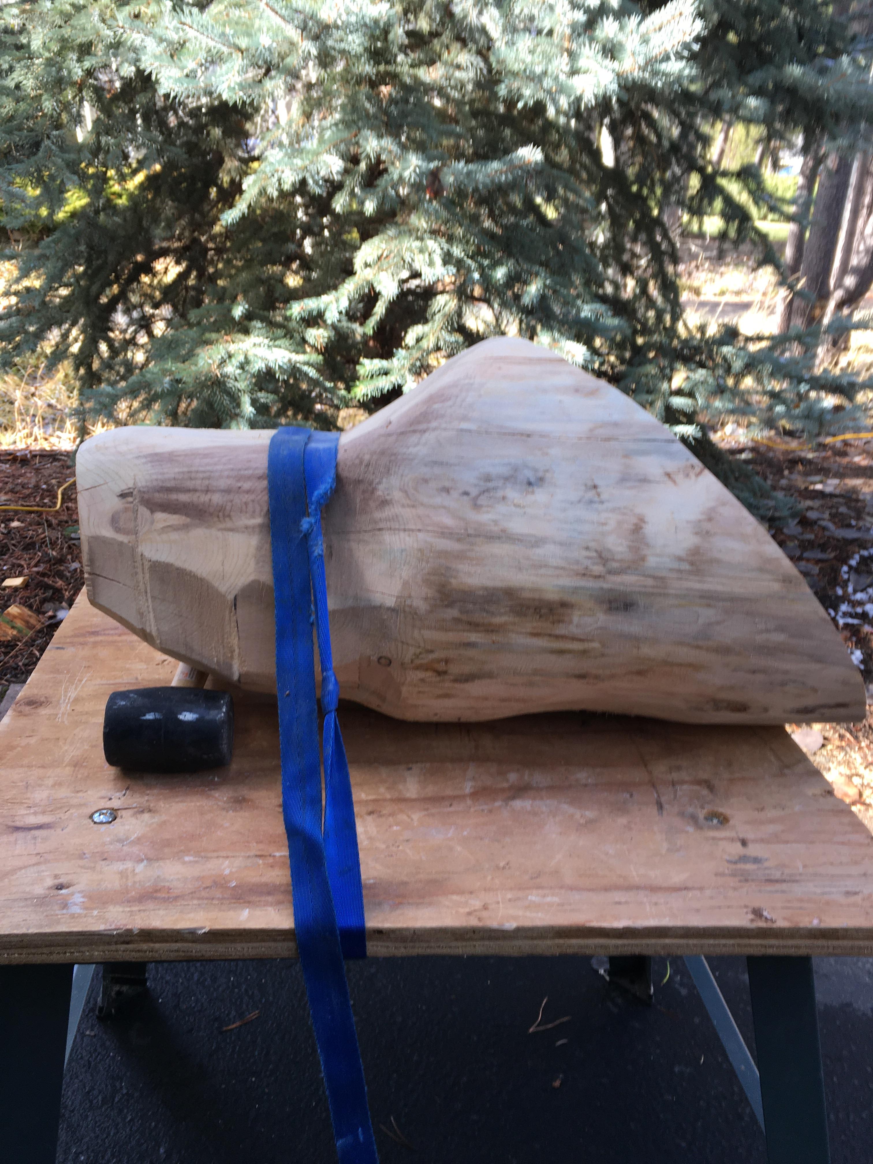 One thing you'll notice as you examine the picture from the front and side: deer heads are surprisingly square and straight lined. This log is smaller than the neck section, and it's about to get a whole lot smaller. So it's somewhat harder to secure while you're cutting away at it.