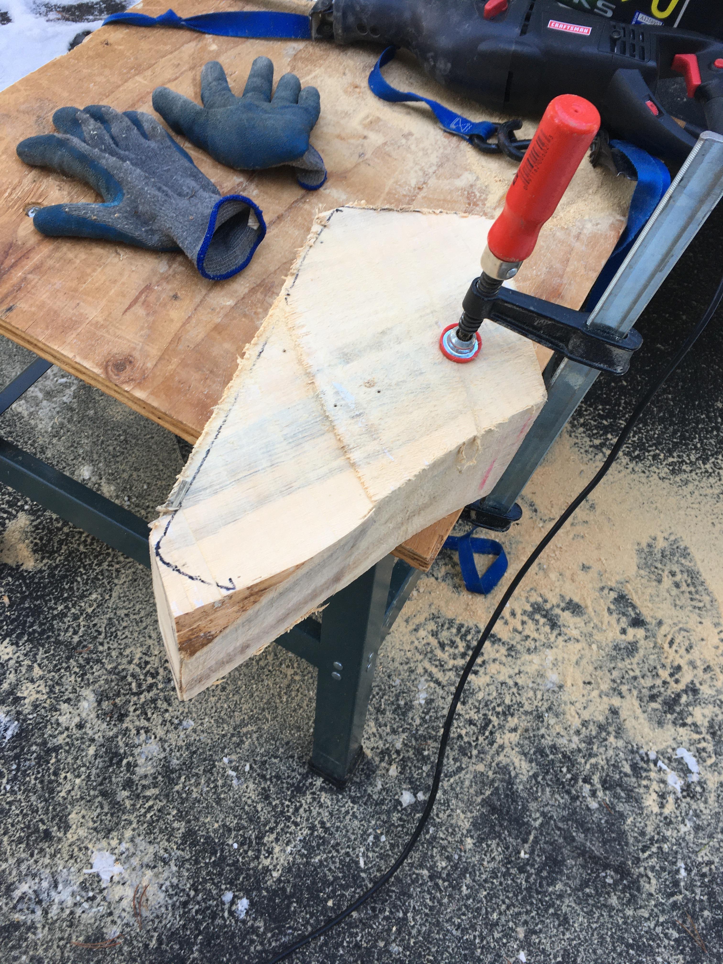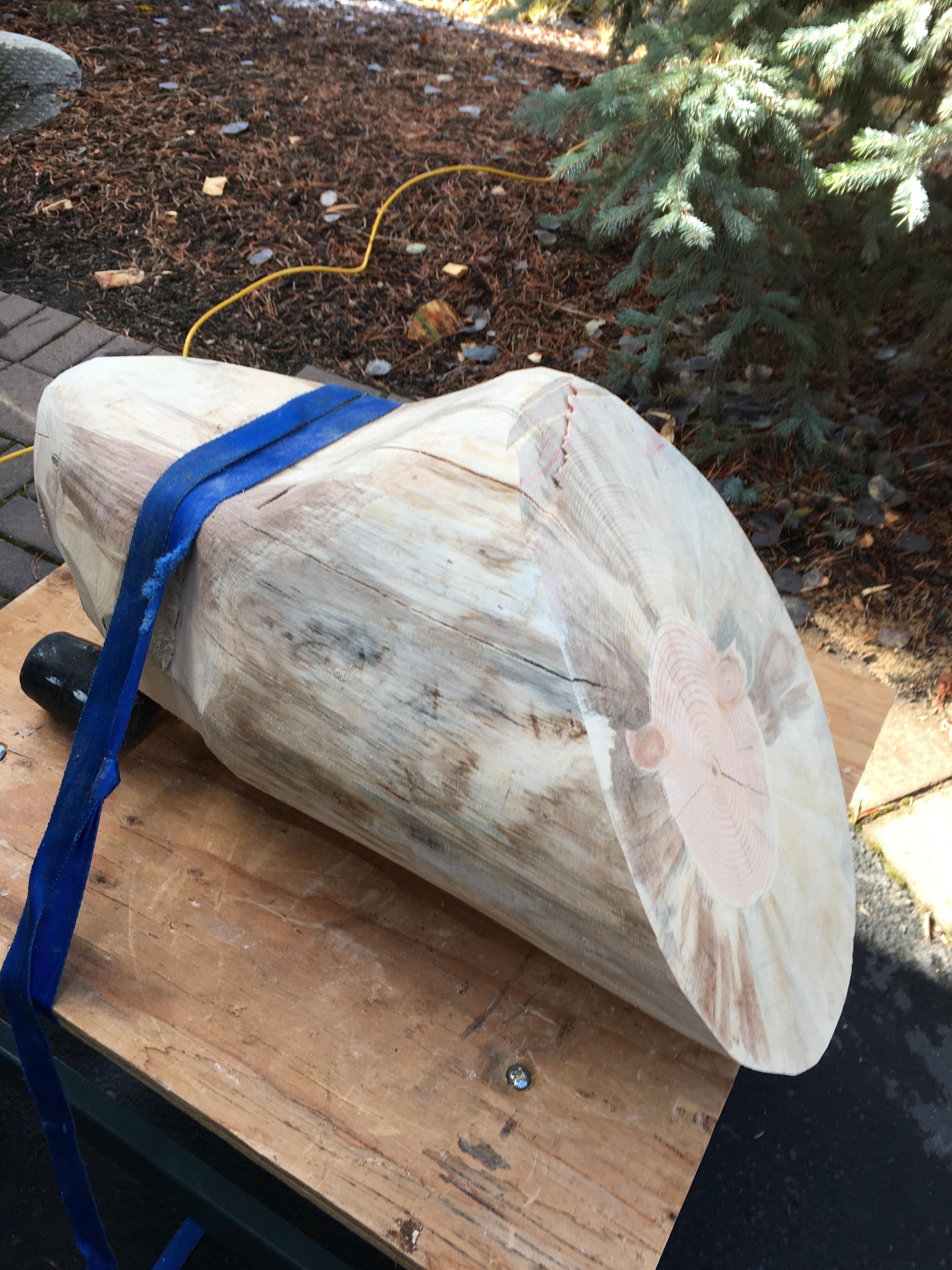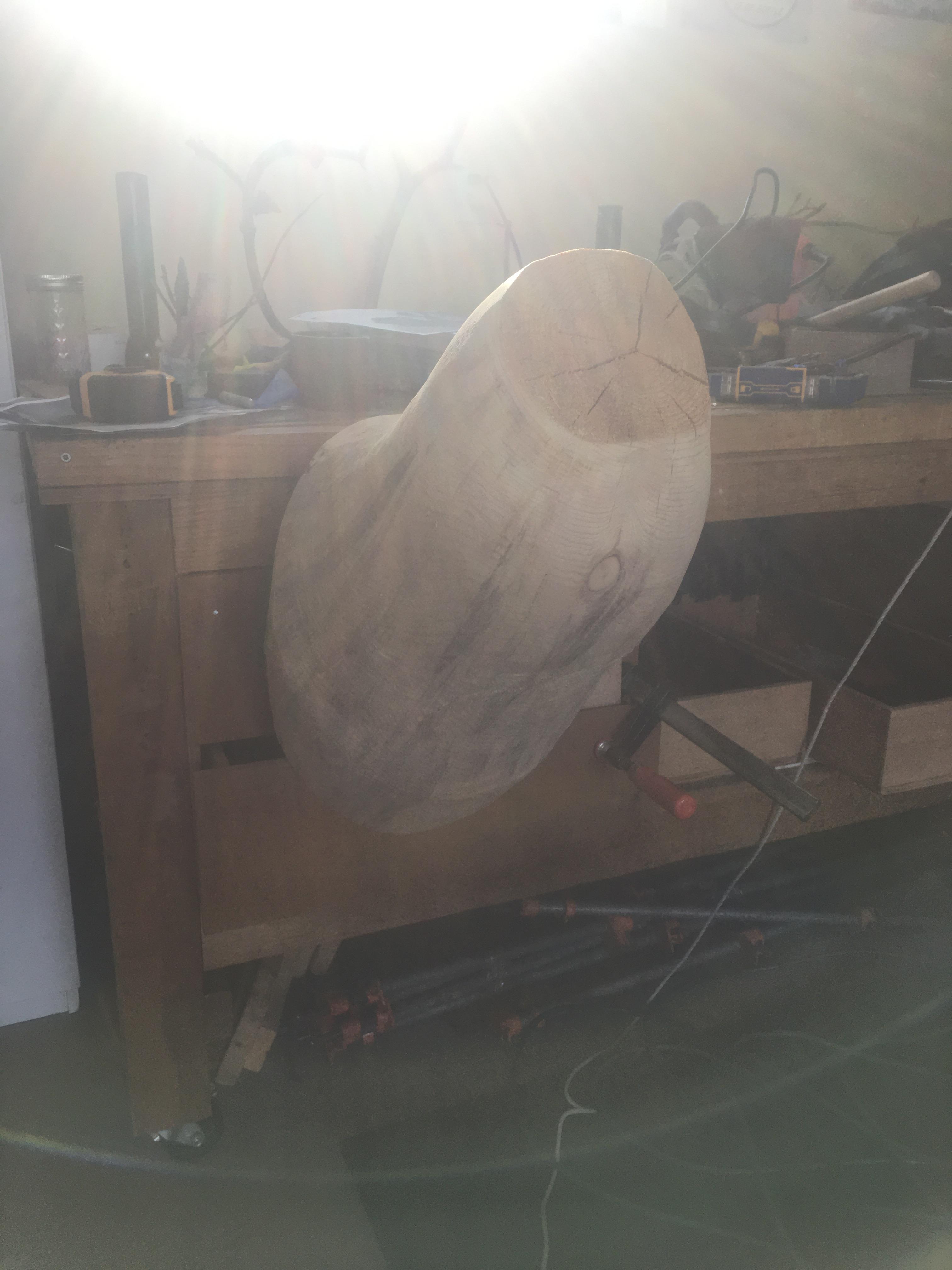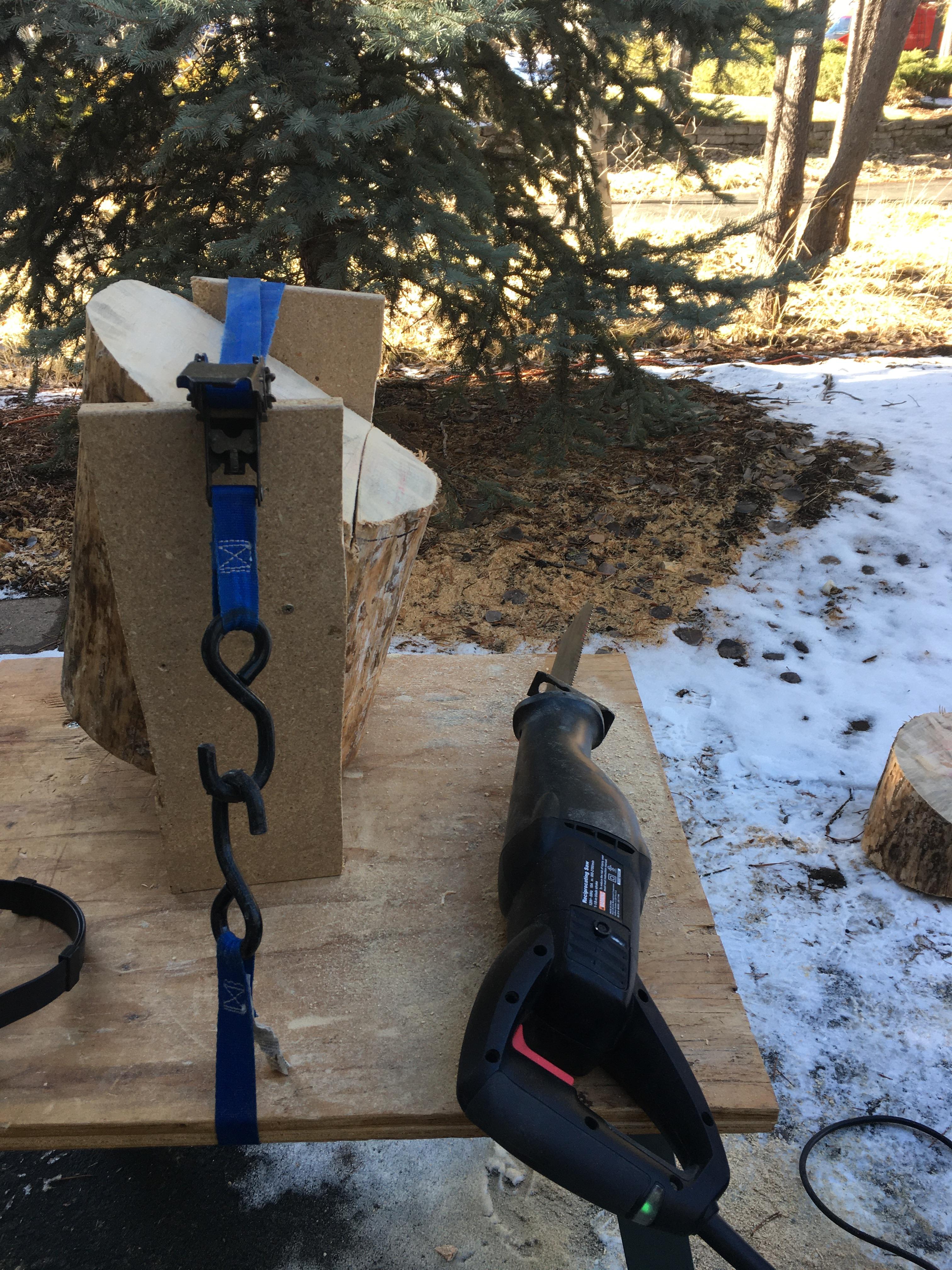 One thing you'll notice as you examine the picture from the front and side: deer heads are surprisingly square and straight lined. This log is smaller than the neck section, and it's about to get a whole lot smaller. So it's somewhat harder to secure while you're cutting away at it.
