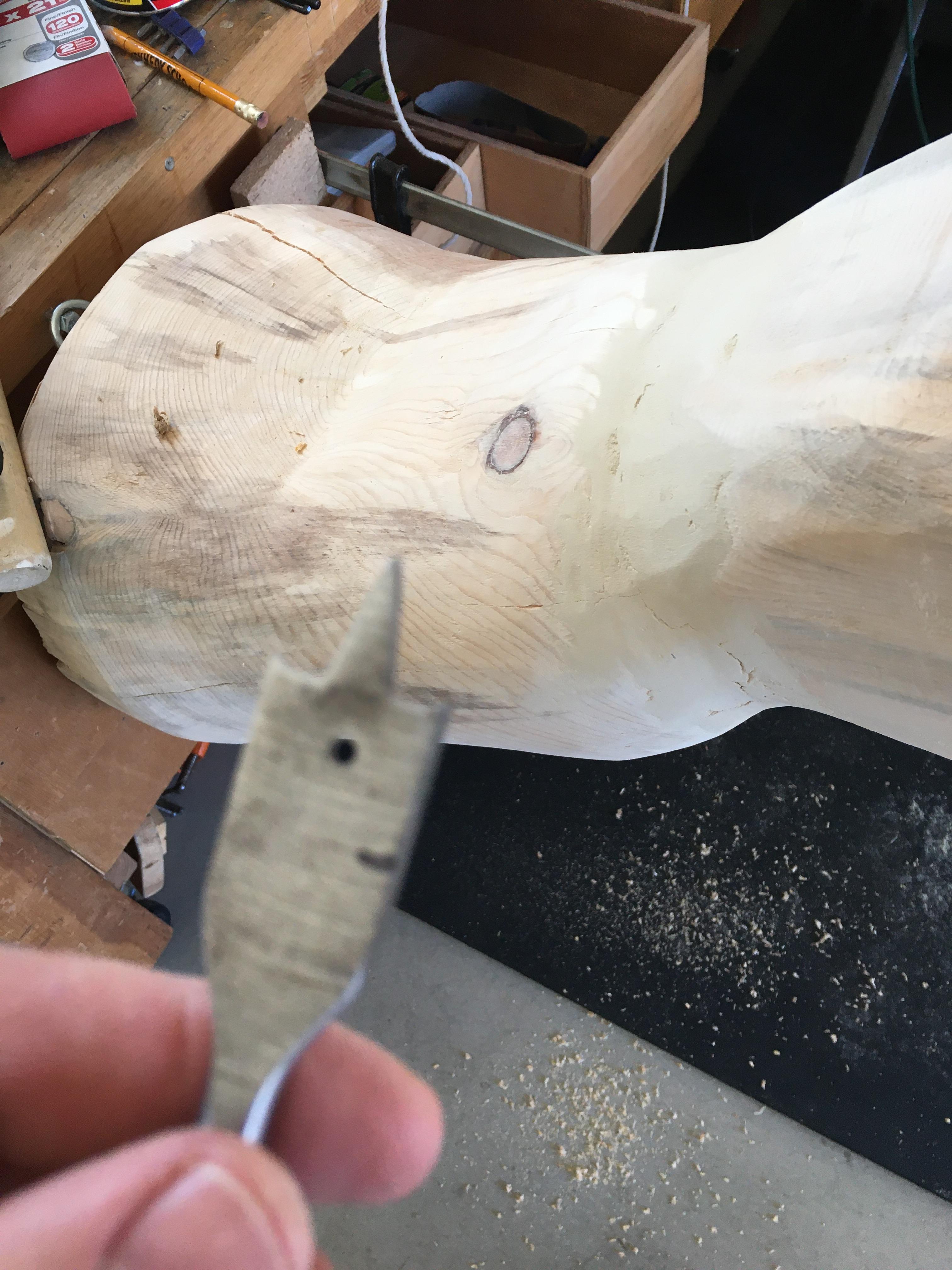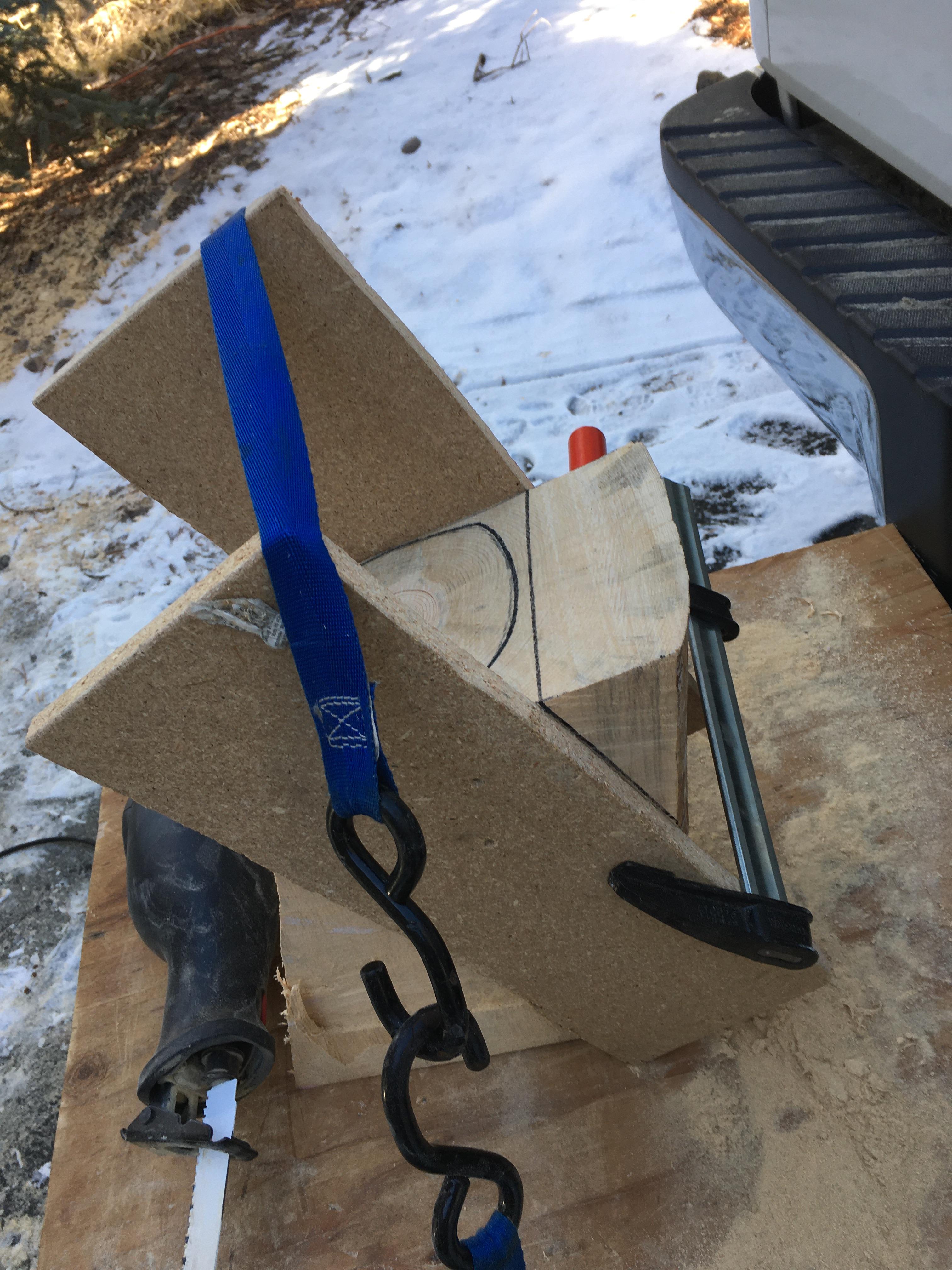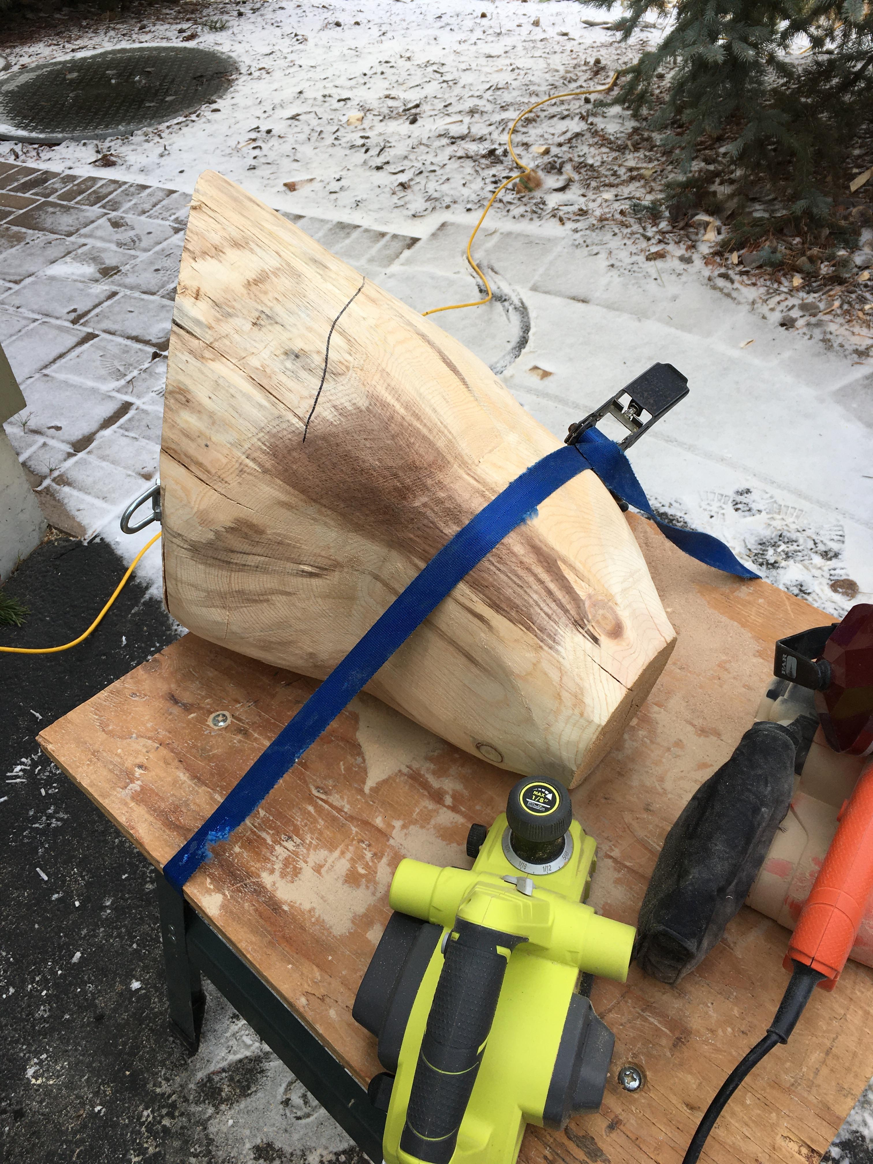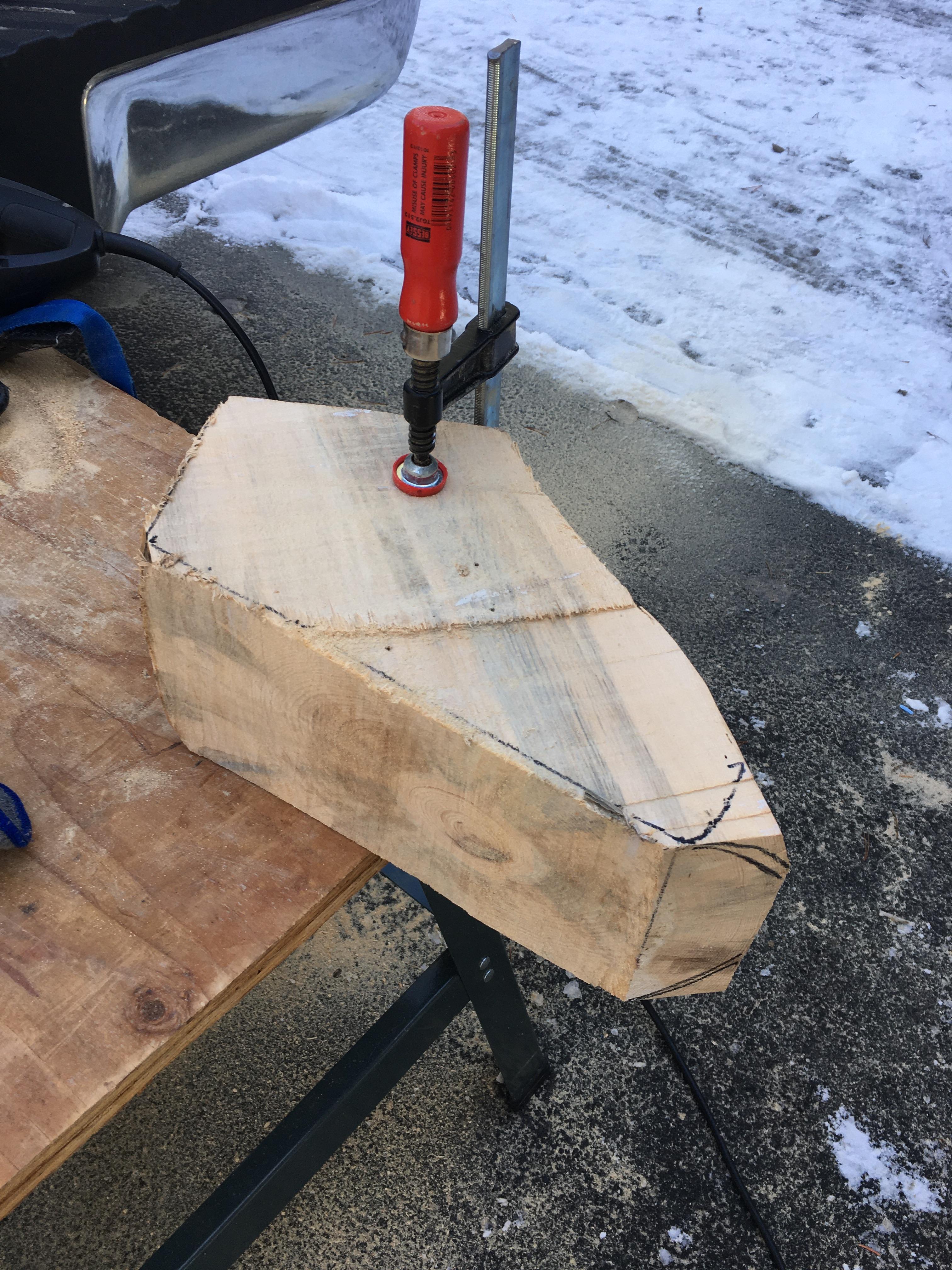 One thing you'll notice as you examine the picture from the front and side: deer heads are surprisingly square and straight lined. This log is smaller than the neck section, and it's about to get a whole lot smaller. So it's somewhat harder to secure while you're cutting away at it.