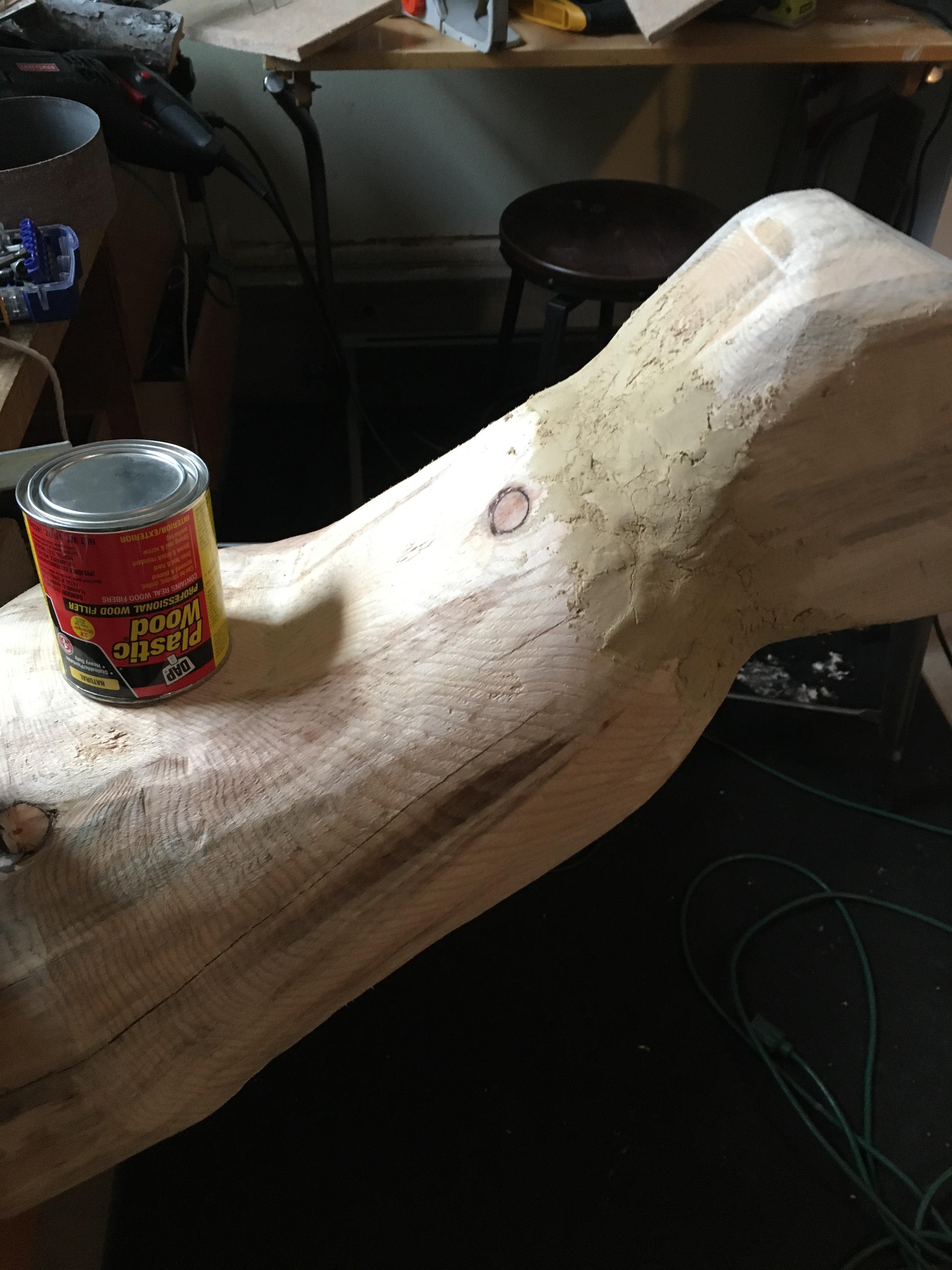 Once your glue has dried, use plastic wood to smooth in the head with the neck. It dries pretty quick, but I waited overnight to ensure it dried all the way through since you use quite a bit. Once it's dry, give it a quick sanding.