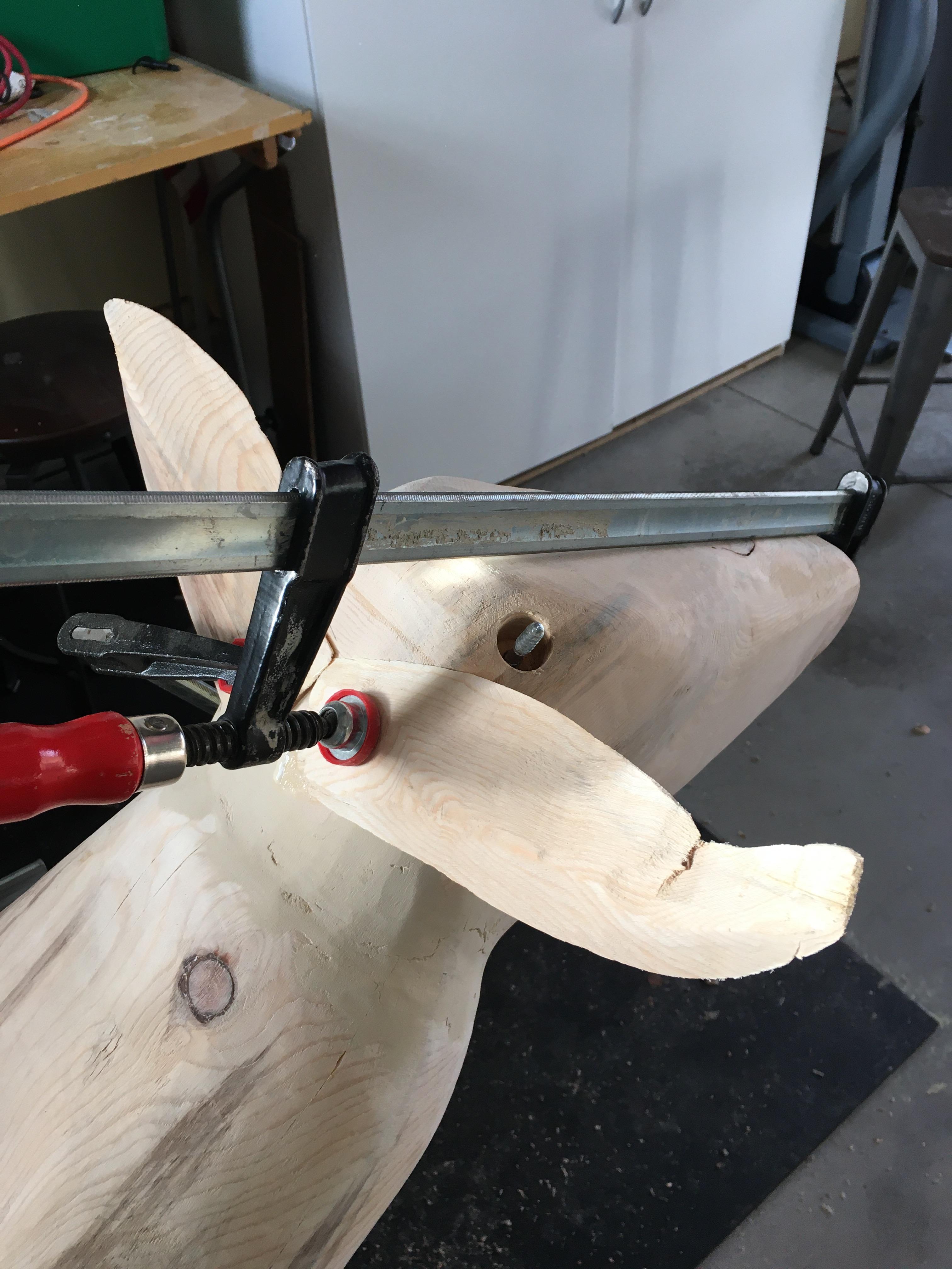 Now, take your deer ears from when you were whittling the neck and sand them into ear shapes. You can simply glue and clamp them to the back of the head, just below the antlers. Reference your photos for the right angle. Leave overnight.